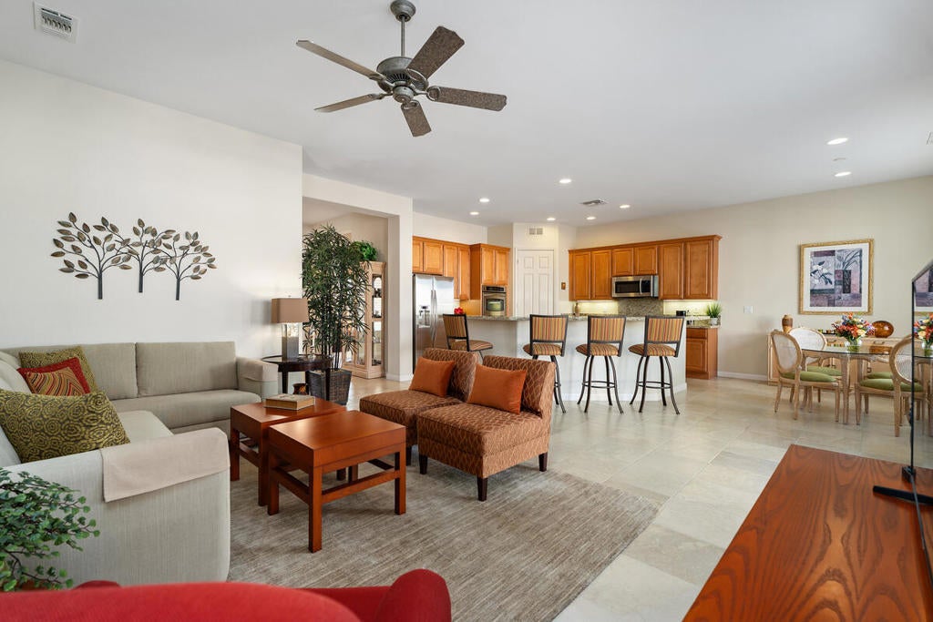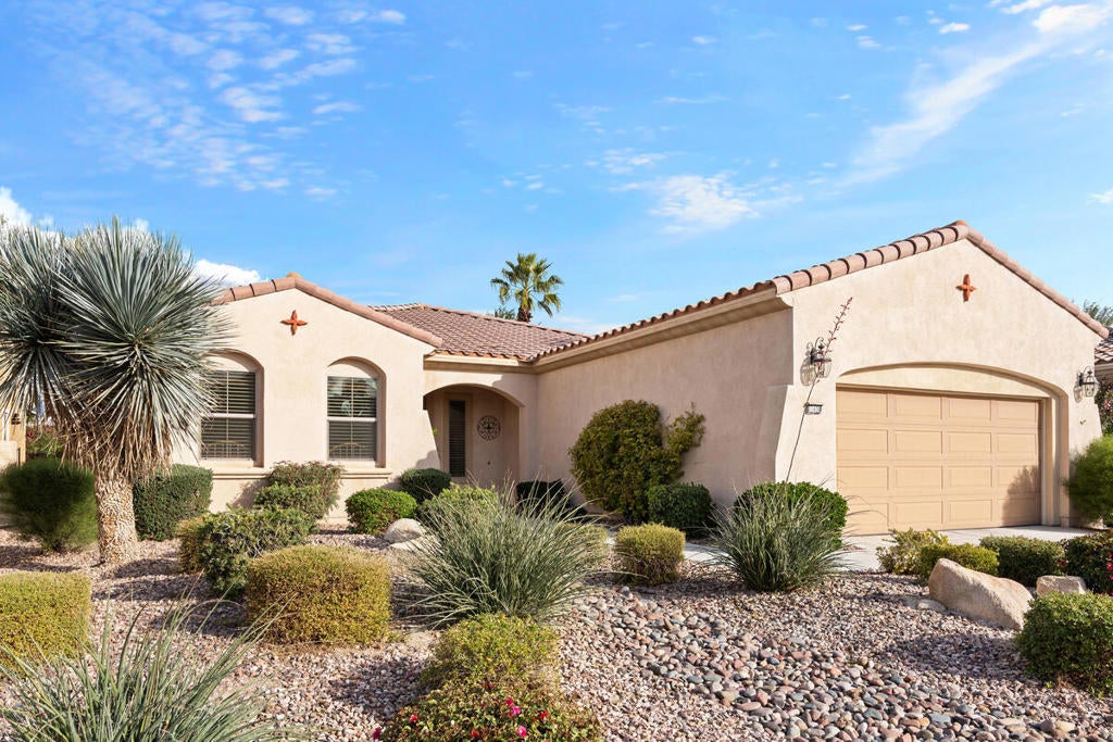 Serene and private best describe this beautifully maintained residence, ideally positioned on a quiet street within Sun City Shadow Hills. This pristine Avalino model has been meticulously cared for by its original owner and offers 1,763 square feet of thoughtfully designed living space. The home features two bedrooms, two bathrooms, and a versatile den or office--well suited for a primary residence or a seasonal retreat.The kitchen is equipped with stainless steel appliances, a walk-in pantry, and an expansive serving bar, making it both functional and inviting for entertaining. Situated on a generous north-facing lot, the backyard is designed for enjoyment and privacy, complete with a grand Alumawood pergola, soothing fountain, and ample space for outdoor gatherings. Low-maintenance landscaping and high perimeter walls create a tranquil setting that feels entirely your own. Sun City Shadow Hills is a popular 55+ active adult community celebrated for its friendly vibe and outstanding resort-style facilities. Residents have access to two spacious clubhouses with modern fitness centers, both indoor and outdoor pools, relaxing spas, and a diverse schedule of classes and events. The community features two meticulously maintained championship golf courses, as well as courts for tennis and pickleball. There are numerous social clubs that cater to many interests--including arts and crafts, travel, and dining. Recreational options also include bocce, billiards, and over 50 different social clubs. This home presents a unique chance to experience comfortable desert living and is definitely worth seeing in person.