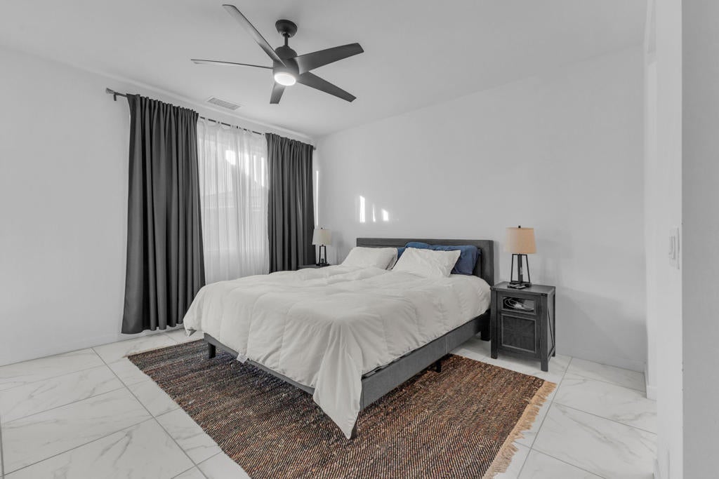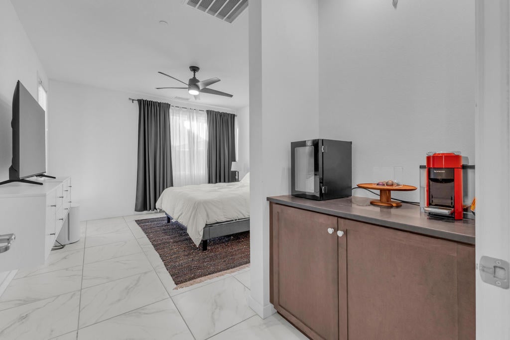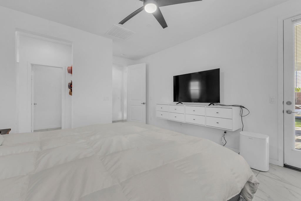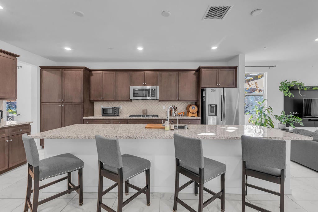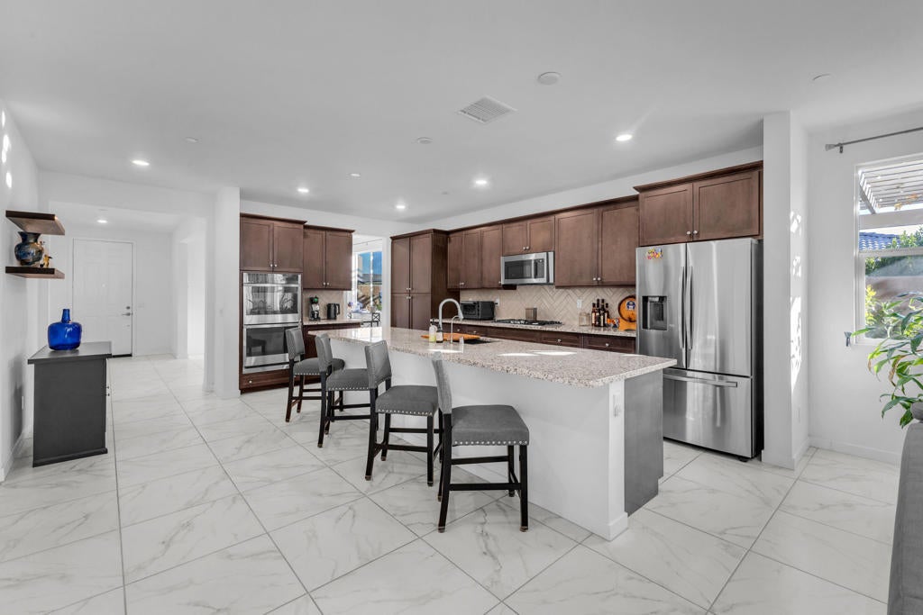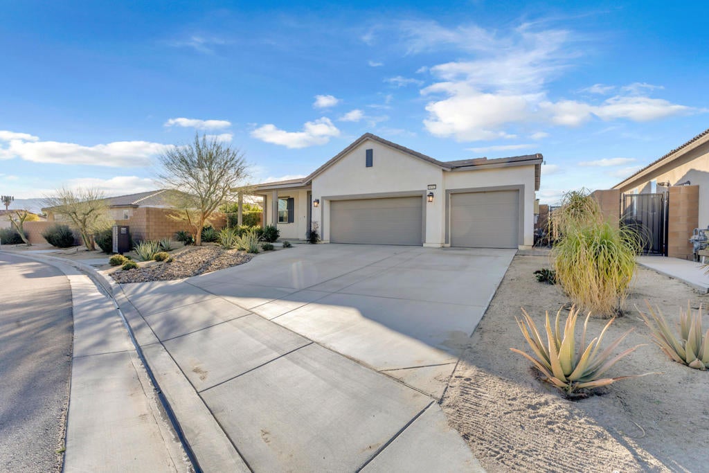 Welcome to this beautifully handcrafted home featuring upgrades throughout and a true garden oasis in the heart of the desert. Offered fully furnished--everything you see stays; along with FULLY PAID SOLAR for enhanced efficiency and long-term savings, a NEW WHOLE-HOME WATER SOFTENING SYSTEM, and a spotless-water garage faucet ideal for vehicle care without residue. Step inside through an expansive entryway that flows into a formal dining room ideal for gatherings. The chef's kitchen serves as the centerpiece of the home, showcasing a large statement island, upgraded countertops, custom cabinetry, and a designer backsplash--all opening gracefully to the family room for effortless hosting and everyday luxury. Upgraded flooring enhances the home's cohesive and sophisticated look.The private primary suite is thoughtfully separated from the guest bedrooms and features a generous walk-in closet, spa-inspired bath, and direct access to the outdoor living space.Step outside to a fully reimagined backyard sanctuary, featuring a curated garden side yard with rich, fertile soil ready for cultivation. The property includes nine fruit trees--orange, lime, olive, mango, tangerine, and lemon--along with raspberry and blackberry bushes, productive grapevines, and thriving greens. Six custom planting containers offer additional flexibility for personalized gardening.This home has been meticulously cared for and reflects true pride of ownership. Homes offering this level of quality, craftsmanship, and thoughtful renovation are rarely available--an exceptional opportunity.