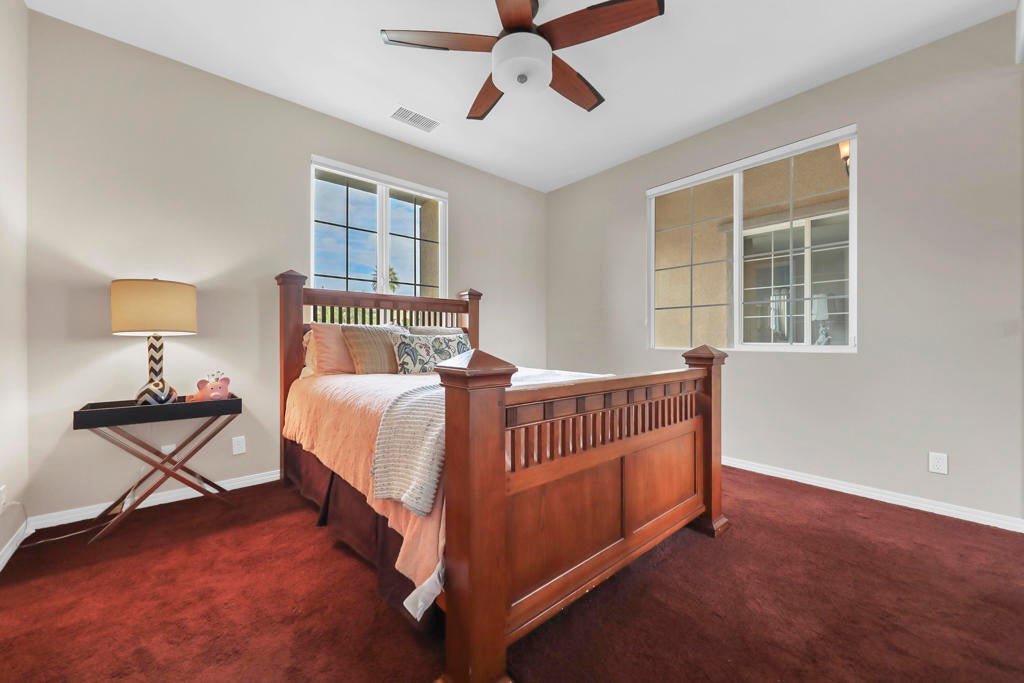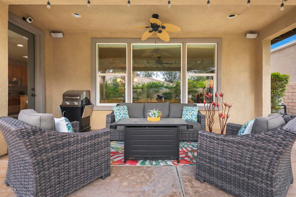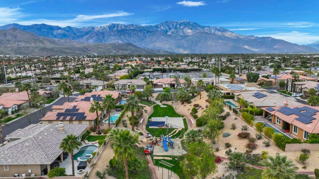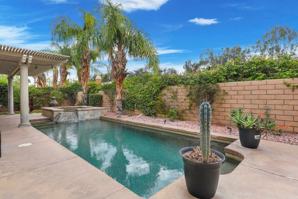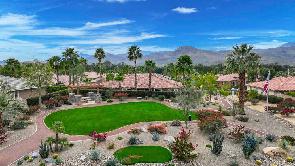 Proudly maintained by the original owner and offered turnkey furnished, this well-appointed home delivers comfort with thoughtful functionality. This flowing floor plan supports everyday living and entertaining, anchored by a formal dining room and a spacious kitchen that opens directly to the main living area. The kitchen is outfitted with abundant cabinetry featuring pull-out shelving, stainless steel appliances, an oversized island, and a sunny breakfast nook. The living room is complimented by a glass-tiled fireplace and a fully equipped wet bar with a sink, wine rack, and custom cabinetry, seamlessly connecting the kitchen and living spaces. The primary suite is generously sized and features dual vanities, two walk-in closets, a soaking tub, and a large walk-in shower with bench seating. Two secondary bedrooms share a Jack-and-Jill bathroom, while the additional bedroom enjoys its own private en suite. Outdoor living is equally inviting, with mature landscaping creating a private retreat. The backyard includes a PebbleTec saltwater pool and spa, misting system, extended alumawood patio cover, plenty of seating areas, and mature lemon, orange, and lime trees ideal for both relaxation and entertaining. Additional highlights include updated dual HVAC systems, new hot water heater, surround sound throughout, Vivint security system with cameras, laundry room with utility sink, and an epoxied garage floor. Located within the gated community of Mission Shores, residents enjoy scenic lake and mountain views, complemented by close proximity to premier desert amenities. The HOA provides front yard landscaping, cable and WiFi, lake access, a community park with playground and basketball court, and well-maintained common areas. Ideal as a primary residence, second home, or desert getaway, this property offers both comfort and convenience.