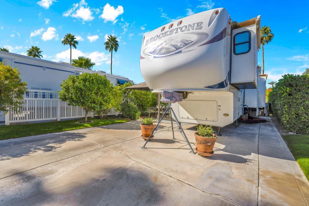 This delightful resort property truly presents a fantastic opportunity. It's perfectly situated on a charming, quiet street, offering a tucked-away feel that's both private and peaceful. Walking distance to La Palma Clubhouse, placing all its amenities and social activities just moments away. Close proximity to the resort's main entrance ensures exceptionally smooth and convenient access for all your comings and goings. One side of the lot features a white fencing providing a lovely backdrop and potential for climbing vines. The mature landscaping is beautifully contained within sturdy brick planters, offering a wonderful selection of trees including an olive tree, alongside three citrus trees - a grapefruit, an orange, and a lime . Adding a splash of color and delightful fragrance, three flowering trees complete this property. This outdoor space comes fully equipped for relaxation and entertaining. An aluminum gazebo is already in place, offering both fabric shades for sun protection and integrated screens for comfortable, bug-free enjoyment throughout the day and evening. Adjacent to this inviting space, a dining table with four chairs awaits al fresco meals and gatherings. A high-quality 4-burner gas grill is included, perfect for preparing delicious outdoor meals. To help maintain a tidy and organized space, two convenient storage boxes are provided, ideal for cushions or outdoor essentials. Lastly, three charming terracotta flower pots are ready for your personal touch, whether with vibrant seasonal blooms or fragrant herbs.
