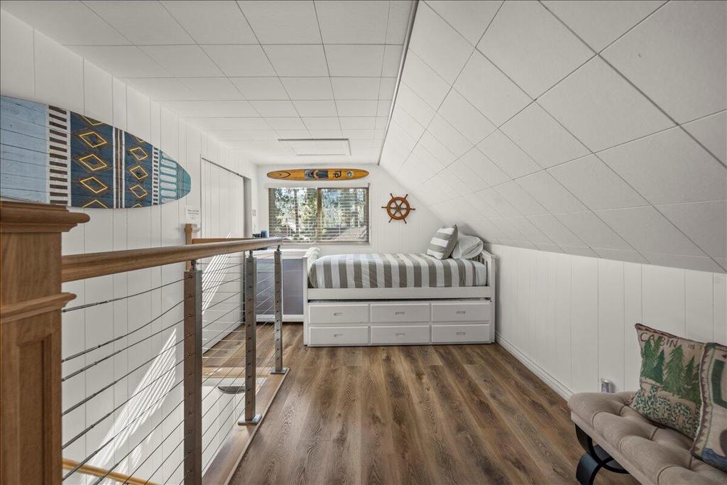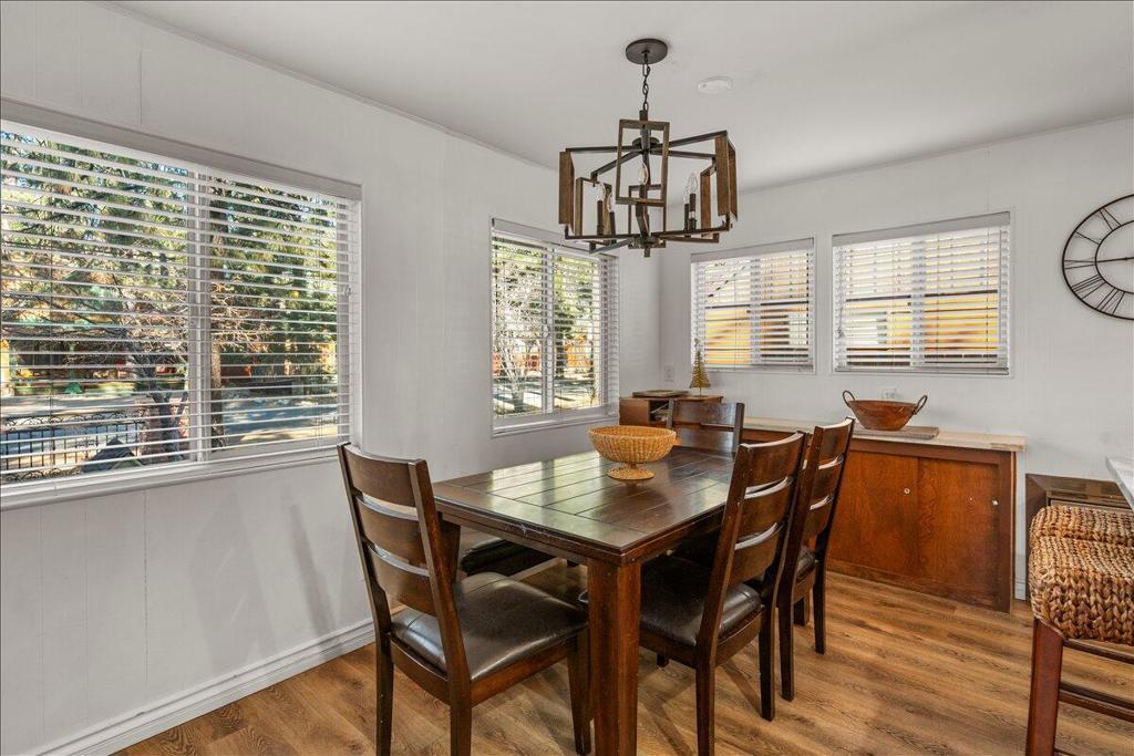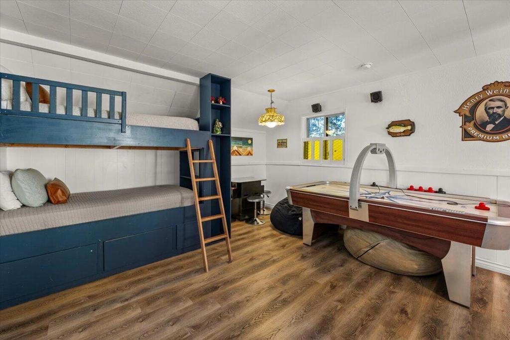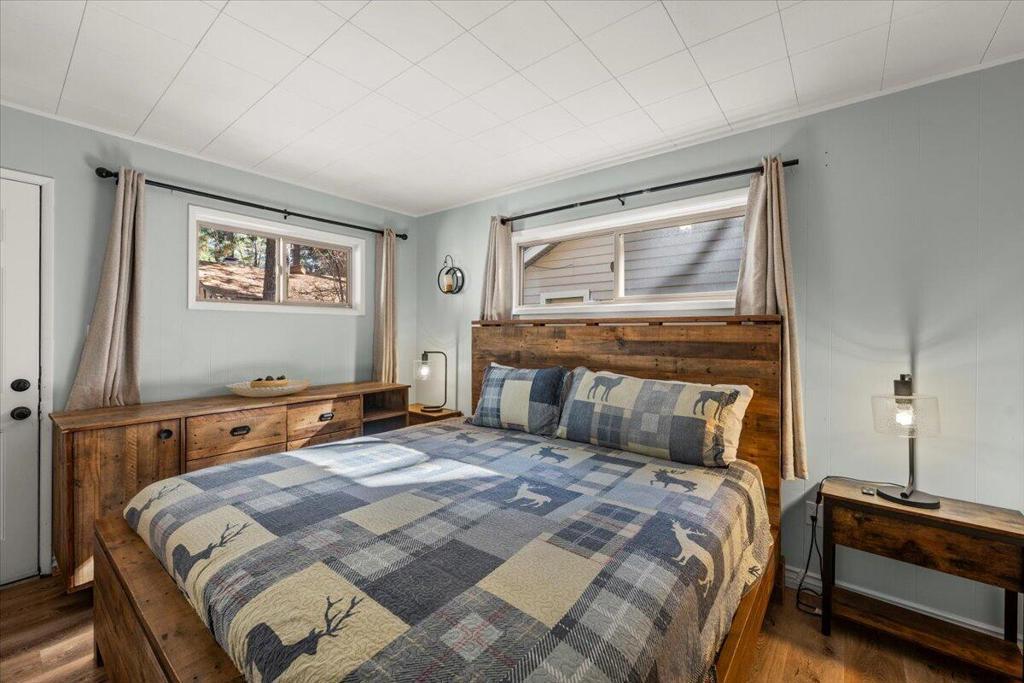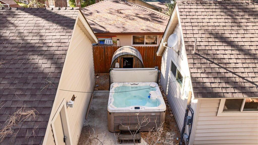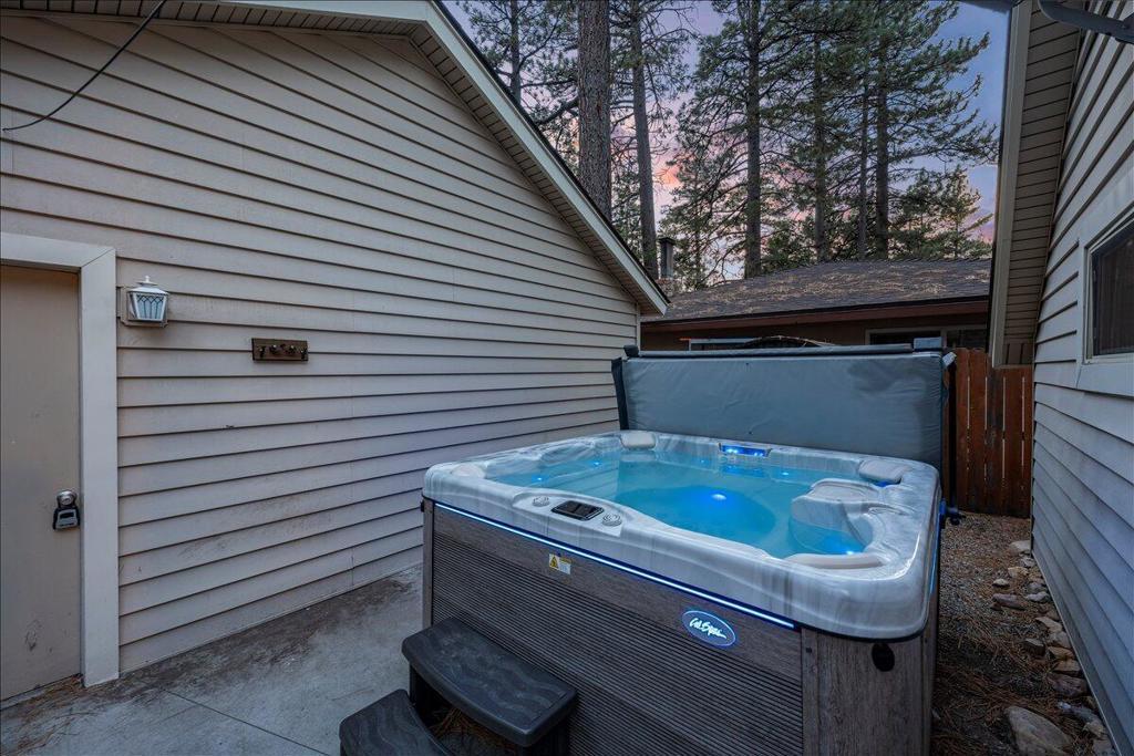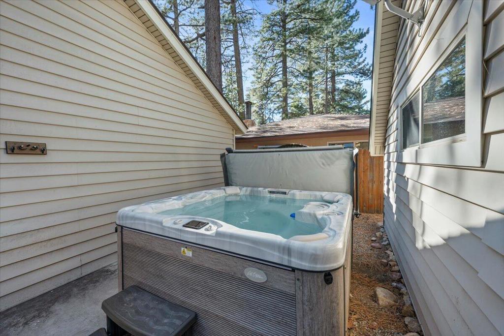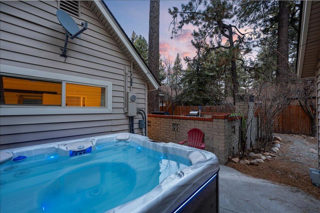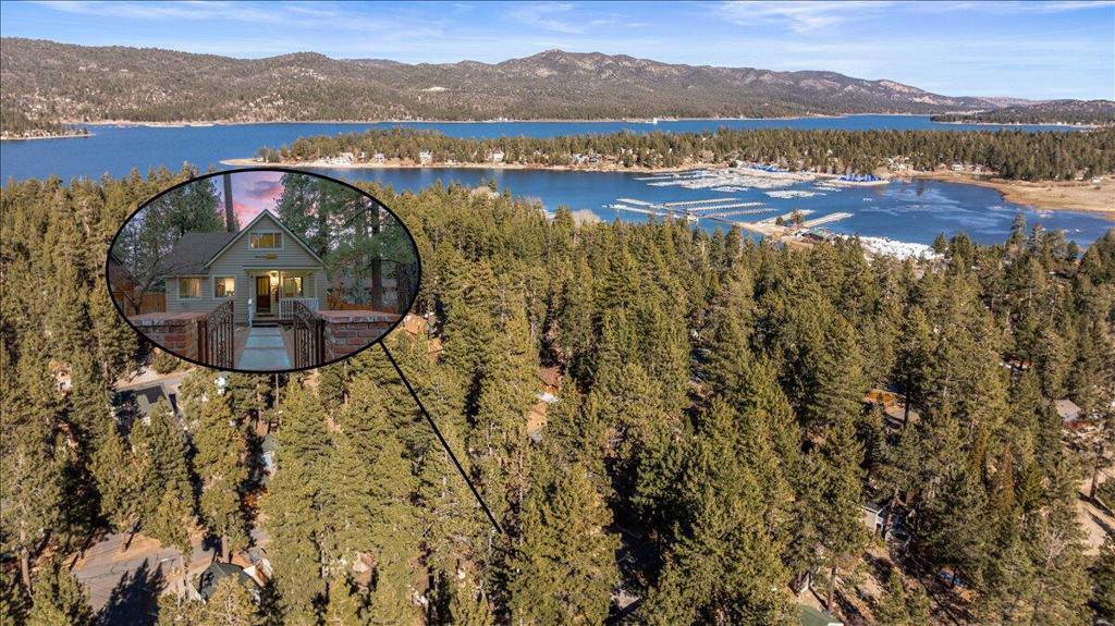 Welcome to this enchanting 1930s retreat in the coveted Boulder Bay neighborhood of Big Bear Lake, CA--expertly blending vintage charm with contemporary luxury after a full studs-out remodel in 2022. Situated on a unique street-to-street lot with a convenient two-car garage, this home is ideally positioned just moments from the sparkling lake, vibrant village shops and dining, and world-class ski resorts, offering the ultimate mountain lifestyle. Step through the inviting front entrance, framed by timeless brick posts and wrought iron railings, into a space that's fully furnished with tasteful, high-quality pieces ready for immediate enjoyment. Durable synthetic siding ensures low-maintenanceappeal, while new vinyl double-pane windows bathe the interior in natural light. The open layoutfeatures elegant laminate and tile floors, leading to a cozy living room anchored by a wood-burningstove--perfect for crisp evenings. The expansive chef's kitchen is a highlight, boasting new counters,custom cabinets, a chic tile backsplash, and premium high-end appliances for effortless entertaining.Both bathrooms have been thoughtfully updated with fresh tile showers and modern vanities,complemented by a tankless water heater for efficiency and a dedicated laundry area with stackablewasher/dryer. Venture outdoors to your private oasis: a spacious concrete patio designed for year-round gatherings, complete with a welcoming firepit, luxurious brand new jacuzzi, and rejuvenating sauna.Whether you're hosting friends or unwinding in solitude, this property captures the essence of BigBear's natural beauty and recreational bliss. Fully turnkey and impeccably updated, it's an exceptionalopportunity for a primary residence, vacation escape, or investment in one of California's most sought-after destinations.