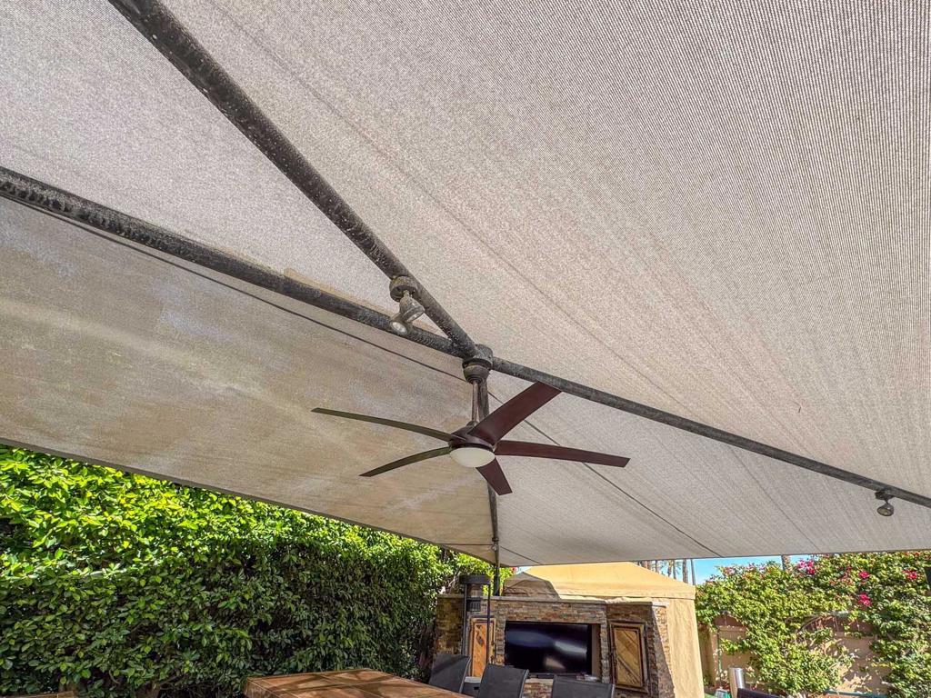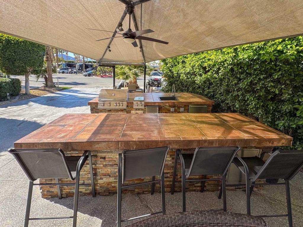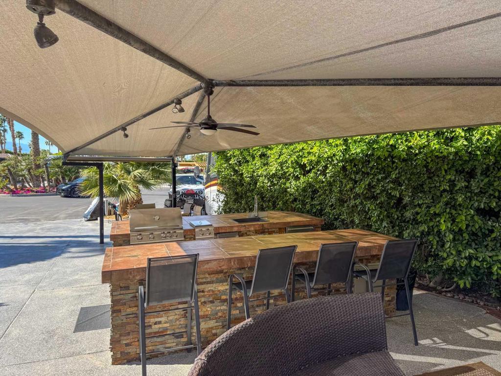 Experience resort-style living with this spacious, pie-shaped luxury RV lot at Outdoor Resort Indio. Offering easy back-in access and lush hedges for privacy, this serene retreat is perfectly positioned for stunning mountain views and breathtaking sunsets.The outdoor kitchen features two large bar tops, a deep sink, dishwasher, oven, ice maker, refrigerator, BBQ, and ample storage, making entertaining effortless. A custom wrap-around entertainment center with a securely enclosed 65' TV, a cozy fireplace, and Sunbrella furnishings create the perfect space for relaxation and gatherings.An expanded backyard includes a grassy area and a concealed storage tent, blending function and style. The epoxy-coated RV pad adds durability to this exceptional lot. Combining privacy, luxury, and unbeatable views, this turnkey property is a rare opportunity at Outdoor Resort Indio!Outdoor Resort Indio is a Class A only RV resort with 18 hole executive golf course