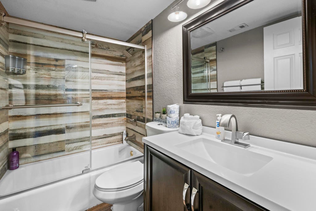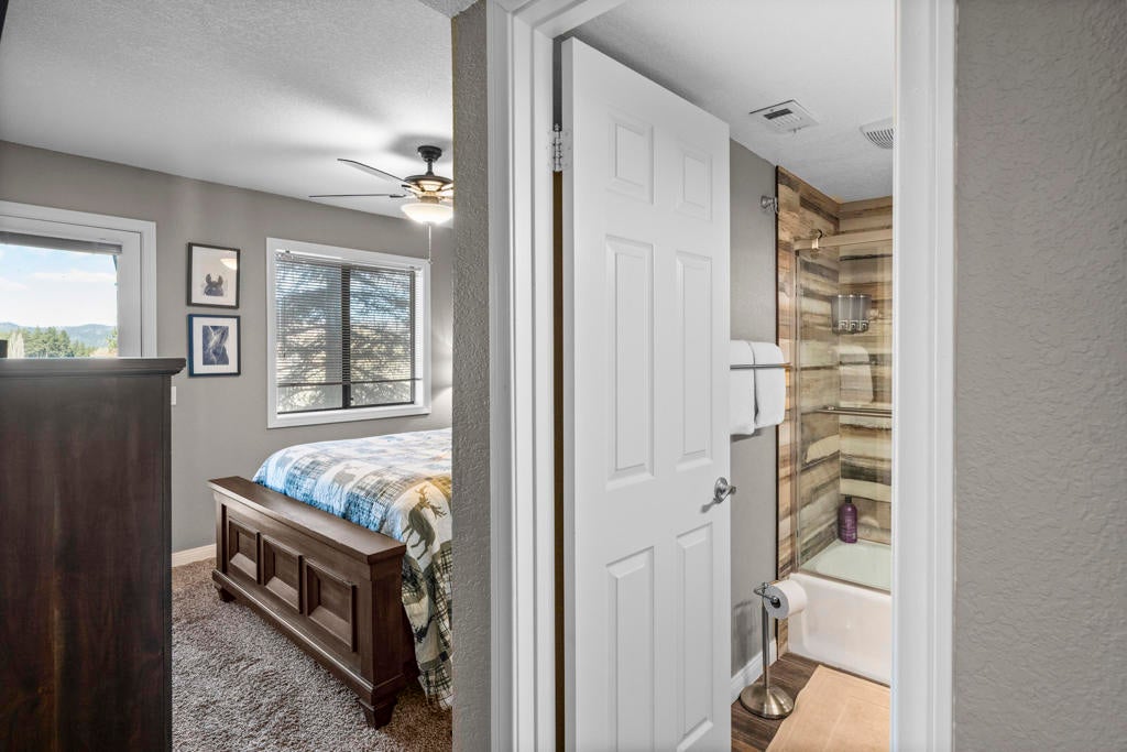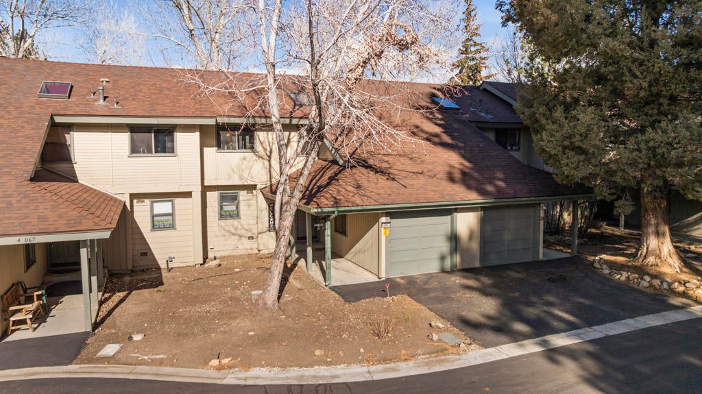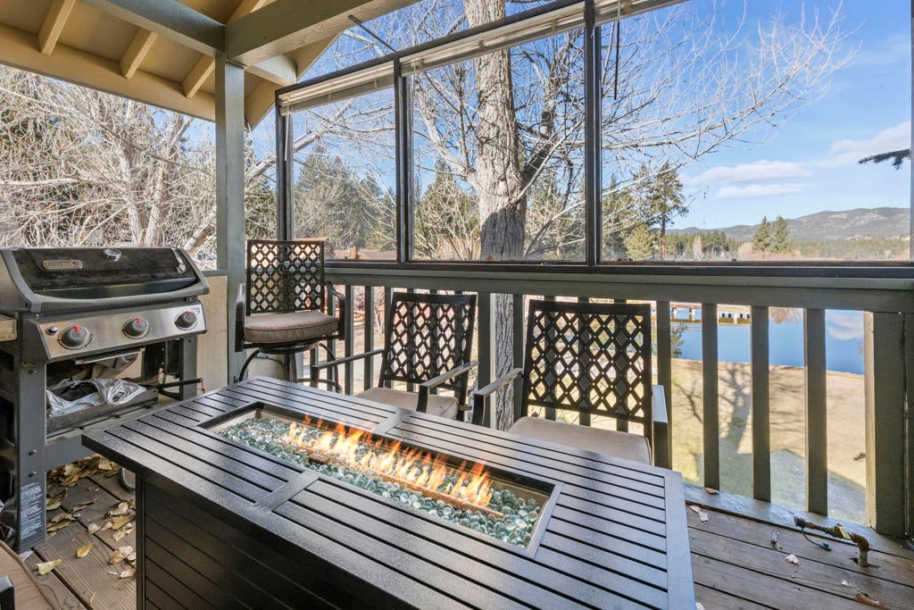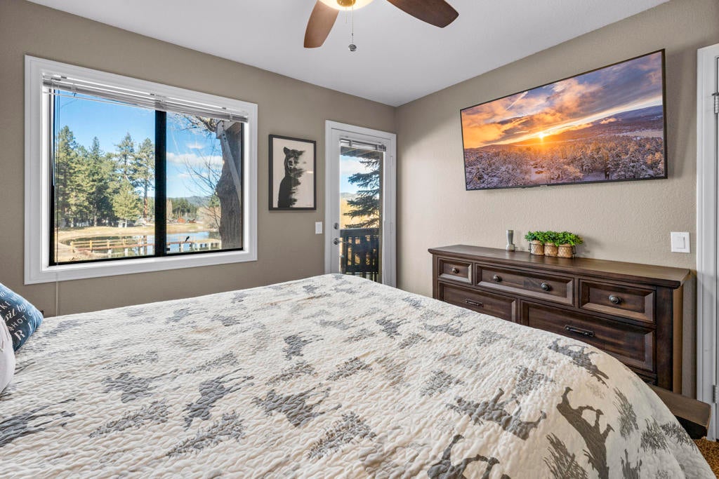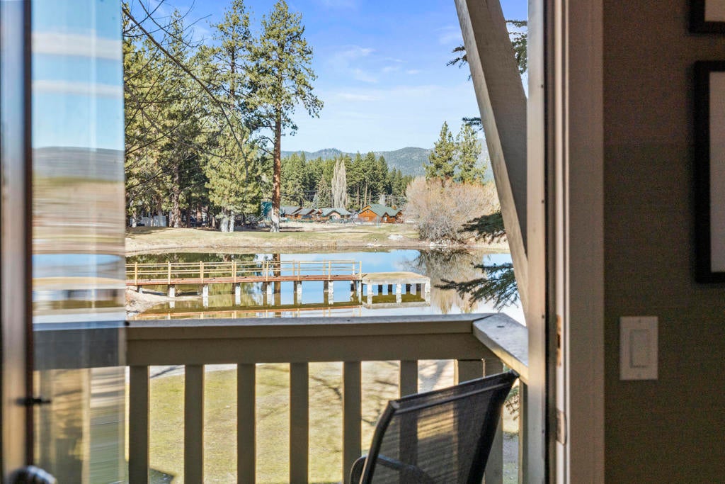 Stylishly updated townhome in Bear Meadows, ideally positioned overlooking the pond on the 8th hole of Bear Mountain Golf Course, with ski slope views visible from the kitchen and hallway windows. Recent upgrades include wood-grain tile flooring, custom lighting, a remodeled kitchen with granite countertops and stainless steel appliances, and updated bathrooms. The lower level offers a spacious entry with direct garage access, two en-suite bedrooms, and a convenient laundry room. Upstairs, the open great room is anchored by a dramatic floor-to-ceiling rock fireplace, half bath, and access to a private deck with plexiglass that frames the stunning views. The well-maintained Bear Meadows complex features community tennis courts, spa, and an updated clubhouse. Located at the base of the ski slopes in the heart of Moonridge, this property works equally well as a full-time residence or getaway and is currently licensed as a vacation rental. Offered beautifully furnished with high-quality decor and finishes, making it ready to enjoy today.