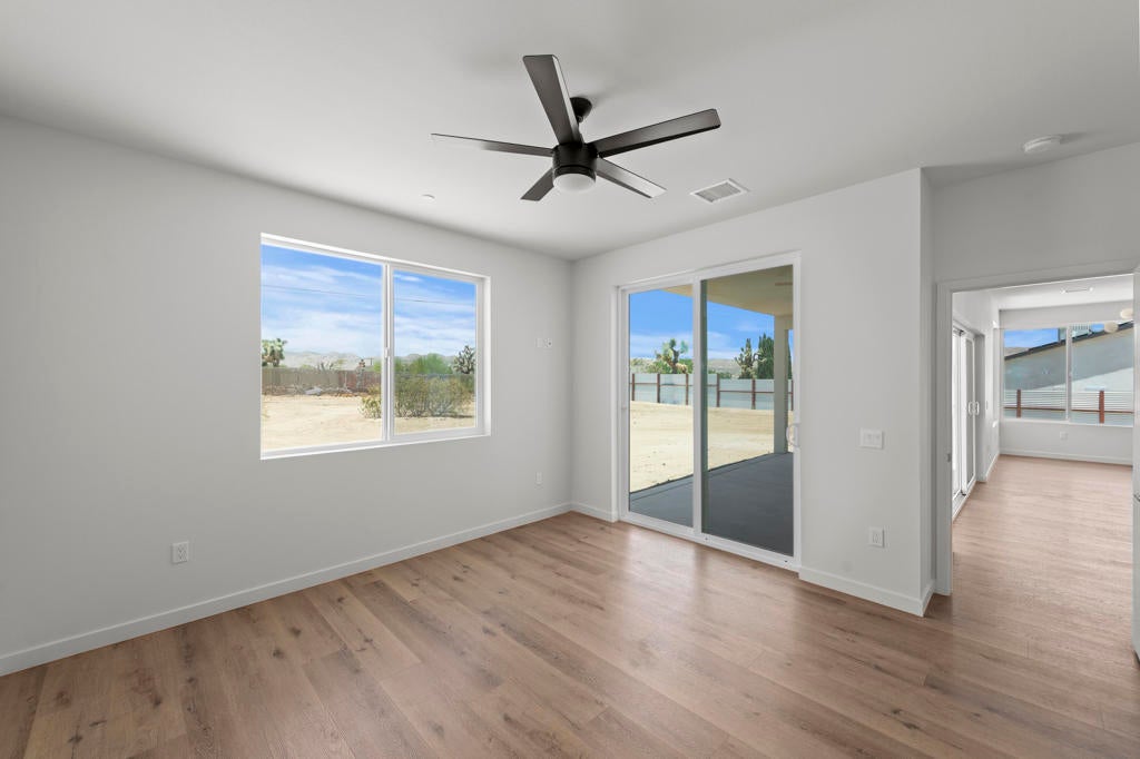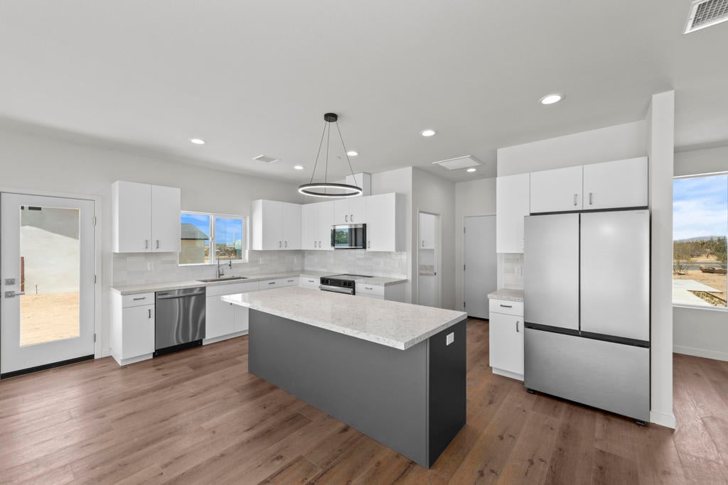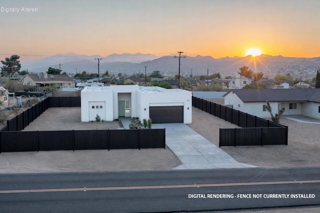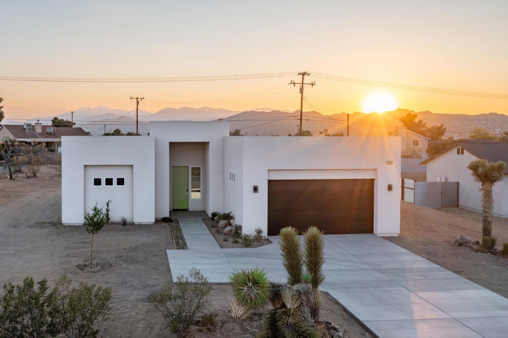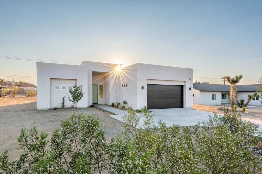 Welcome to 7082 Avalon Avenue - a newly completed modern desert home in the heart of Yucca Valley, offering 3 bedrooms, 2 bathrooms, 1,560 sq. ft., on nearly half an acre with paid solar. Built with a true quality-over-quantity mindset, this home features 2x6 framing for enhanced insulation, helping keep interiors cooler in summer and warmer in winter. With an east-west orientation, the home is positioned to capture stunning sunsets that can be enjoyed from the main living areas, including the living room, dining area, and kitchen, bringing the desert sky and natural light into everyday living. A striking White Coconut exterior with bold black accents and vibrant green entry details makes an immediate statement. Enjoy a spacious 2-car garage plus wide side yards with plenty of room for your RV, trailers, and more. Inside, an airy open-concept layout is filled with natural light from 6-foot-tall living room windows and a dramatic 12-foot sliding glass door opening to the backyard, creating seamless indoor-outdoor flow for effortless desert living and entertaining. The kitchen shines with quartz countertops, a crisp white tile backsplash, a large island with bar seating, and a full suite of brand-new Samsung stainless steel appliances. A walk-in pantry and a dedicated laundry room, complete with an included washer and dryer, folding counter, and built-in cabinetry, add everyday ease. Privately located at the rear, the primary suite offers backyard access, a walk-in closet, and an ensuite bath with dual vanities and a glass-enclosed shower. Two additional bedrooms and a full guest bath sit near the front for ideal separation and flexibility. The blank-slate backyard is ready for your dream oasis - enjoy wide-open skies and vibrant sunsets from the covered patio. Seller to install a full-perimeter privacy fence after close of escrow with an accepted offer at full list price or higher (terms and design per seller). Ideally located near everyday conveniences, local dining, and outdoor recreation, with easy access to Joshua Tree National Park and a short drive to Palm Springs. See the sunsets for yourself - Schedule a tour today!
