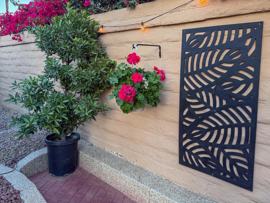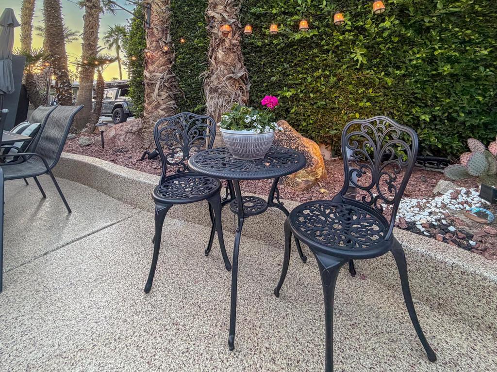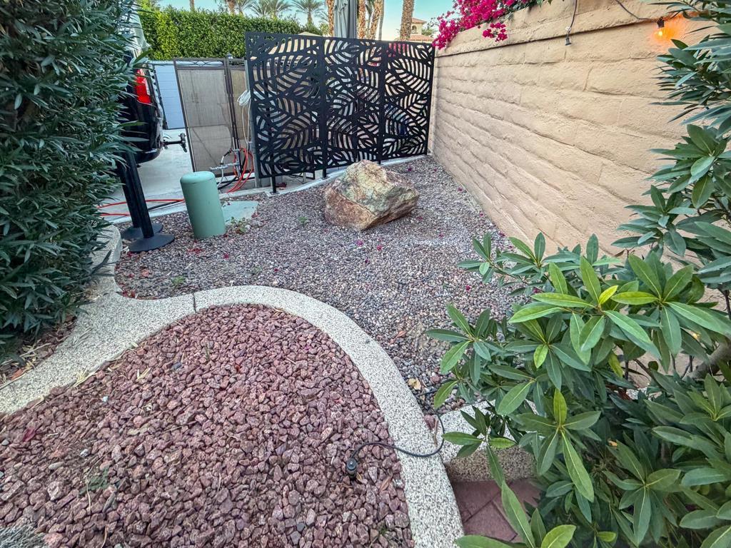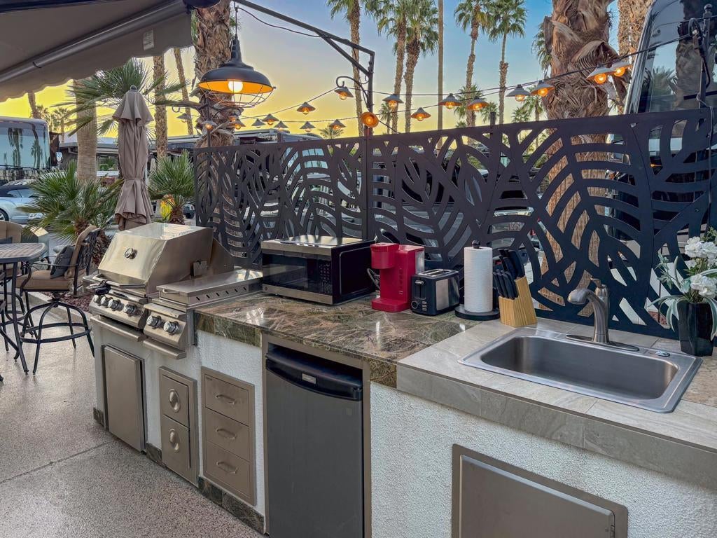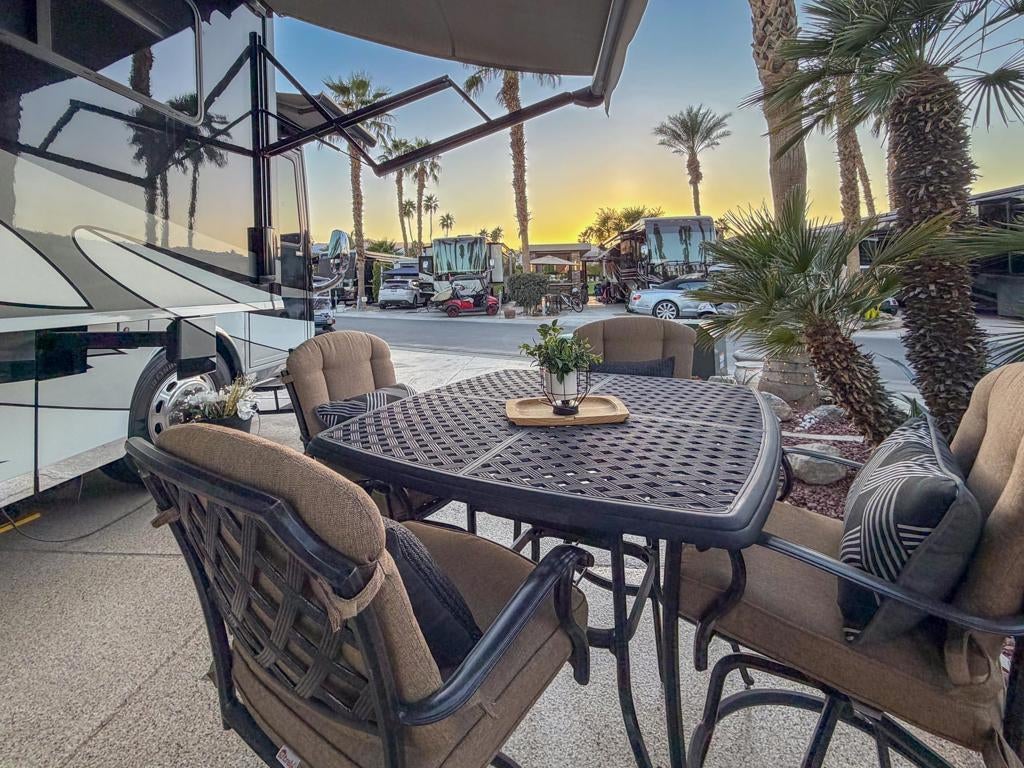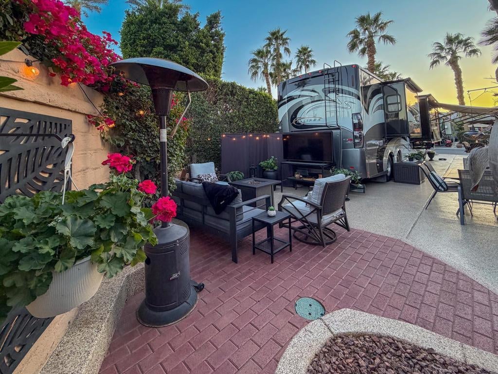 RV Lot #101 at Outdoor Resort Indio is a well-maintained, private luxury RV lot designed for comfortable outdoor living and relaxed entertaining. This desirable privacy lot features an epoxy flake-coated RV pad in excellent condition and a thoughtfully laid-out medium-size outdoor kitchen with two under-counter refrigerators, built-in barbecue, generous storage, and a new hot water heater.The outdoor living space is enhanced by a raised brick living area, accented with two metal art privacy fences that add both character and seclusion. Furnishings include a comfortable sofa, two chairs, two end tables, and a fire table, along with multiple dining options--an outdoor table with six chairs and an additional table with four chairs--perfect for hosting friends. Two hanging dining lights add warmth and ambiance in the evenings.Additional highlights include a tall rolling storage pantry, TV and stand positioned behind the coach, a mushroom heater, and lush, well-executed landscaping with extra palm trees that create a true oasis feel. This inviting, private lot is ideal for buyers seeking a move-in-ready setting with space to relax, entertain, and enjoy the ORI lifestyle--stop by and take a look anytime.‍Outdoor Resort Indio is a Class A only RV resort