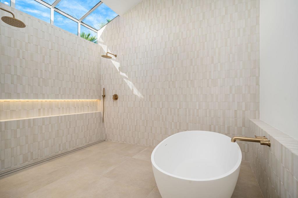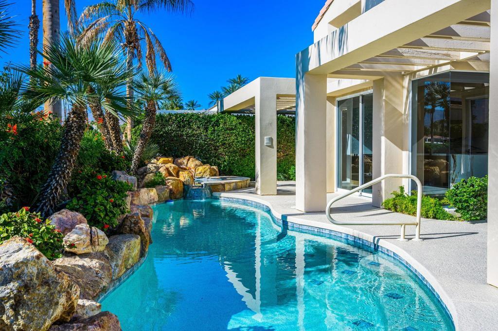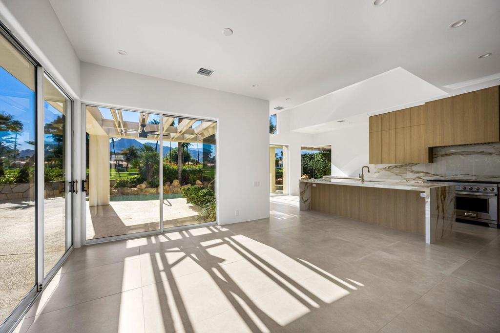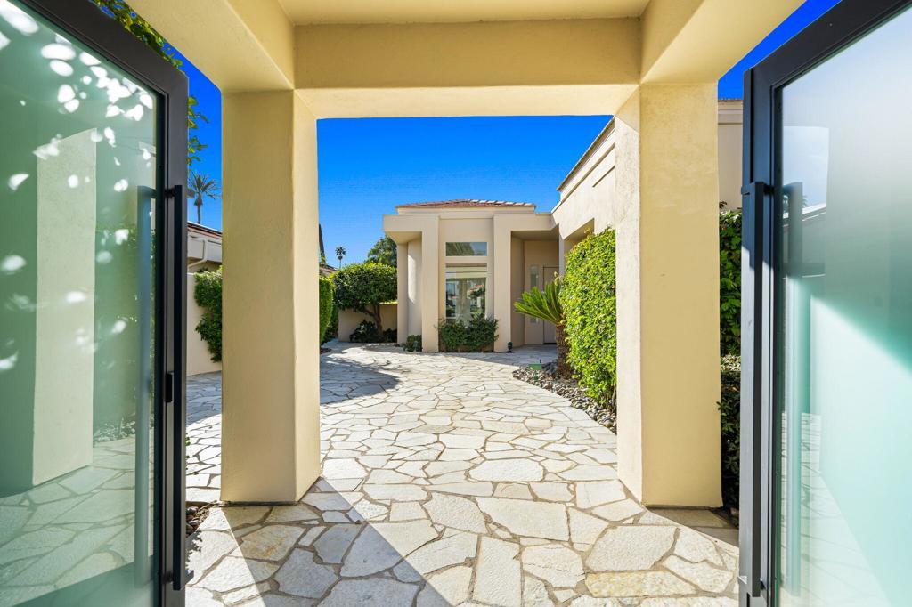 Say hello to STUNNING @ this newly renovated gem located at the most sought-after location within the prestigious Desert Horizons Country Club, in the heart of Indian Wells. Enter through the dazzling frosted glass private front gate into a serene courtyard accented with desert hued sandstone and lush landscape. Once through the front door, you are met with grand panoramic southern mountain views, a stunning championship golf course and sparkling pool/spa surrounded by a lush oasis of palms and fragrant foliage. The beauty of the desert flows seamlessly in and out of this popular Winged Foot model, but it's different; with walls moved and an added powder room off the main entrance, it now offers 2984 sf of superb, highly upgraded desert living space. Upon entry, the generous living/dining area boasts designer oversized concrete tile, warm painted interiors, new windows, and a vast space to create your own, beautiful living and entertaining heaven. Enter the kitchen, and you're greeted with rich carmel /ivory Italian Porcelain countertops, brushed stainless/gold hardware, a Professional 48'' duel fuel Wolf range, Sub-Zero frig, a double wine frig, cabinet accent lighting and more. Push Dayton Rift cabinetry adds a modern, clean finish to this exquisite professional kitchen space. Slide open the surrounding doors and the shimmer of a sparkling pool and gentle waterfall spa welcome you into your own private, relaxing haven. Let's add new-to-market highest-end finishes of Taj Mahal quartzite natural stone in all bathrooms and laundry room and this home can only speak Luxury! The Primary bedroom is a quiet respite with sliding doors leading to your bubbling, private spa., Enter the Primary bathroom, and a grand-Euro bathing experience awaits. All lighting is motion-sensored, with an extra-large soaking tub that flows directly into a lavish shower experience, where everyday bathing will feel like you're being pampered at your favorite European spa. The attention to detail is exquisite in this home. Last but not least, new HVAC and water heaters have been added. PLEASE CONTACT LISTING AGENT FOR MORE INFO!!! Desert Horizons Country Club is a fun and friendly hub of activity, enjoying a brand-new modern clubhouse, 4000 sf fitness center, and large pickleball and tennis courts complex.NOTE: All rooms shown furnished have been virtuallly staged.