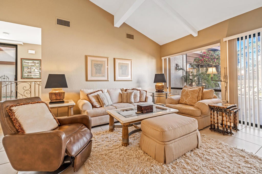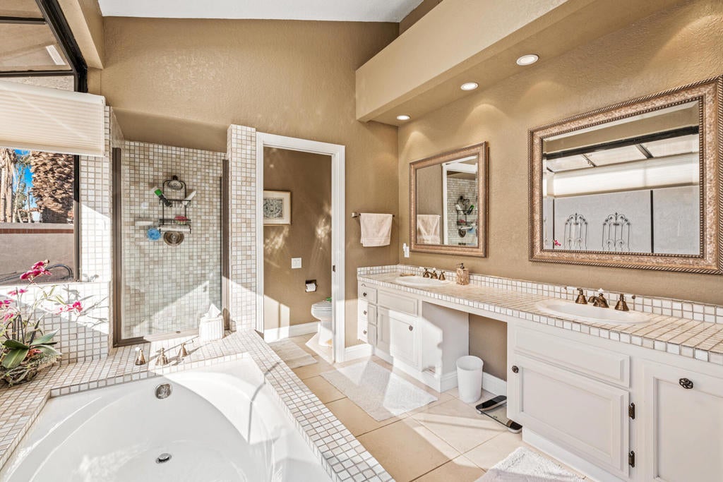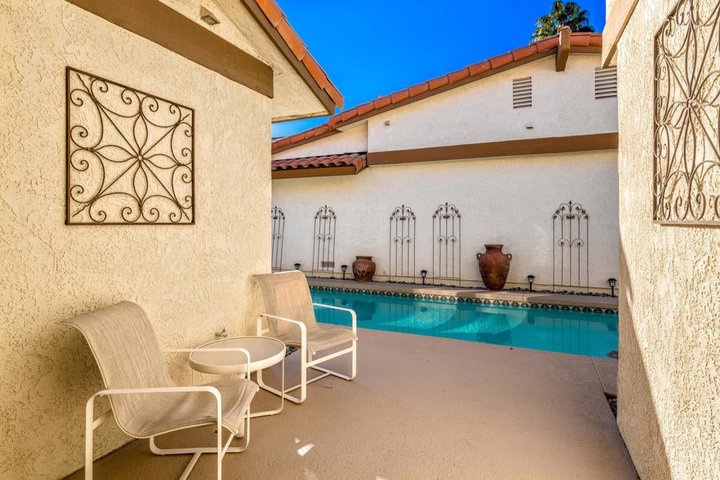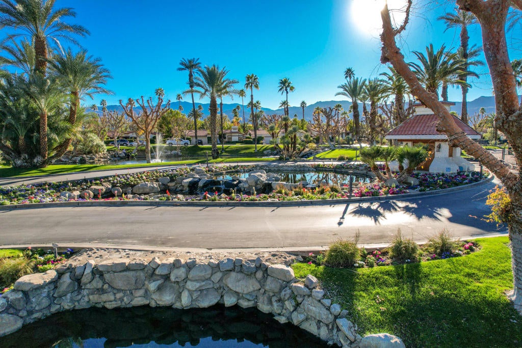 Close to Coachella & Stagecoach. Private home in gated Los Lagos community of Indian Wells. 3 bdrm + 3 bath with 2 master suites. High wood beamed ceilings and a private pool & jacuzzi, + 4 community pools & jacuzzis that are heated year-round. The complex also has tennis & pickle ball courts. This popular Bonita model home overlooks a stream and greenbelt with native fish & birds. Close to many restaurants, shopping areas, and world class golf courses. Solar panels installed to reduce electricity costs, saving tenants hundreds of dollars - particularly in summer. Half price summer rates ($3500/mo.). We also offer reduced rates for anyone directly affected by the LA County fires. Call for availability. April 10K