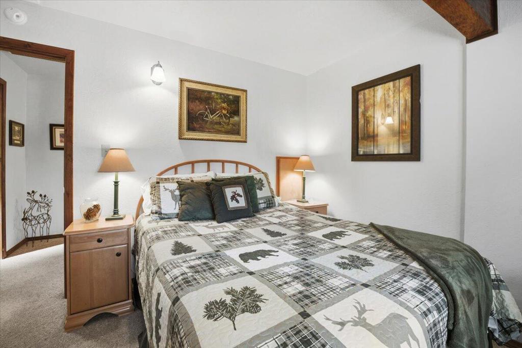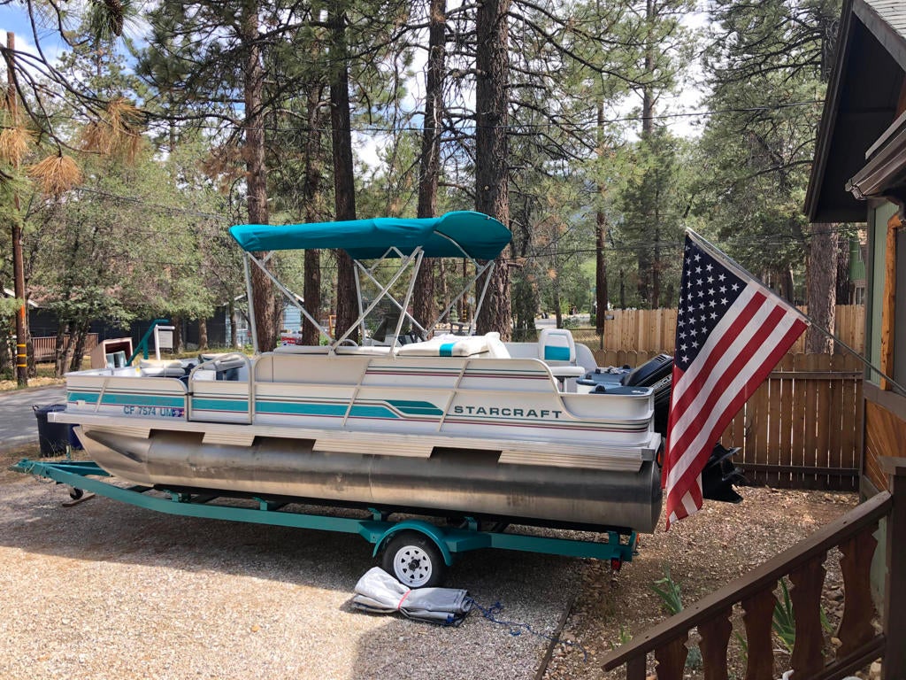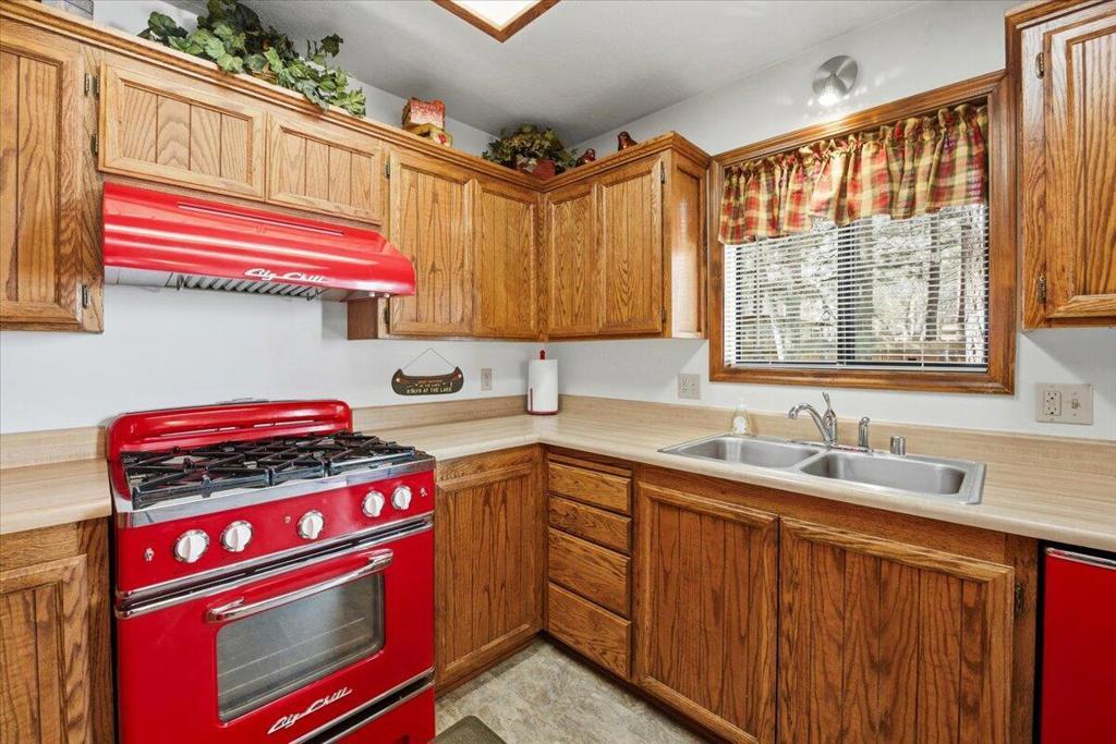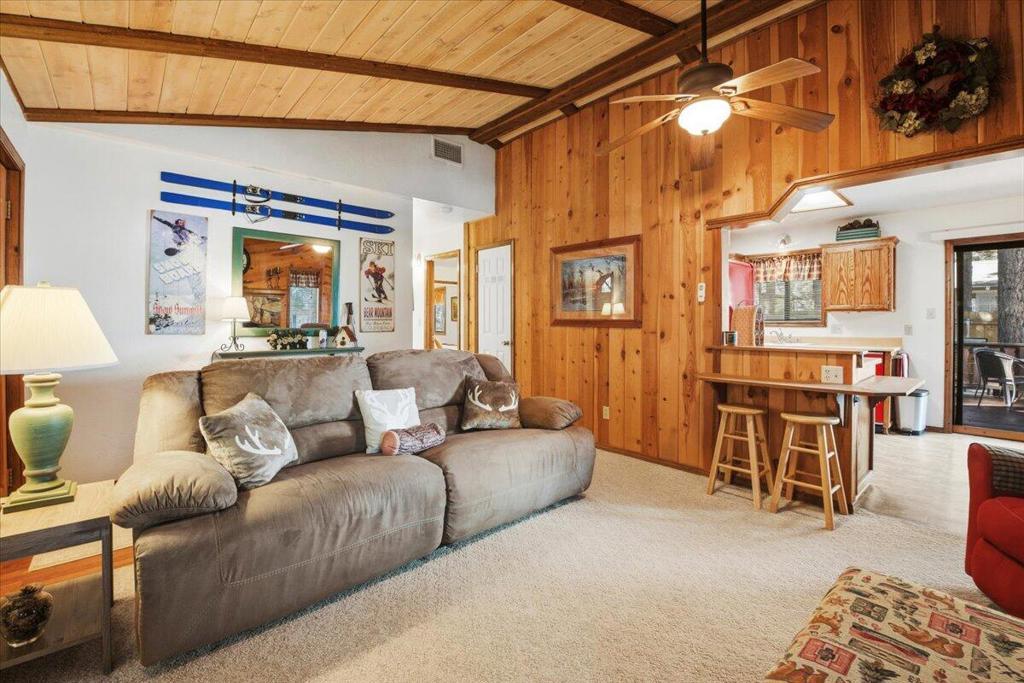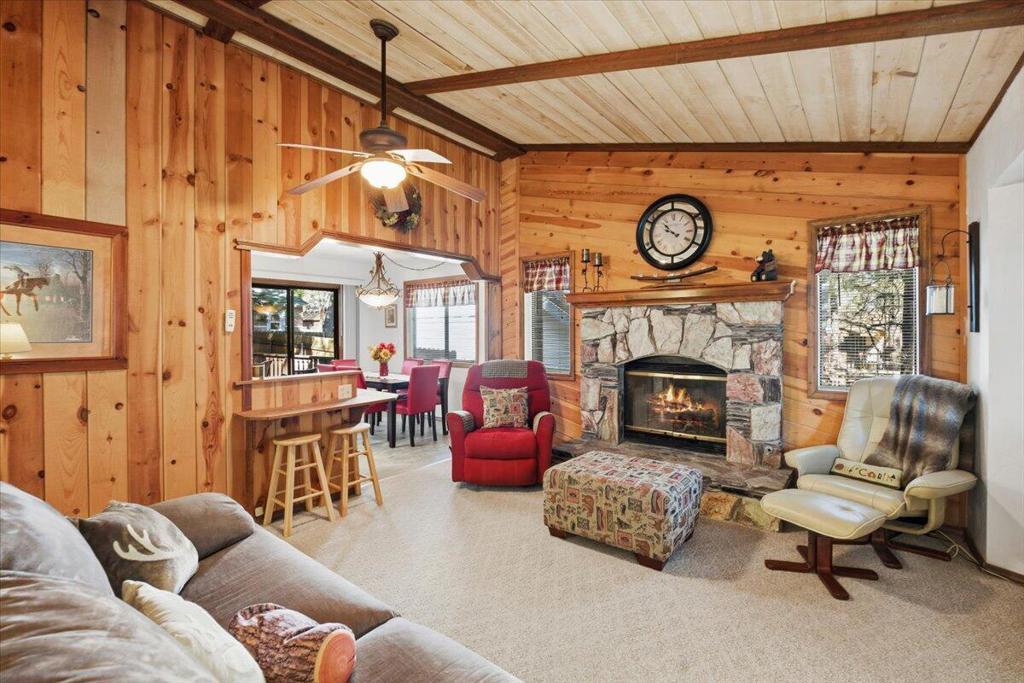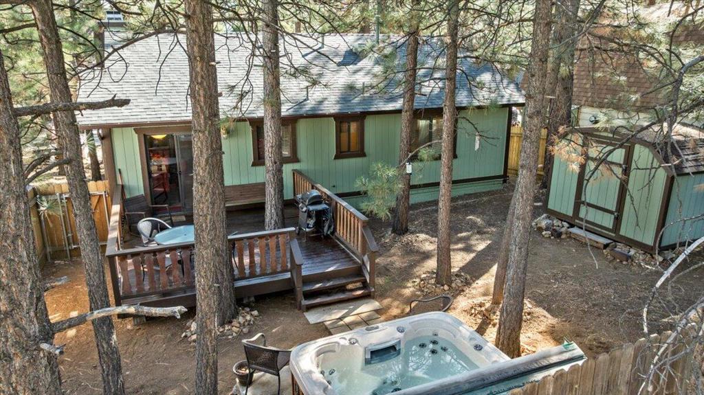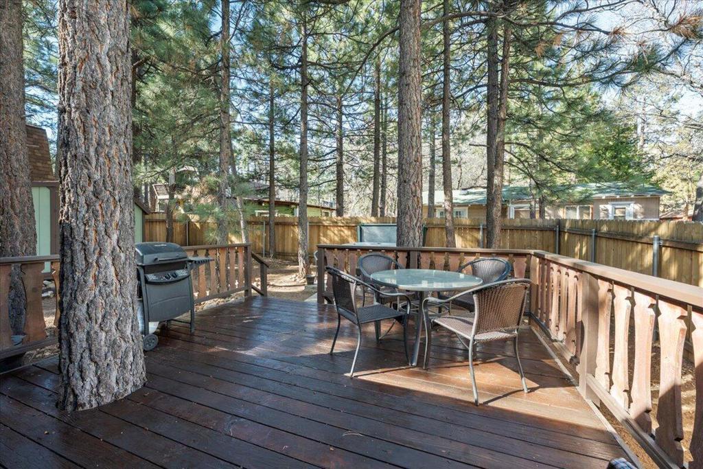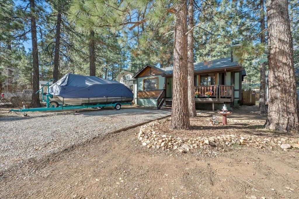 Turn-key, mountain cabin on a level double lot--clean, bright, and beautifully updated! This fantastic 2-bedroom, 2-bath home offers an ideal layout with vaulted ceilings, an open floor plan, and a stunning rock fireplace perfect for cozy mountain evenings. The kitchen features eye-catching red vintage-style appliances that bring a fresh, on-trend look to the space. The primary bedroom includes its own bathroom, and you will find a stack washer and dryer in the hall closet. The fully fenced backyard is beautifully treed and designed for relaxation and entertaining, complete with a large freshly stained deck and spa. The covered, freshly stained front porch adds even more outdoor living space to relax and unwind on year-round. Light, bright, and exceptionally clean, this home delivers that true mountain-cabin feel with all the modern comforts. Offered fully furnished and truly turn-key. **And here's the BONUS:** With an acceptable offer, the sellers will include the pontoon boat at no additional cost! A furnished, single-story cabin on a double lot with laundry, a spa, and a free boat--this is an incredible opportunity! Don't miss this one!