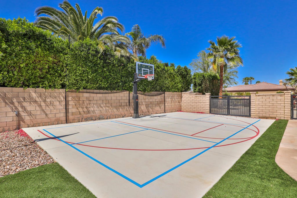 AVAILABLE ALL MONTHS!! Located in Desert River Estates located near the Polo Grounds where Coachella, and Stagecoach music festivals take place. It is spacious inside and has a great pool and outdoor relaxing area with mountain views. The great room has plenty of seating for your guests, the 65 inch flat screen TV or a quiet evening enjoying a roaring fire or glorious mornings allowing the natural beauty and sunlight to come in through the vast glass windows and doors. This home is set up perfect for entertaining with the seamless flow from the living area to the gourmet kitchen hosting stainless steel appliances including double ovens, granite countertops and a large island. The island comes equipped with 4 barstools for quick dining, adjacent to the kitchen table for 6. For more elegant dinners, the dining room offers seating for 8. The master suite offers a king bed, flat screen and private exit to the back patio. The master bath offers his and her sinks, a vanity area, soaking tub with a separate walk in shower. The second suite offers a queen bed, flat screen and a private full bath. The third bedroom hosts a queen bed and fourth bedroom hosts two twin beds, flat screens with a Jack and Jill bath. The fifth room doubles as an office and an extra bedroom with a daybed with a trundle below. The back patio oversized pebble-tec pool with a tanning shelf, pool umbrella and pool lounge chairs. Built in BBQ & Basketball court. Pack your bags..
