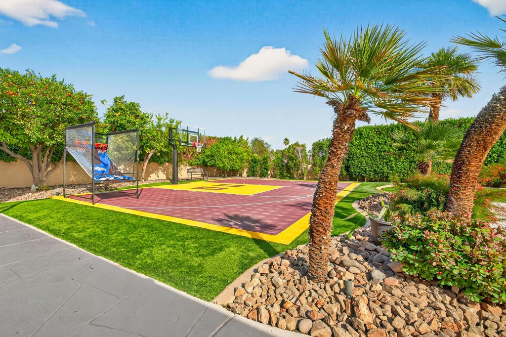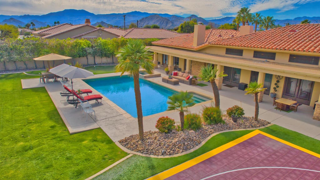 Welcome to Moore Circle -- an exclusive gated enclave of just ten private residences where refined desert living meets architectural intention. Designed to capture both privacy and panoramic mountain views, this residence delivers a seamless indoor-outdoor experience curated for elevated entertaining. Expansive glass doors, soaring ceilings, and abundant natural light create a gallery-like ambiance throughout the open great room, anchored by a striking stone fireplace and bespoke finishes. The chef's kitchen is a true centerpiece -- appointed with premium appliances, an oversized marble island, and an intimate breakfast setting overlooking manicured grounds and mature citrus. Every detail has been thoughtfully selected, blending timeless materials with contemporary elegance. Three generously proportioned en-suite bedrooms offer private retreats, complemented by a dedicated executive office. The primary suite is a sanctuary unto itself, featuring a fireplace, private fitness area, and an in-ground spa -- a rare luxury that elevates daily living. Outdoors, curated entertaining spaces frame the mountain backdrop, embodying the essence of sophisticated desert lifestyle. Additional highlights include a newer A/C system, an oversized garage with extensive storage and its own climate-controlled split system, low HOA dues, community tennis, and close proximity to HWY 111, Bermuda Dunes Country Club, and Indian Wells Tennis Gardens. This is a rare opportunity to secure an intimate, design-forward residence in one of the desert's most discreet enclaves.