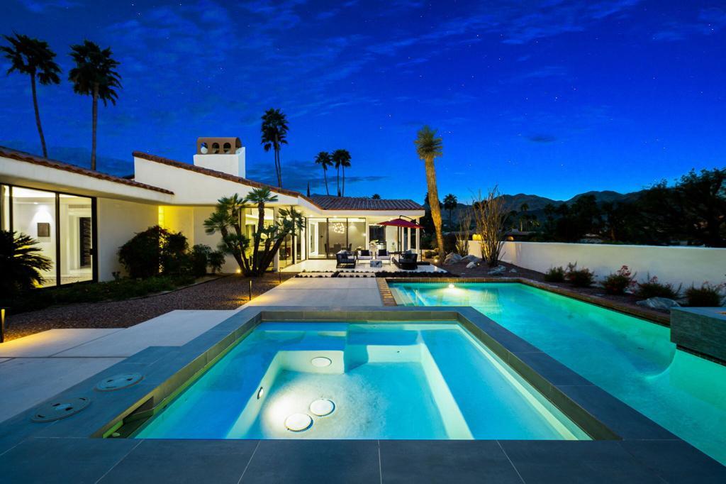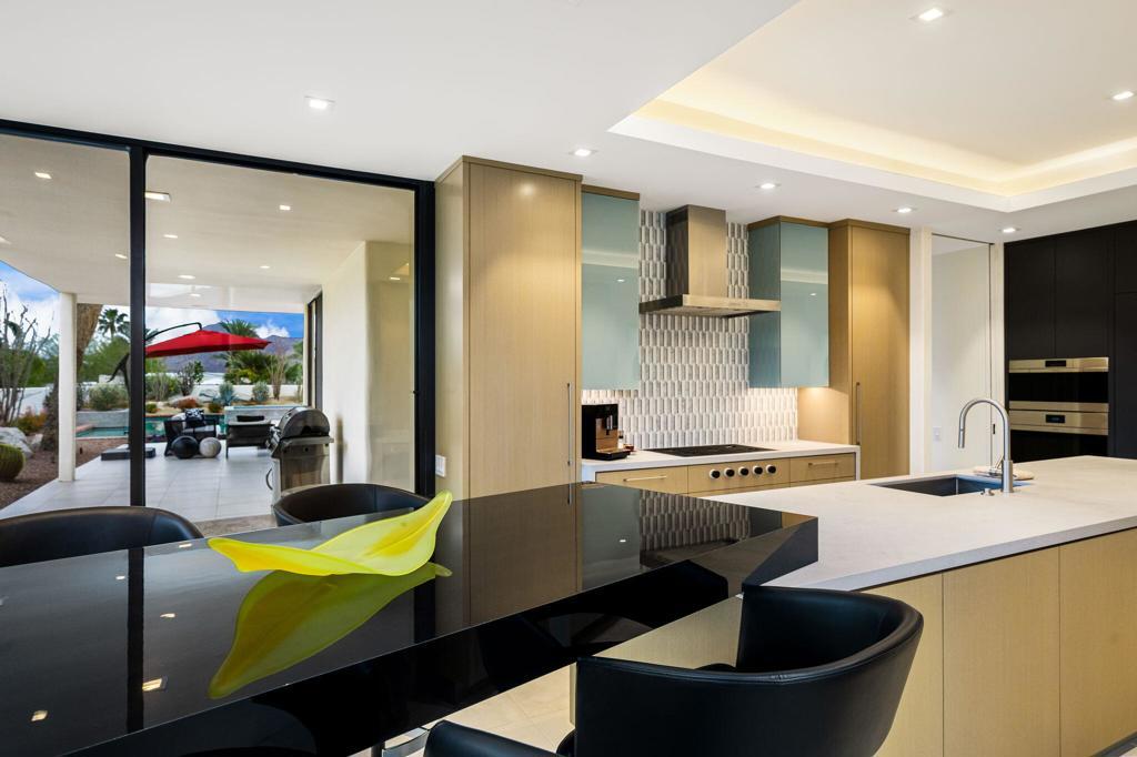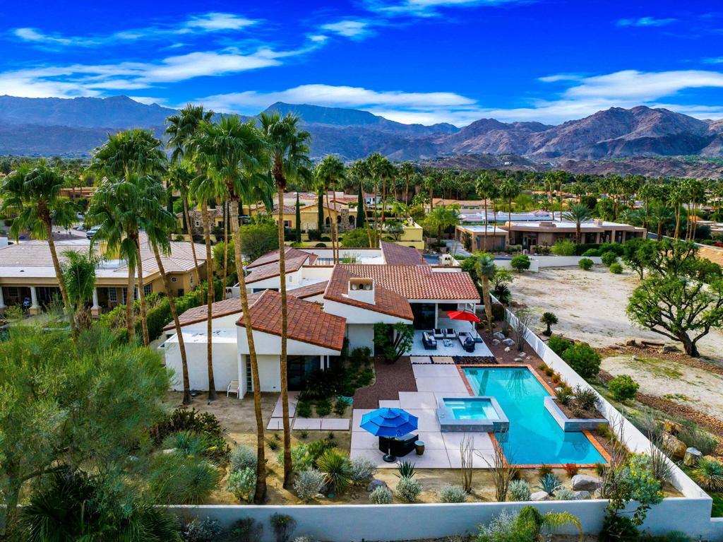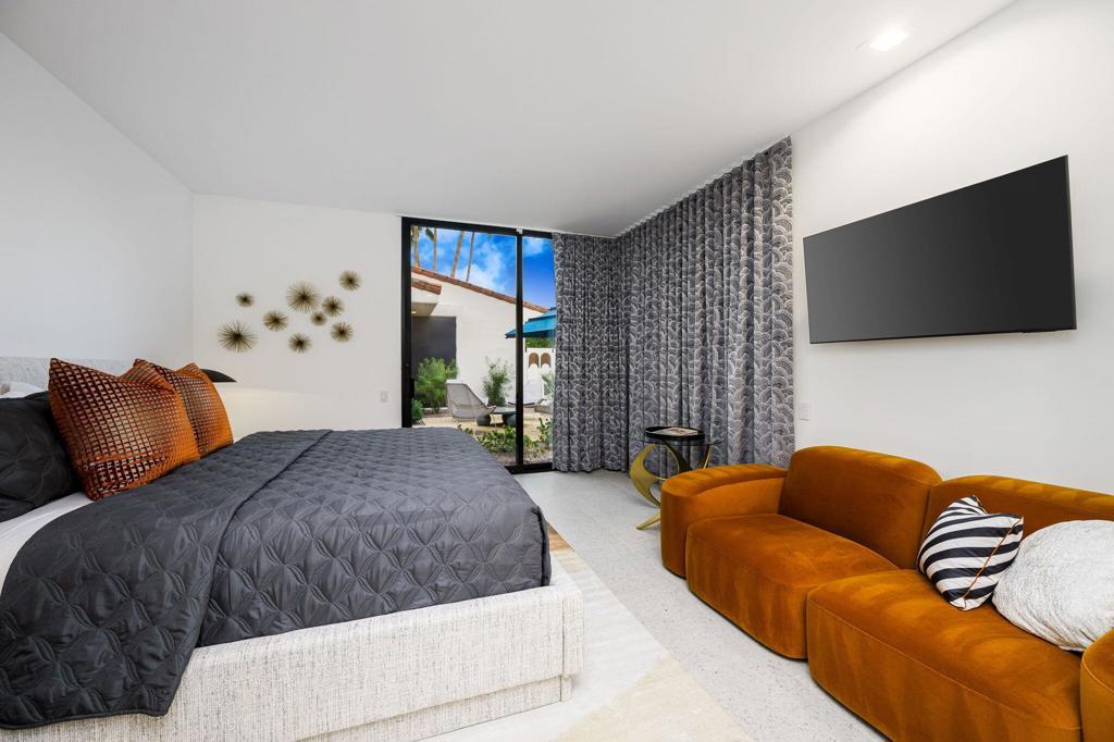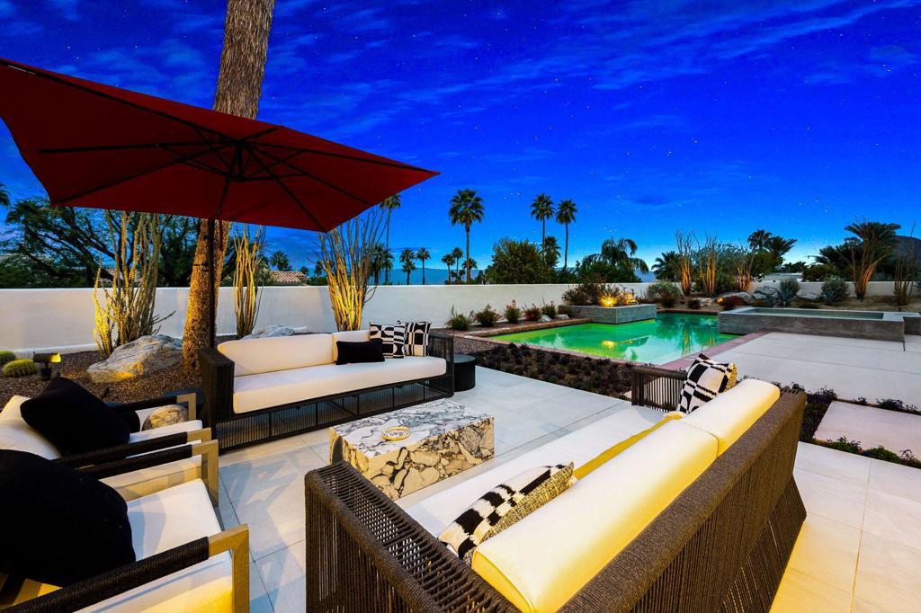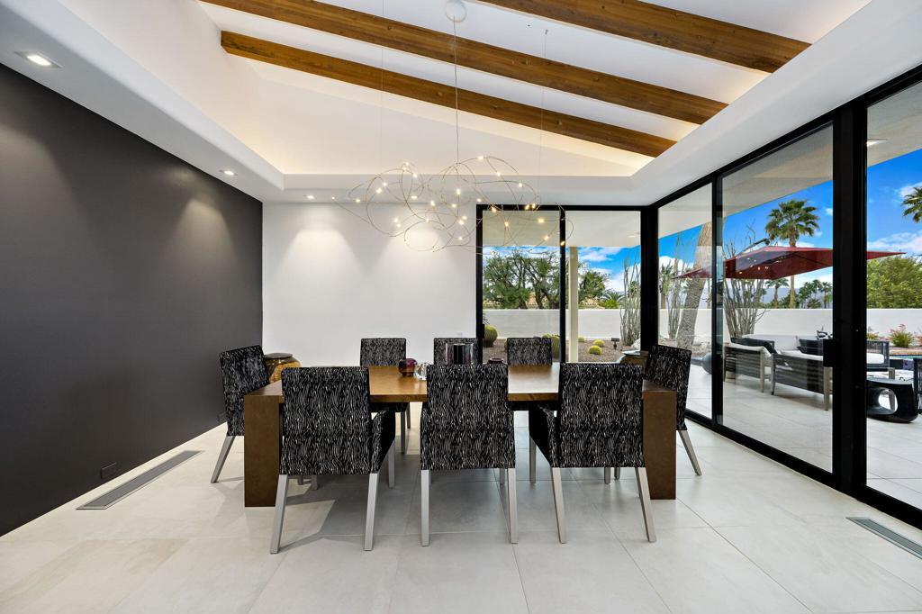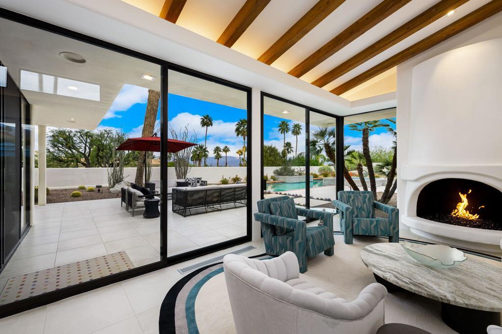 An Artful Desert Residence - Rooted in the spirit of the desert and elevated with a distinctly modern sensibility, this approximately 4907 square foot residence is a masterful study in light, volume, and design. From the moment you arrive, dramatic double wood-framed glass entry doors set the tone, opening into a luminous interior defined by soaring beam ceilings, walls of glass, and clerestory windows that draw the outdoors in.The open great room and dining space unfold with quiet confidence--anchored by a fireplace, softened by ambient accent lighting. Exposed wood beams create warmth and continuity, while the home's thoughtful layout allows spaces to flow effortlessly, equally suited to intimate living and refined entertaining.The Main Bedroom suite is a private one, styled with art-deco inspiration and opening directly to the poolside patio for seamless indoor-outdoor living. A separate guest wing offers three en-suite bedrooms, each with its own patio access, providing privacy and comfort for visitors while maintaining a strong connection to the landscape.A generous office or studio space supports modern living, complemented by abundant interior storage and a three-car attached garage. The home reflects a rare level of pride of ownership and a design that feels both intentional and enduring.Distinctive, well-proportioned, and beautifully appointed, this is a residence that balances architectural presence with livability--an elegant desert home designed to be experienced, not merely admired.The property is being offered ''unfurnished;'' some furnishings, art, and decorations may be available.