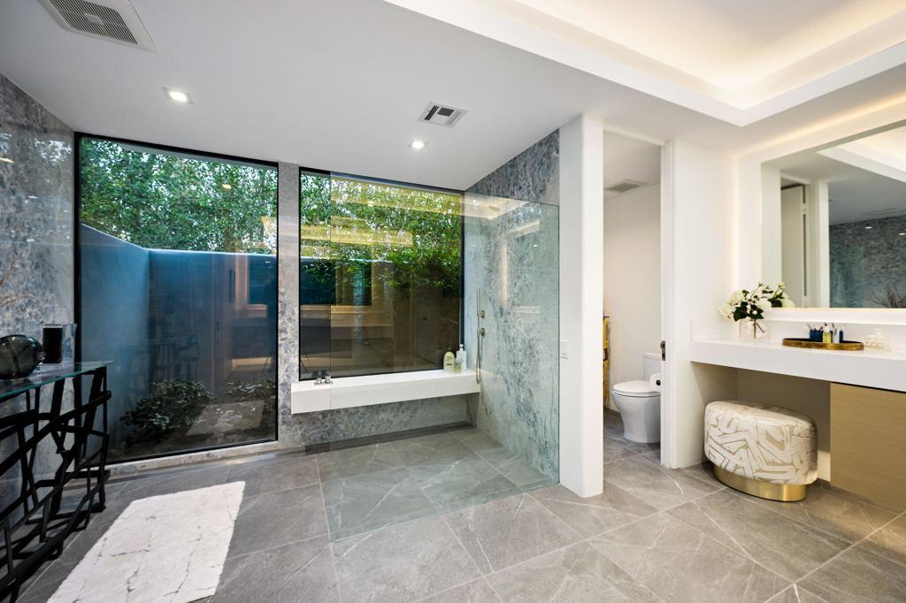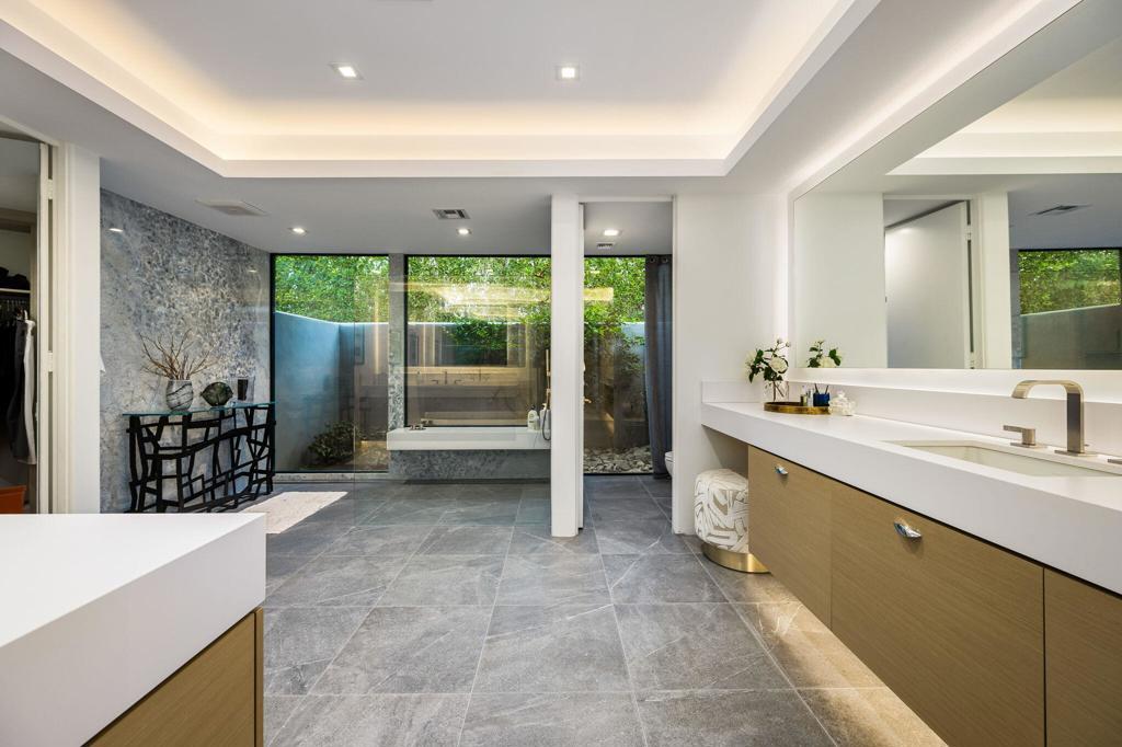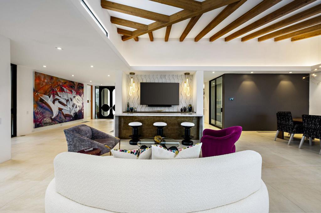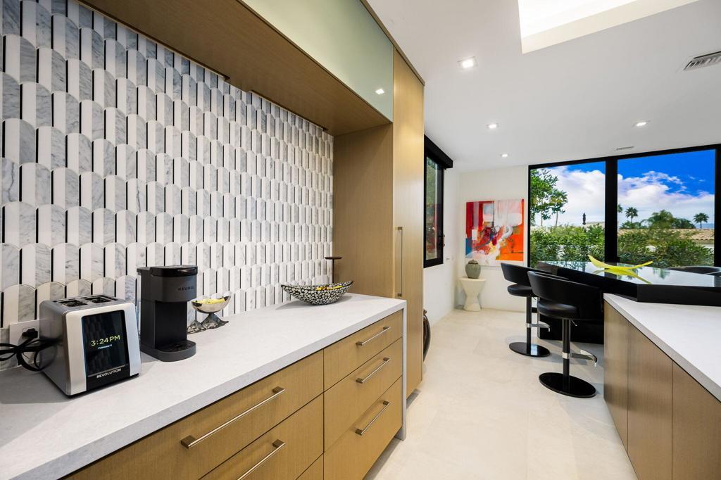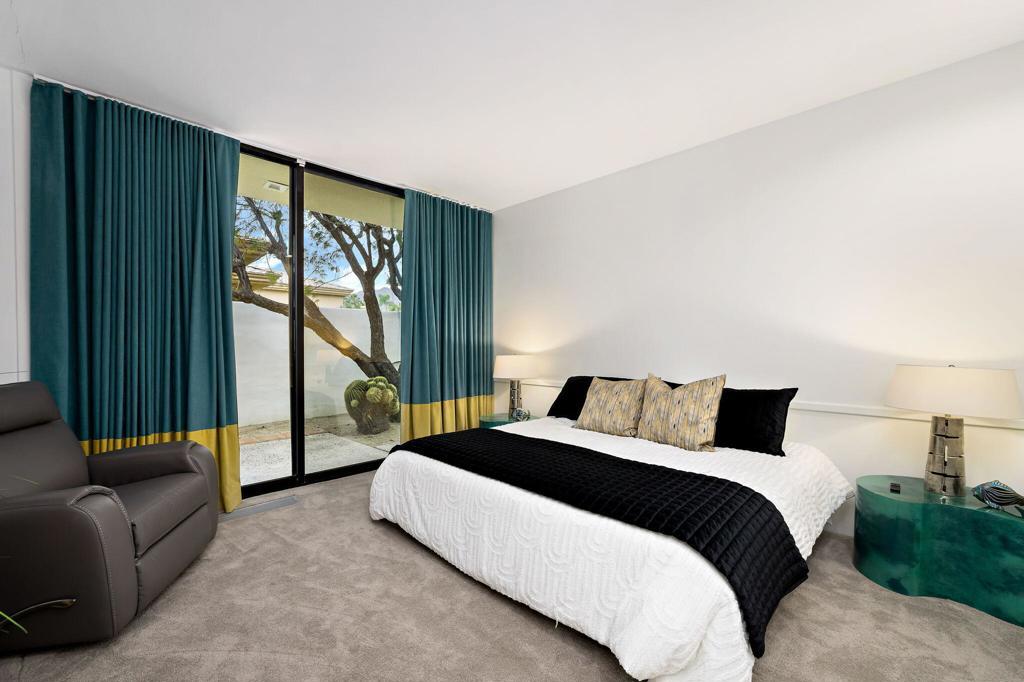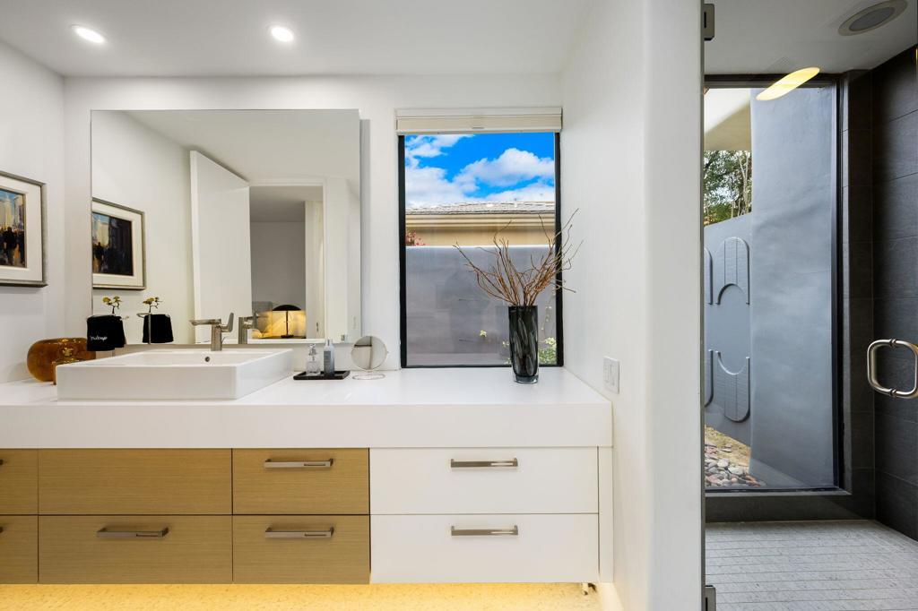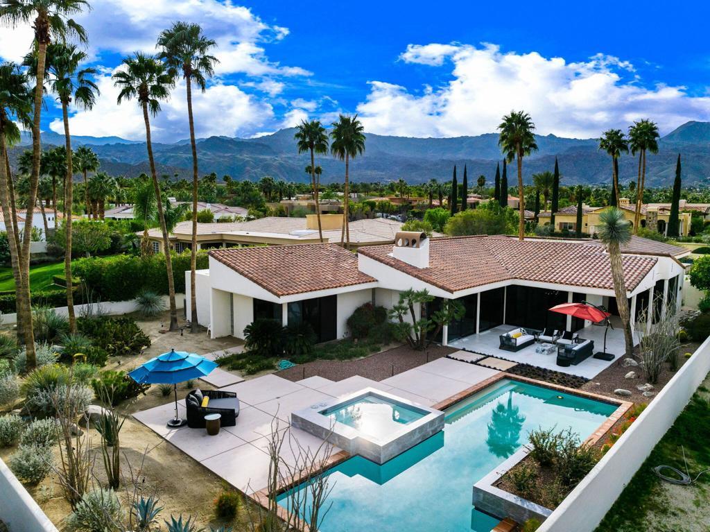 An Artful Desert Residence - Rooted in the spirit of the desert and elevated with a distinctly modern sensibility, this approximately 4907 square foot residence is a masterful study in light, volume, and design. From the moment you arrive, dramatic double wood-framed glass entry doors set the tone, opening into a luminous interior defined by soaring beam ceilings, walls of glass, and clerestory windows that draw the outdoors in.The open great room and dining space unfold with quiet confidence--anchored by a fireplace, softened by ambient accent lighting. Exposed wood beams create warmth and continuity, while the home's thoughtful layout allows spaces to flow effortlessly, equally suited to intimate living and refined entertaining.The Main Bedroom suite is a private one, styled with art-deco inspiration and opening directly to the poolside patio for seamless indoor-outdoor living. A separate guest wing offers three en-suite bedrooms, each with its own patio access, providing privacy and comfort for visitors while maintaining a strong connection to the landscape.A generous office or studio space supports modern living, complemented by abundant interior storage and a three-car attached garage. The home reflects a rare level of pride of ownership and a design that feels both intentional and enduring.Distinctive, well-proportioned, and beautifully appointed, this is a residence that balances architectural presence with livability--an elegant desert home designed to be experienced, not merely admired.The property is being offered ''unfurnished;'' some furnishings, art, and decorations may be available.