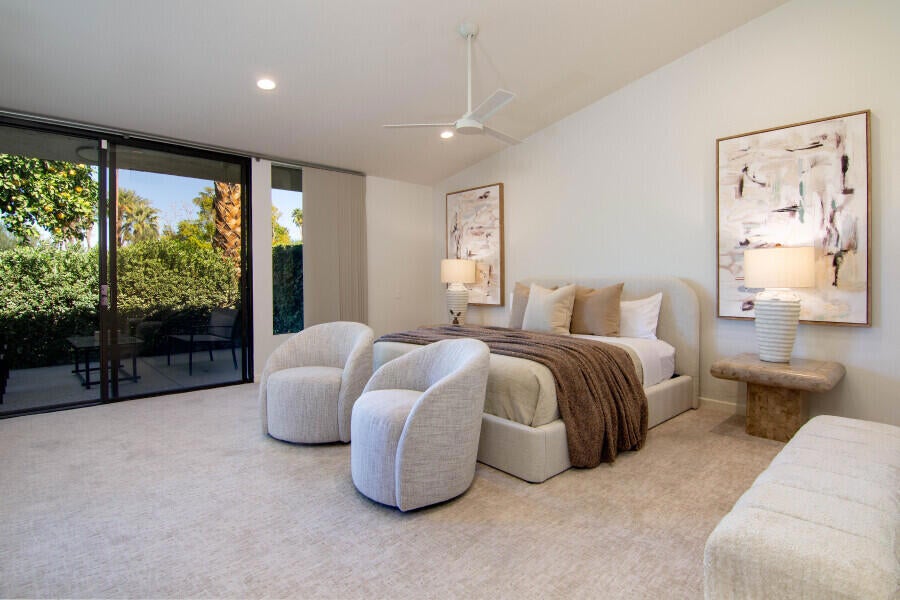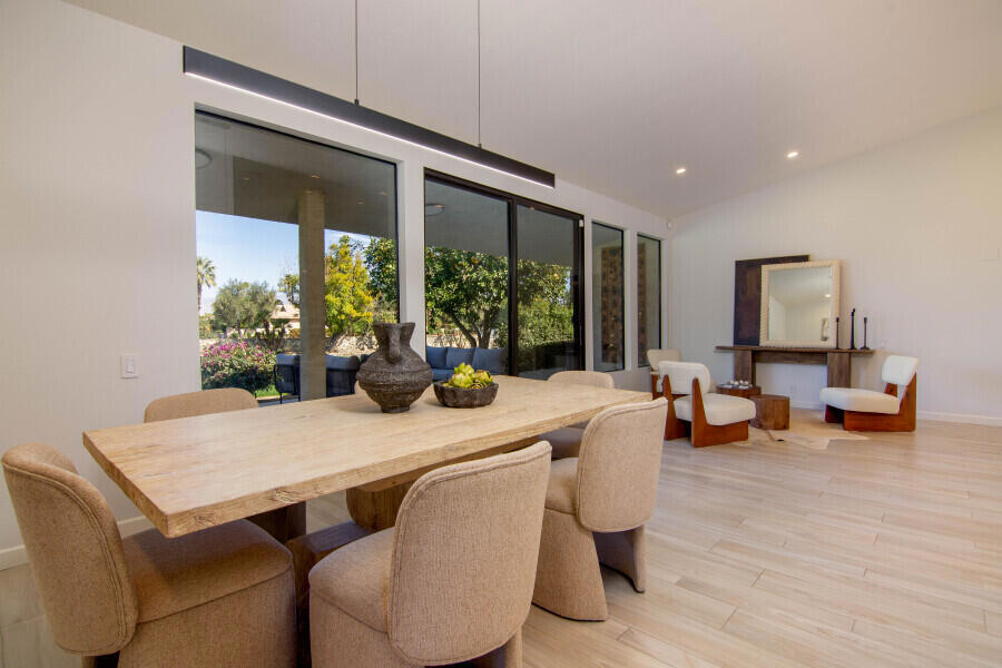 Set within the prestigious gates of Desert Horizons Country Club, this sophisticated Indian Wells residence delivers an elevated desert lifestyle defined by space, light, and breathtaking surroundings. Offering over 3,200 sq. ft., the home captures uninterrupted views of the golf course, serene water features, and mountain silhouettes, all framed by expansive glass that brings the outdoors in. The interior unfolds with a welcoming sense of scale, beginning with an elegant living room designed for both intimate evenings and stylish entertaining. A chef-inspired kitchen connects seamlessly to an inviting den--an ideal setting for relaxed gatherings and everyday comfort. The thoughtfully reconfigured primary suite is a private sanctuary, complete with a flexible bonus area perfect for a gym, office, or retreat space, custom walk-in closets, and a luxurious spa-style bath.Guest accommodations are equally refined. One ensuite bedroom opens to calming courtyard and mountain views, while an additional room has been transformed into a custom dual-workstation office with built-in cabinetry--perfect for today's modern lifestyle. The home also features an atrium and skylights throughout. Upgrades include, new flooring, new plush bedroom carpeting, a redesigned powder room, fresh interior paint, updated contemporary lighting. Behind the scenes, the residence has been enhanced with dual newer 4-ton AC systems, a newer water heater, epoxy-coated garage floors, two EV charging stations, wine coolers, and a leased solar system--delivering comfort, efficiency, and peace of mind. Ownership includes access to Desert Horizons' newly completed clubhouse, a striking desert-modern destination featuring a full-service restaurant and bar, casual cafe, expansive wellness and fitness center, pro shop, and a premier racquet complex with pickleball and tennis courts. Moments from the dining, shopping, and cultural offerings of Indian Wells, this home offers a rare blend of privacy, prestige, and resort-caliber living. Buyers are responsible for verifying the accuracy of all information.
