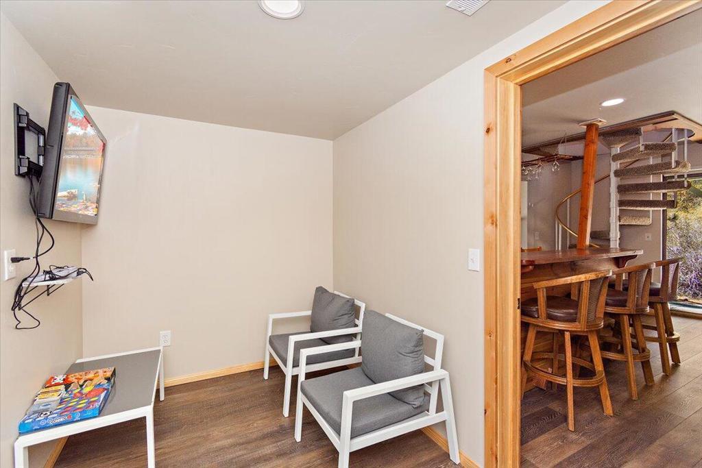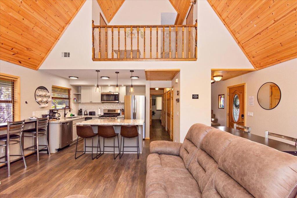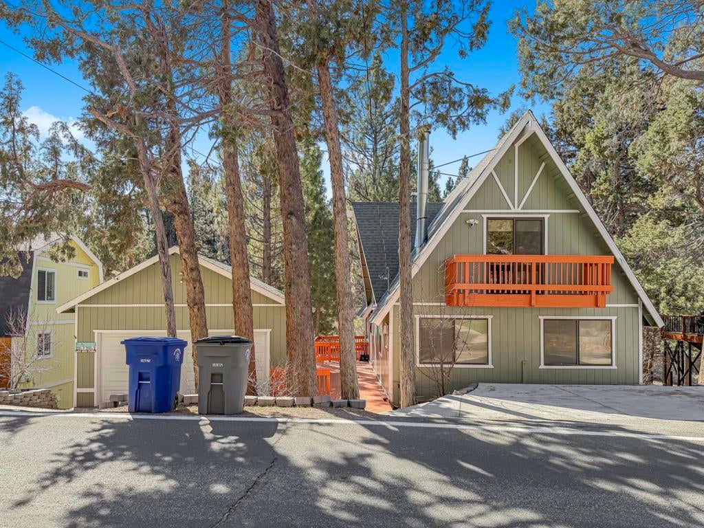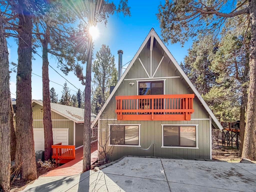 Discover your perfect investment or mountain getaway in Big Bear Lake with this stunning Fox Farm Chalet. Its prime location offers exceptional stargazing thanks to the high altitude and distance from city lights, making the night skies ideal for viewing constellations and meteor showers. This astounding home is a perfect fit for a short-term rental investment, a second home, or year-round living. Featuring 3 bedrooms, 3 bathrooms, and a versatile bonus room, the home boasts an eye-catching A-frame roof and abundant windows and sliding doors that flood the over 1,800 sq ft of living space with natural light. The uniquely designed, tri-level floor plan centers around the mid-level, the heart of the home. Here, a semi-open layout connects a sizable living room, complete with a cozy wood-burning fireplace, to a modern kitchen. The kitchen impresses with white cabinets, quartz countertops, a convenient island, stainless steel appliances, and distinctive lighting. This level also features two stylish bedrooms with lovely outdoor views and a full-size bathroom. Ascend to the top level for a private master bedroom retreat. This serene space includes its own cozy fireplace, exquisite outdoor views, and an extended loft area.The spiral staircase leads down from the mid-level to the ground floor, which is designed as an entertainment space and game room. This flexible area can be transformed into a man-cave, a children's den, an office workspace, or even set up as a fourth bedroom. A third full bathroom is also located on this level. Complementing these interior features is an incredible outdoor deck, perfect for seating and enjoying the mountain air.