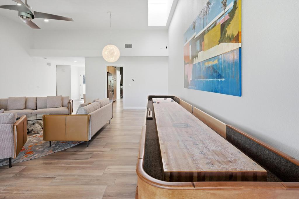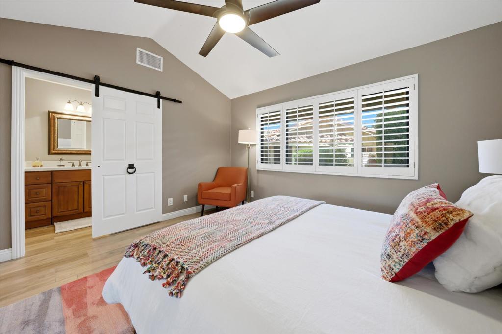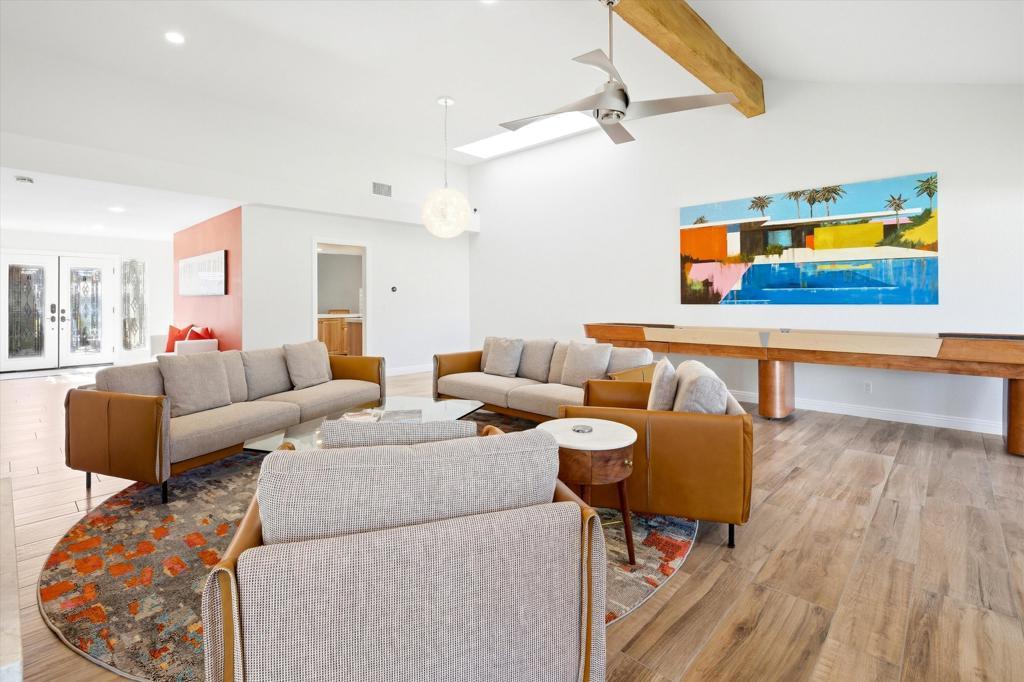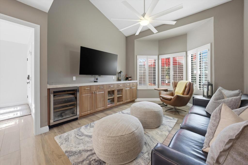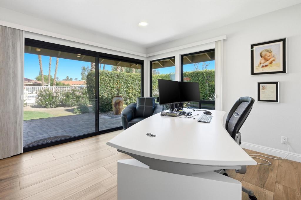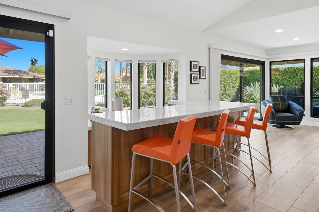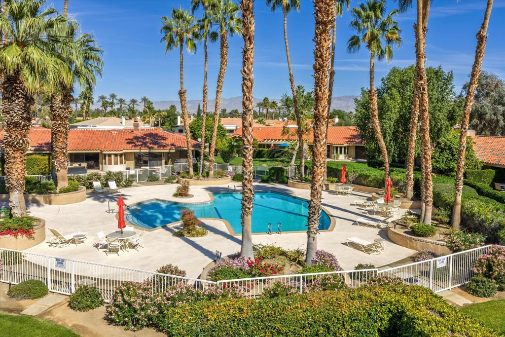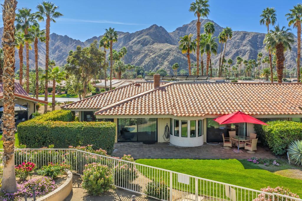 An exceptional Bergheer residence in the prestigious, guard-gated Sandpiper enclave of Indian Wells Country Club. This impeccably reimagined condominium masterfully blends iconic desert architecture with elevated finishes and advanced energy efficiency.A private gated courtyard offers a refined arrival, framed by curated desert landscaping and vibrant blooms. Expansive paver hardscape flows seamlessly from driveway to entry, courtyard, and rear patio, creating effortless indoor-outdoor living. The tranquil outdoor spaces, appointed with infrared gas heaters, are ideal for morning coffee or intimate evenings under the stars, just steps from the community pool and spa.Inside, soaring vaulted ceilings and an expansive open-concept great room establish a dramatic yet inviting ambiance. A gas fireplace with elegant quartz anchors the living areas, while a stylish wet bar opens directly to the rear patio. The spacious office/den provides flexible space for guests or executive work. High-efficiency Milgard windows and doors, including striking curved bay windows bathe interiors in natural light and frame panoramic mountain views. The designer kitchen features quartz countertops, custom cabinetry, bar seating, and premium appliances. Custom built-ins with integrated wine cooler enhance the family room, ensuring seamless flow. The primary suite impresses with tray ceilings, quartz-surrounded gas fireplace, generous closets, and spa-inspired bath with dual vanities, deep soaking tub, and glass-enclosed shower. The guest suite offers complete privacy with en-suite bath. Designer touches include Hunter Douglas window treatments, luxury tile plank flooring, high-end fixtures, professionally curated furnishings, and a custom shuffleboard table add distinctive flair for refined entertaining.Crowning the home is a fully owned 7.85 kW SunPower solar system (24 Maxeon panels), generating ~12,513 kWh annually and reducing electric costs to ~$17/month. Additional upgrades encompass all-newer HVAC zoning with fresh ductwork, enhanced attic insulation (residence and garage), instantaneous gas water heater with recirculation, water softener, and garage split-system heat pump. The two-car garage plus golf cart space provides abundant storage. Offered fully furnished (exclusions apply), this rare Bergheer gem delivers sophisticated desert luxury in one of Indian Wells' most coveted communities, low-maintenance, high-efficiency, and resort-ready.