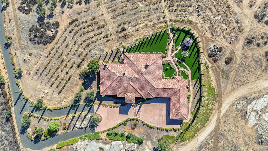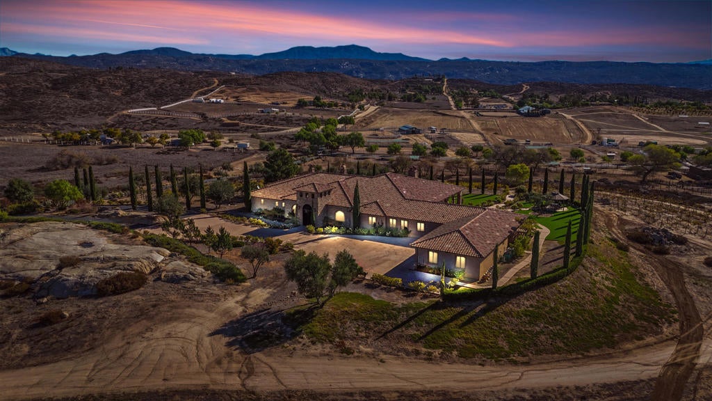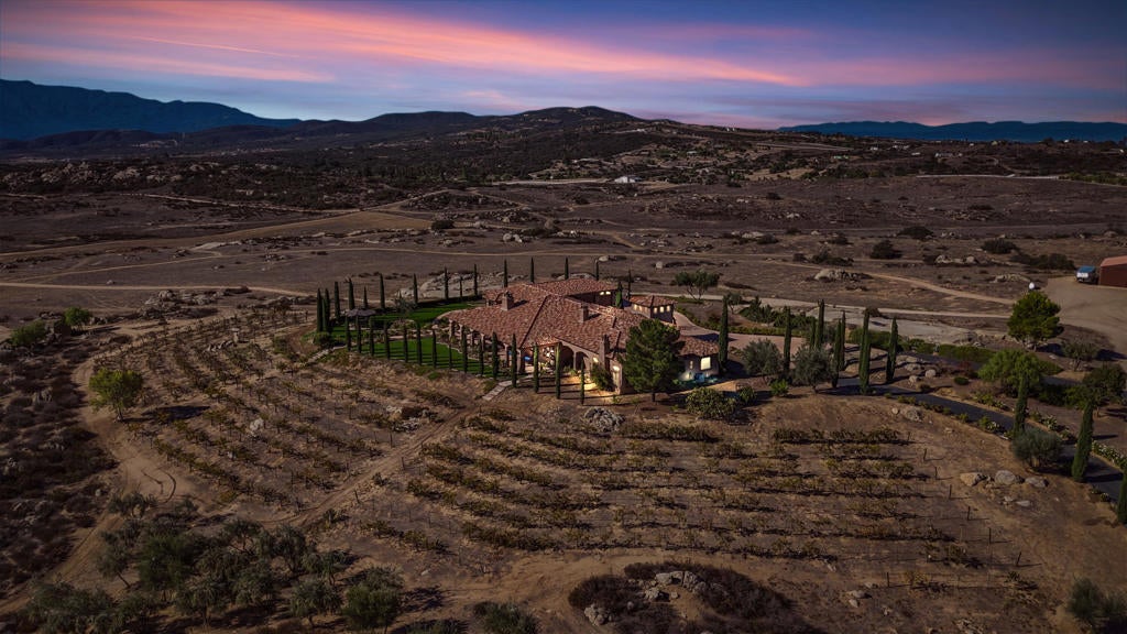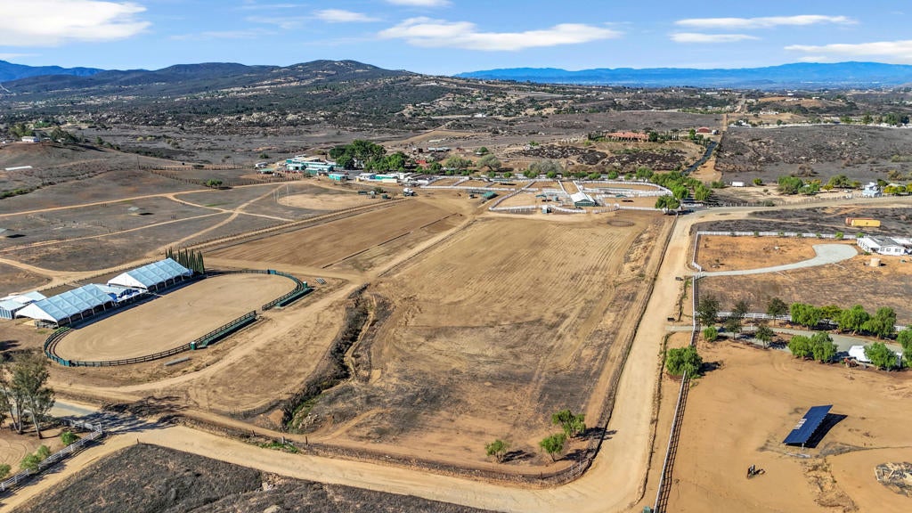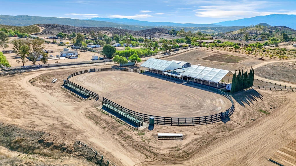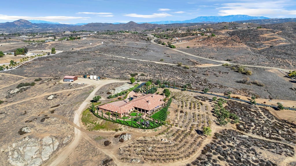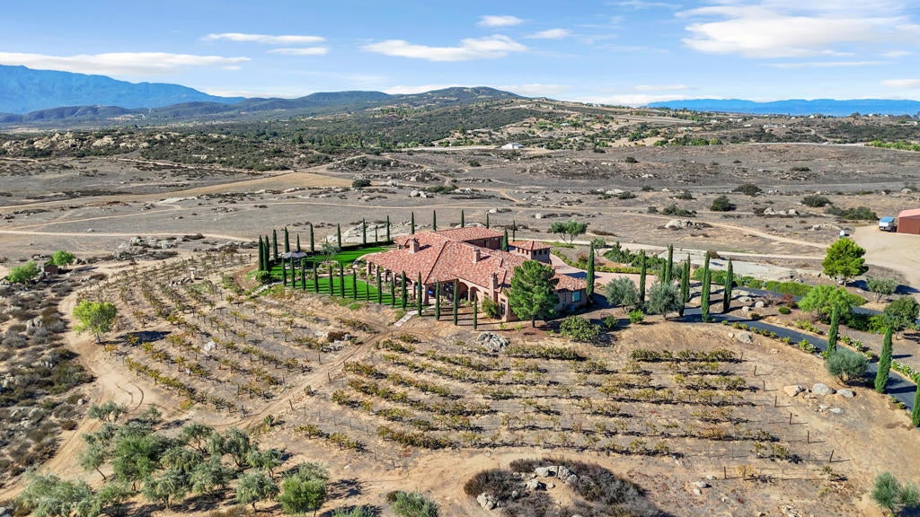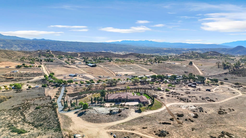 Tuscany meets California wine country! This gorgeous Tuscan inspired home is situated on 122 acres of prime Southern California real estate. The sale included three different APN numbers and parcels . Just a very short drive to the Temecula wine region and situated in the direction the wine region is expanding too! This fantastic estate is currently set up as a full scale equestrian ranch and children's church camp. Operating on a grand scale and hosting many celebrity's over the years, this ranch has brought in large funds for a variety of charities. The main home is perched high up on the hill taking in the surrounding views of mountain ranges and the ranch. The home features a 5 acre private vineyard, a European style rose garden and a magnificent wine tasting room. The interior of the home is appointed with high end woods, tiles and incredible custom mosaics. On the south side of the home is a approx 40 acre parcel that is left in its native state and splendor or can be developed into a vineyard or anything of your liking. The equestrian parcel is 38.41 acres of equestrian bliss! There is a variety of stabling options including a center aisle barn with box stalls, a pipe barn with covers, several small turnouts and other corrals. In addition there are some larger pastures. One smaller arena used for horse shows. There is a large arena built to host polo games with a club house and covered box seating viewing areas. This could host a wide variety of equestrian events including jumping, reined cow horse, barrel racing etc. There are also two large field used as polo fields. Those also could be used for almost any equestrian event or simply made into large pastures, row crops or a vineyard. This ranch truly screams winery, church retreat , horse shows venue or just your own private slice of paradise. There are dorms to sleep 104 children, a recreational clubhouse near the dorms, a hobbit town and a fort town,stabling for 100 horses, and entertainment space that holds 500 at the main arena. There are four homes, offices, a church, museum and numerous other outbuildings to complete your experience. To top it all off there is a large and producing fruit orchard which lends to the abundant farm to table dinners and events that the ranch is able to host. The ranch is being sold fully equipped with tractors, water trucks, horse trailers and everything you need to start operating on day one All is supported by 6 high production wells