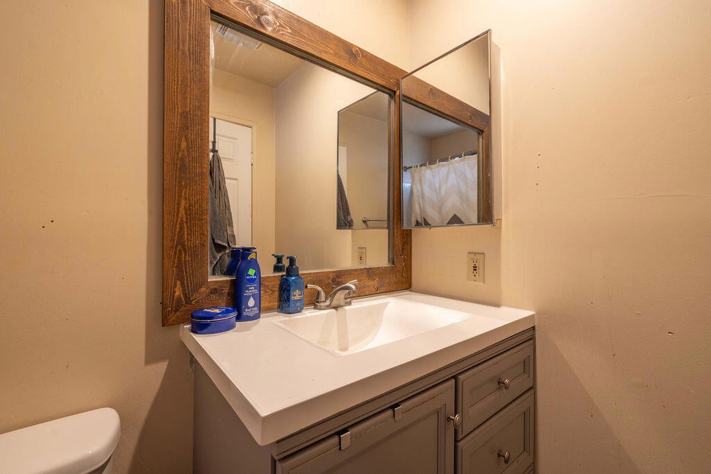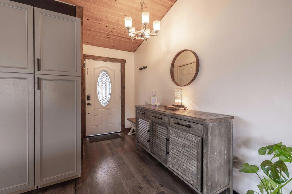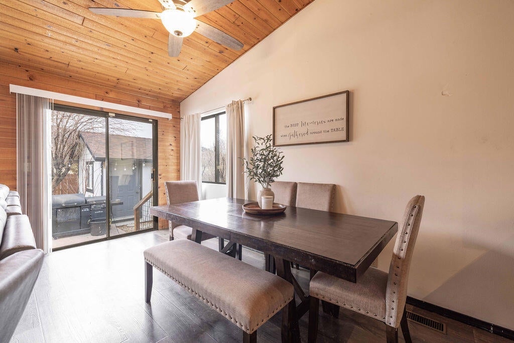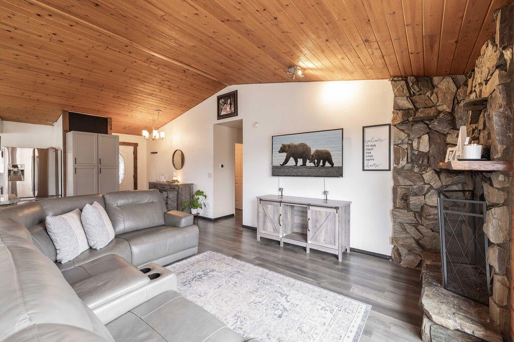 Charming and beautifully remodeled 2-bedroom, 2-bath mountain retreat located in a desirable Big Bear City neighborhood! This inviting home features a large open great room with vaulted ceilings that create a bright and spacious feel throughout the living and kitchen areas. The remodeled kitchen offers granite countertops, stainless steel appliances, and plenty of workspace--perfect for entertaining or everyday living. Both bathrooms have been tastefully updated, and low-maintenance laminate flooring runs throughout the home. Cozy up to the wood-burning fireplace on cool mountain evenings. Recent upgrades include a newer roof, newer water heater, and forced air natural gas heating for year-round comfort. The landscaped yard backs to vacant land, providing added privacy and a peaceful setting. Fenced front and back yards offer space for pets and outdoor enjoyment. Additional highlights include a 2-car attached garage, large stamped concrete driveway with ample parking, and a convenient storage shed. Whether you're looking for a full-time residence, mountain getaway, or investment opportunity, this well-maintained property checks all the boxes.