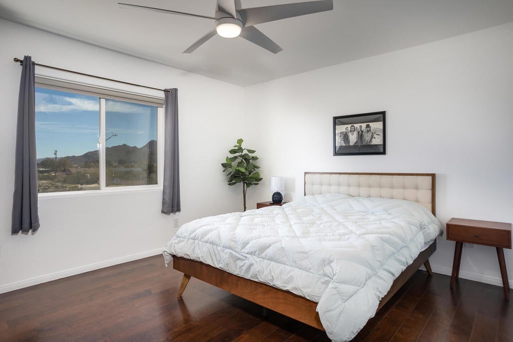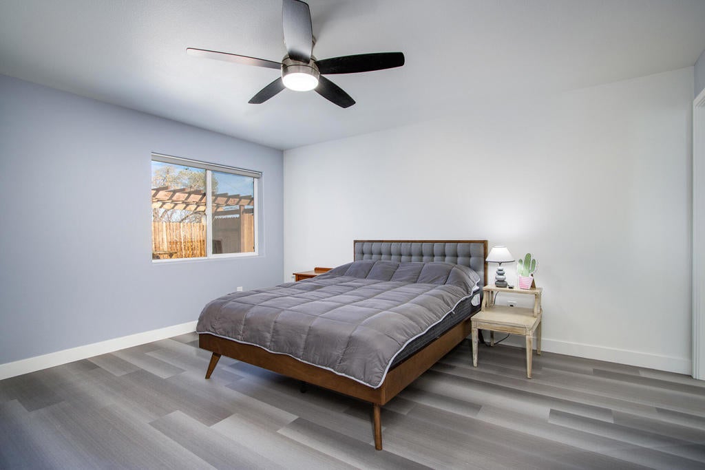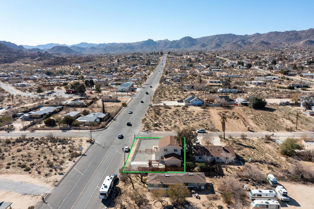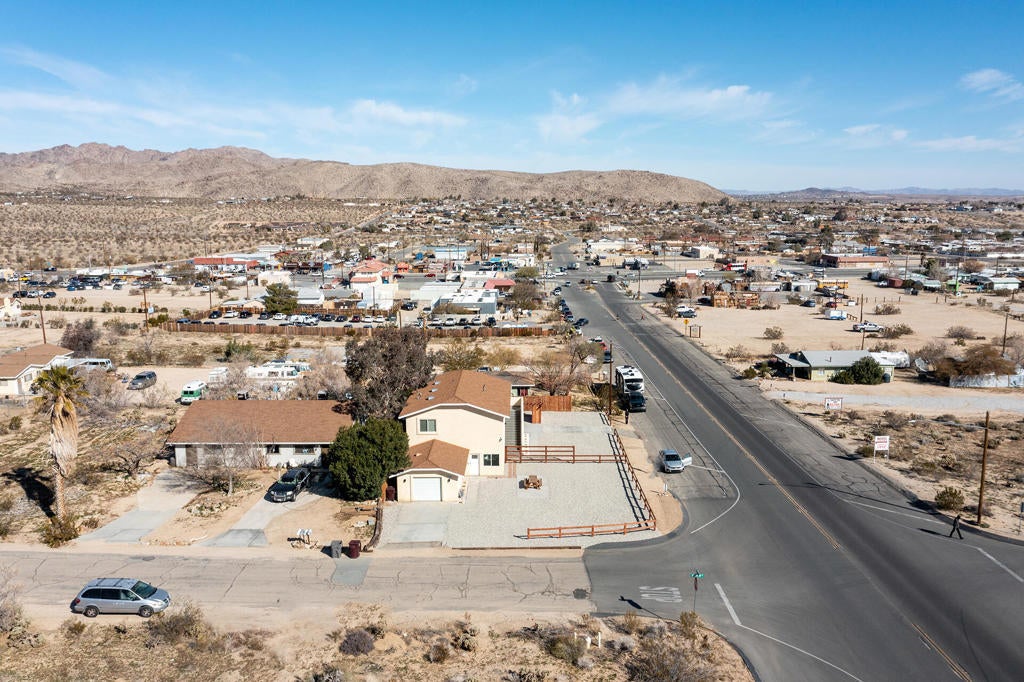 Substantially remodeled duplex in the heart of Joshua Tree Village can't be beat! Short term Airbnb rental permit on property. Each turnkey unit is comprised of 1,120 square feet, 2 bedrooms and 2 full bathrooms and separate, attached 1 car garages. The downstairs unit boasts vinyl flooring through out and modern finishes. The kitchen features white shaker style cabinets, quartz counter tops, stainless steel appliances, and provides access to the private indoor laundry area. The full guest bathroom has a single sink vanity and a walk in shower with glass doors. The primary bedroom also features vinyl flooring, ceiling fan and an on suite bathroom with a single sink vanity with extra counter space and walk in shower. The upstairs unit mimics the floor flan of the downstairs unit with similar finishes. The large yard features tow separate picnic areas, one with a pergola, low maintenance gravel and spectacular views. The close proximity to all of the great restaurants, boutiques, farmers market and main entrance to Joshua Tree National Park is a great location for a short term rental.