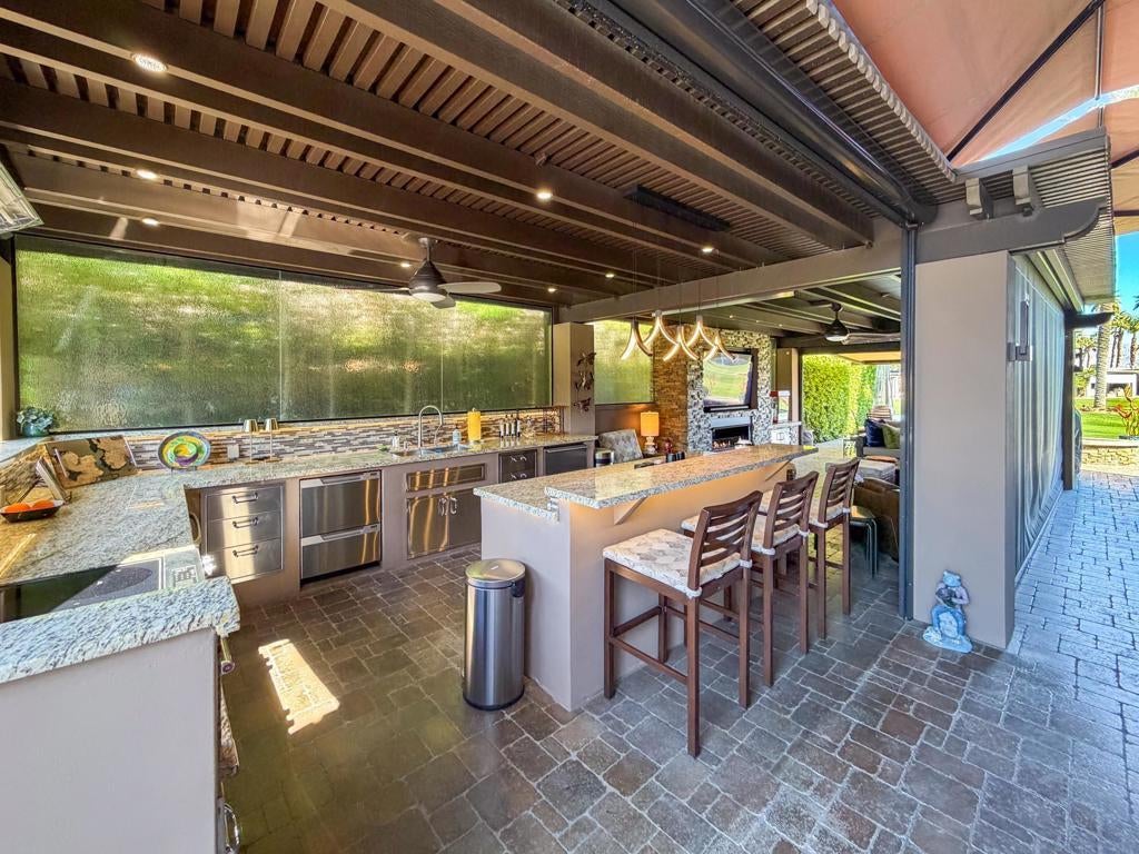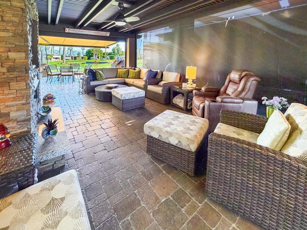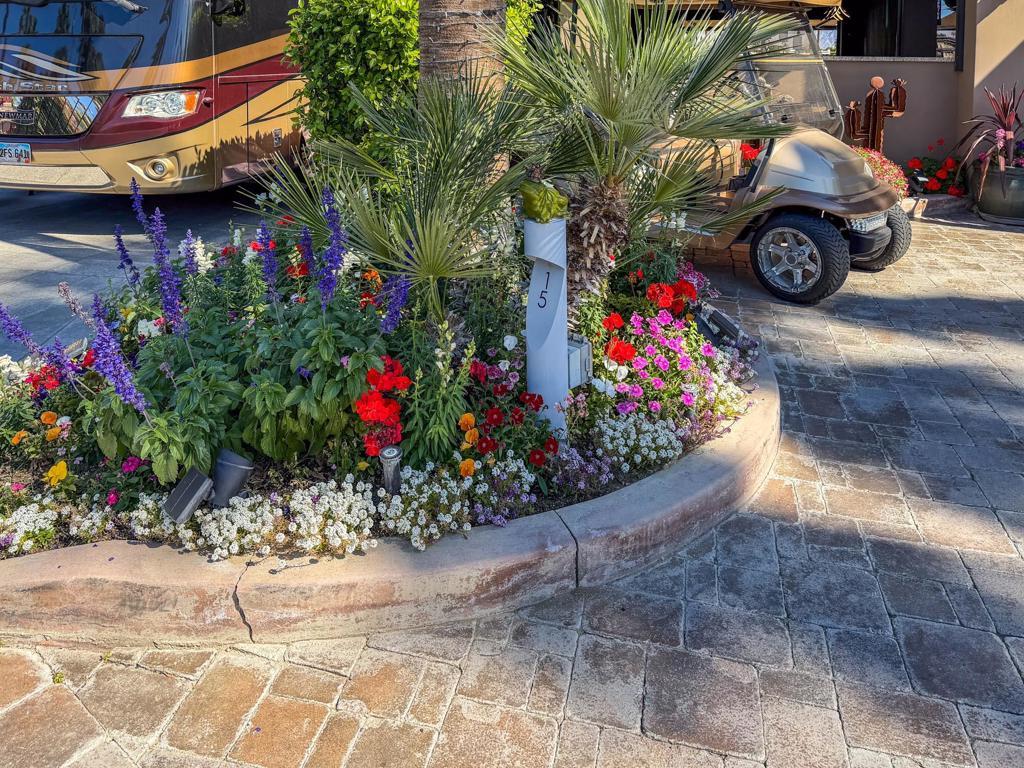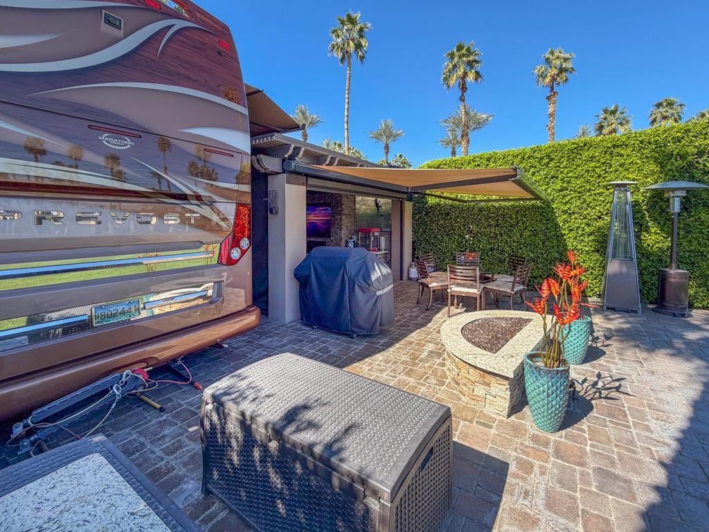 Outdoor Resort Indio is a Class A Motorcoach resort. RV Lot #15 at Outdoor Resort Indio is a high-end golf course view pergola lot offering wonderful sunrises and refined outdoor living in one of ORI's most desirable settings. Designed to park a 45-foot coach, two cars, and a golf cart, this spacious lot blends functionality with upscale finishes.A long pergola features privacy glass along one wall, wraparound electric shades, three radiant heaters, two fans, and layered lighting--including LED kitchen lights, ambient rope lighting around the bar, and pendant fixtures--creating a warm, elegant atmosphere day or night. The expansive granite-countered kitchen includes a large island with built-in bar seating and premium amenities such as a two-drawer refrigerator, two-drawer dishwasher, icemaker, warming drawer, oven, five-burner electric cooktop, dual wine cooler sections, built-in microwave, and abundant stainless storage.A custom-built entertainment center with propane fireplace and protective Shutterwise metal roll-up shutter anchors the living area. At the rear, an 11-foot dimmable, lighted extending awning covers the back patio, complemented by two propane heaters and an outdoor dining table for six near the fireplace--perfect for enjoying early morning sun or relaxed evenings overlooking the golf course. With a built-in remote-controlled propane fire pit and thoughtfully furnished seating areas, Lot #15 delivers elevated luxury in a premier Class A motorcoach setting.