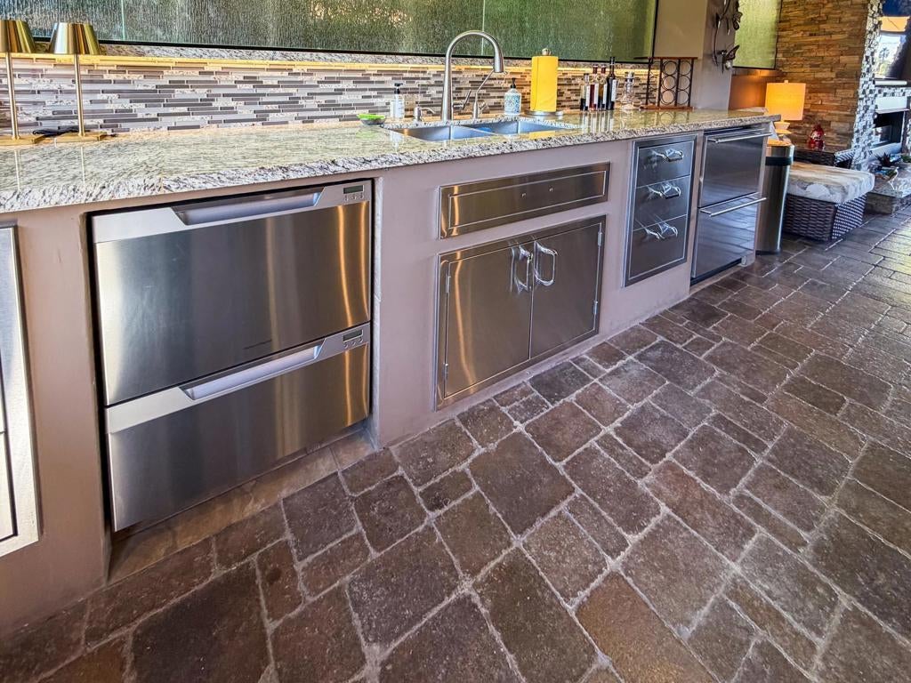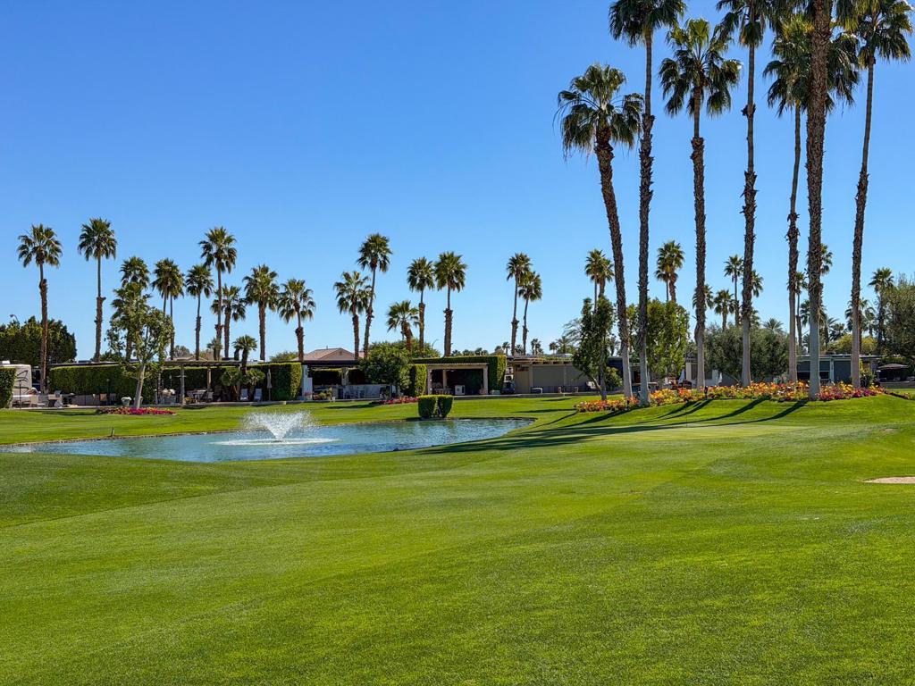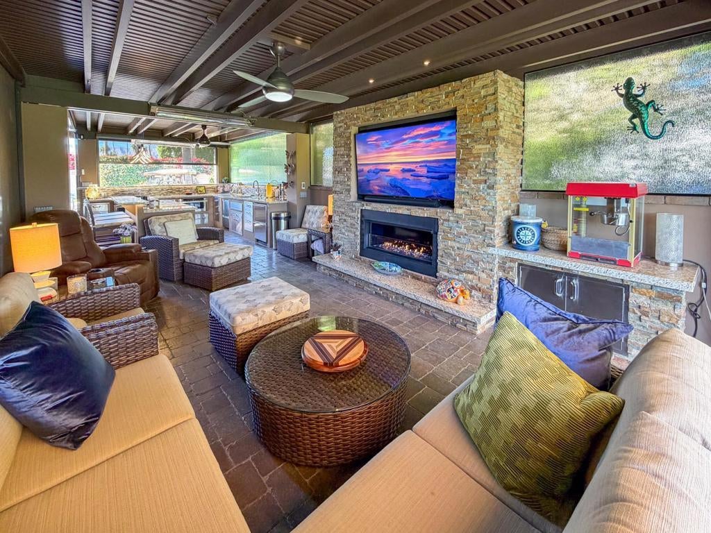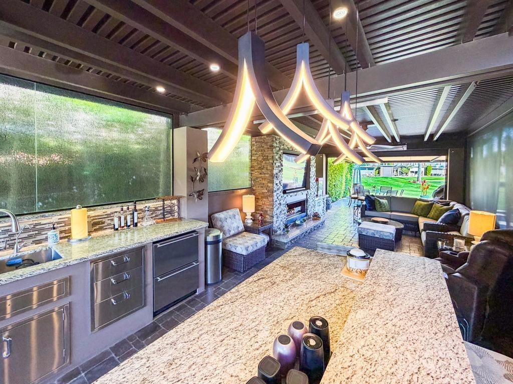 Outdoor Resort Indio is a Class A Motorcoach resort. RV Lot #15 at Outdoor Resort Indio is a high-end golf course view pergola lot offering wonderful sunrises and refined outdoor living in one of ORI's most desirable settings. Designed to park a 45-foot coach, two cars, and a golf cart, this spacious lot blends functionality with upscale finishes.A long pergola features privacy glass along one wall, wraparound electric shades, three radiant heaters, two fans, and layered lighting--including LED kitchen lights, ambient rope lighting around the bar, and pendant fixtures--creating a warm, elegant atmosphere day or night. The expansive granite-countered kitchen includes a large island with built-in bar seating and premium amenities such as a two-drawer refrigerator, two-drawer dishwasher, icemaker, warming drawer, oven, five-burner electric cooktop, dual wine cooler sections, built-in microwave, and abundant stainless storage.A custom-built entertainment center with propane fireplace and protective Shutterwise metal roll-up shutter anchors the living area. At the rear, an 11-foot dimmable, lighted extending awning covers the back patio, complemented by two propane heaters and an outdoor dining table for six near the fireplace--perfect for enjoying early morning sun or relaxed evenings overlooking the golf course. With a built-in remote-controlled propane fire pit and thoughtfully furnished seating areas, Lot #15 delivers elevated luxury in a premier Class A motorcoach setting.