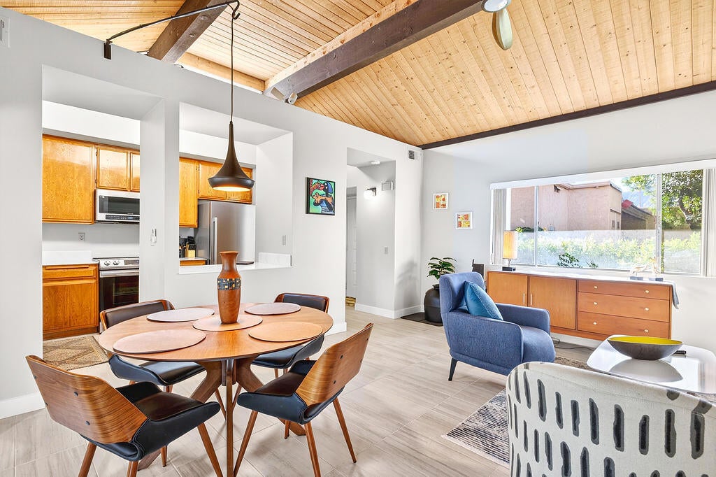 Premier Desert Living in Rancho MirageDiscover an exceptional opportunity to elevate your lifestyle in this premium end-unit at back of complex, designed with the privacy and spaciousness of a single-family home. From the sleek all-tile flooring to the stainless steel appliances, every corner reflects tasteful modern upgrades.Interior HighlightsArchitectural Charm: Soaring vaulted beamed ceilings create an airy, light-filled atmosphere in the main living area.Indoor-Outdoor Flow: Dual sliders open to an expansive, ultra-private jumbo patio--perfect for entertaining or quiet desert evenings.Serene Master Suite: Features a large walk-in closet and direct access to the patio.Premium Features & LocationRare Convenience: Includes a private two-car garage located just steps from your front door.Picturesque Views: Overlooks lush lawns and mature fruit trees, framed by the small mountain that defines the community.Resort Amenities: Enjoy access to sparkling pools, relaxing spas, and tennis courts.Value: You own the land (Fee Land) in a prime Rancho Mirage location near the desert's best activities, dining and shopping.Don't miss out--properties with this unique combination of features are a rare find. Book your showing today!