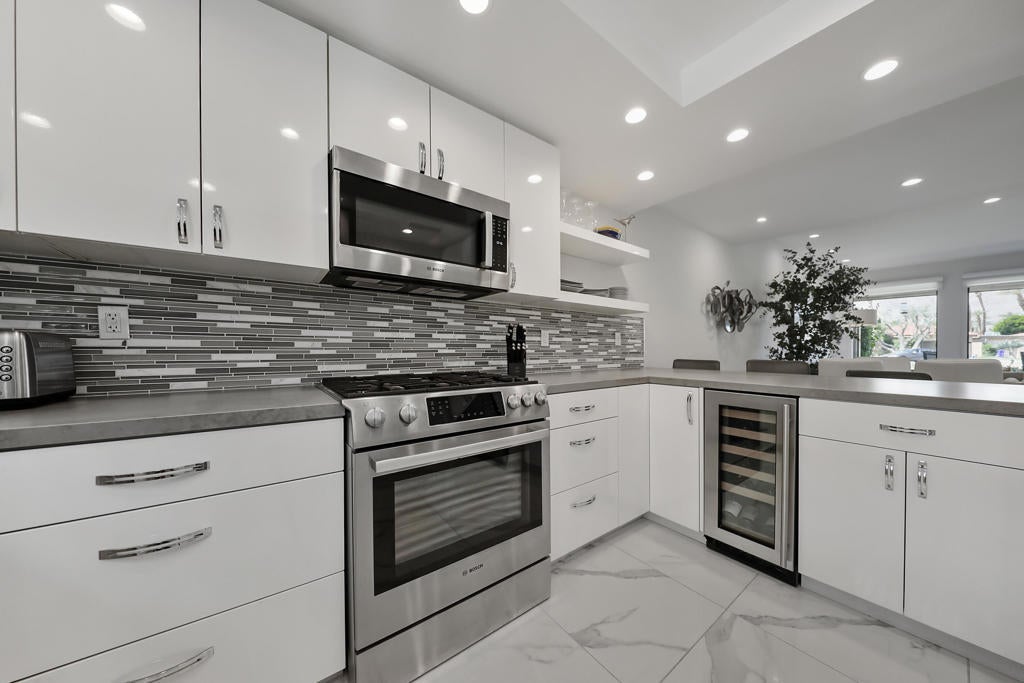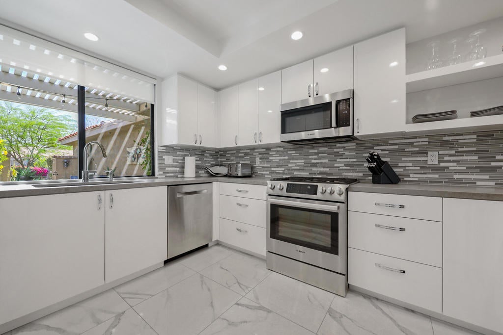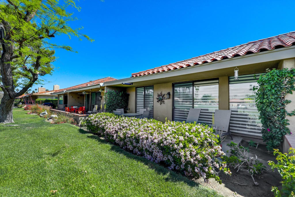 Experience the charm of Sunrise Country Club with this beautifully upgraded 2-bedroom, 2-bath Granada floor plan. Enjoy unobstructed mountain and golf course views from your back patio and a private courtyard, complete with a lovely outdoor eating area and firepit. The home features a one-car garage with access to a golf cart, along with a newer washer and dryer. The kitchen boasts top-of-the-line appliances, including a built-in wine cooler, while the remodeled bathrooms showcase newer cabinets and plumbing fixtures. All furniture is thoughtfully designed to maximize floor space.Sunrise Country Club is a guard-gated community offering 746 residential condos, an 18-hole par 64 golf course, 9 championship tennis courts, 10 pickleball courts, 21 swimming pools/spas, and a clubhouse with a dining room, lounge, grille, golf/tennis pro shops, and a fitness/activity center. Additionally, there are 2 new bocce ball courts. Located in the heart of Rancho Mirage, the community is close to major shopping, entertainment, and health facilities, with Palm Springs International Airport just 20 minutes away.AVAILABLE OCTOBER 2025 AND APRIL 2026