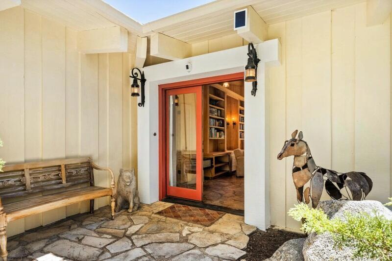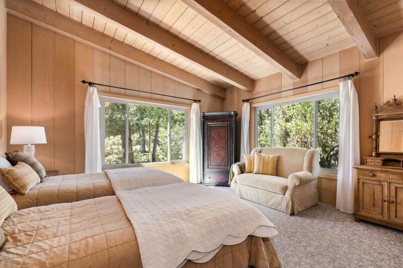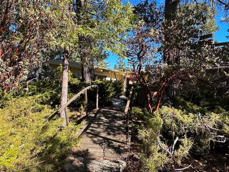 Perched atop a mountain ridge is a single-story, mid-century executive retreat offering a wall of windows showcasing majestic mountain tops and iconic Lily Rock. From the circular drive, winding pathways, over a garden bridge, lead through the mature landscape to the double glass door entry. Wide wood planks cover most of the over 3,700 sq. ft. The open-concept design provides a seamless flow between great room spaces, beneath vaulted, big beamed and wood ceilings. The massive stone hearth is the focal point and source of warmth on winter nights. Jenn-Air range, Sub-Zero refrigerator, wine fridge, abundant counter space and cabinets, a chef's delight. Featuring dual primary suites, each with its own ensuite bath, the home provides luxury, privacy and comfort. There is a third additional bedroom with bath. A private guest quarter, with kitchen and bath, has a separate entry, offering independence. An inviting deck, bordered by faux grass, leads to a wood barrel sauna looking out to serene star filled skies. There is a two car garage with workshop space for the project oriented. Definitely worth a look and consideration for blending luxury with the tranquility of mountain life.