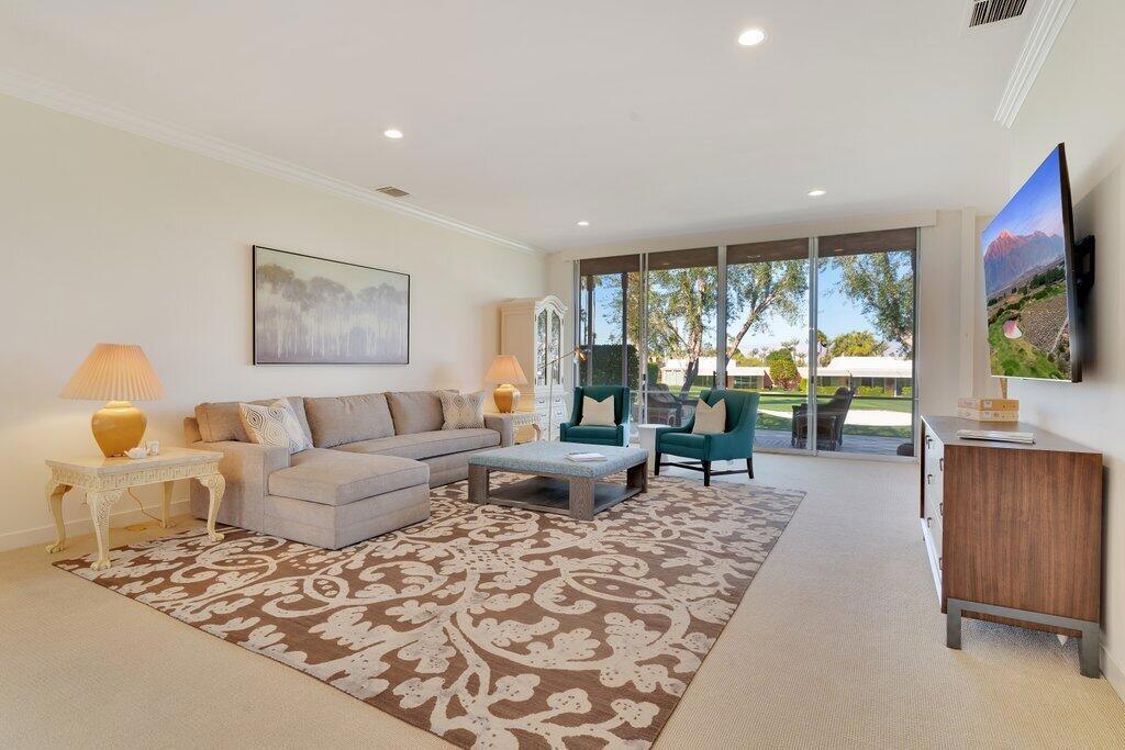 This stylishly furnished villa is spacious, light-filled, and cheerful, with gorgeous fairway and mountain views. Located within the iconic gated community of Marrakesh Country Club, known for John Elgin Woolf's Hollywood Regency design. Spacious living, dining and kitchen areas, along with 2 bedrooms, a den, and 3 baths. The primary ensuite sits along the golf course with a mature hedge shielding the terrace for privacy. The second ensuite opens to the enclosed courtyard. The den is located off a private hallway with a bath. From the elegant living and dining areas, the terrace, framed by olive trees, overlooks the 12th green and northerly mountain views, making it ideal for outdoor enjoyment. Rental includes use of golf cart, two Como electric bikes, and weekly cleaning of patio. Club amenities include an 18-hole executive course, 14 pools and spas, tennis, fitness, bridge and clubhouse with fine dining. 30 - 90 day minimum stay depending on time of year. Social and Golf membership opportunities are available to tenants for use of the facilities and may be added at additional cost. Close to the fine dining & shopping on El Paseo Drive.