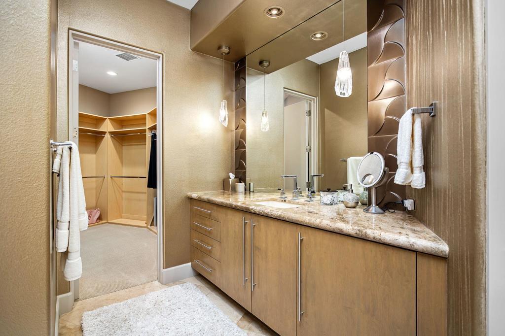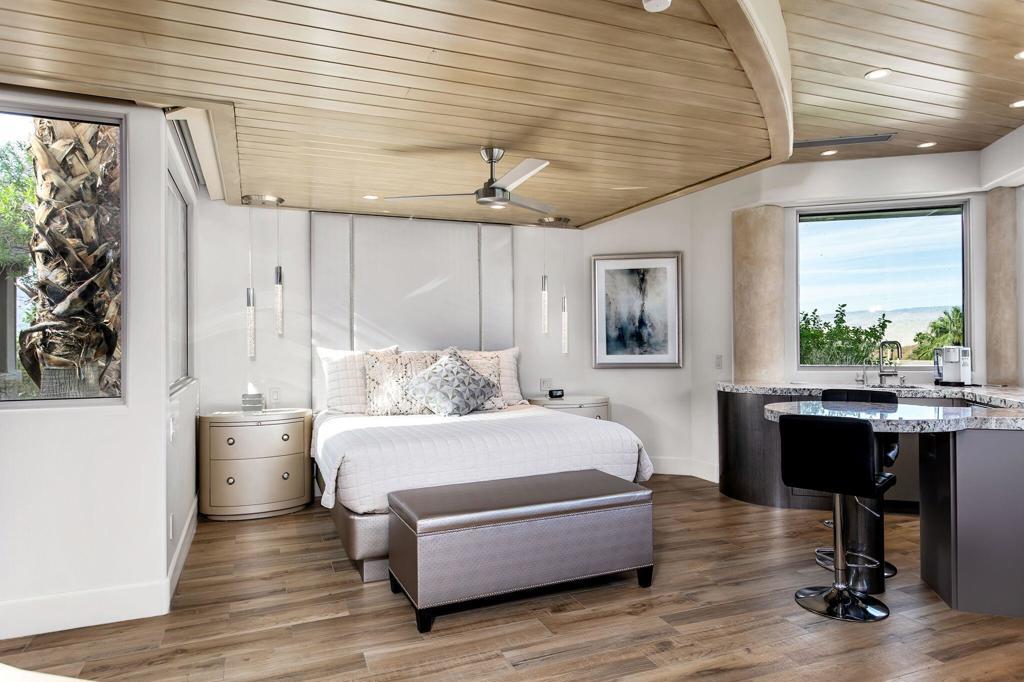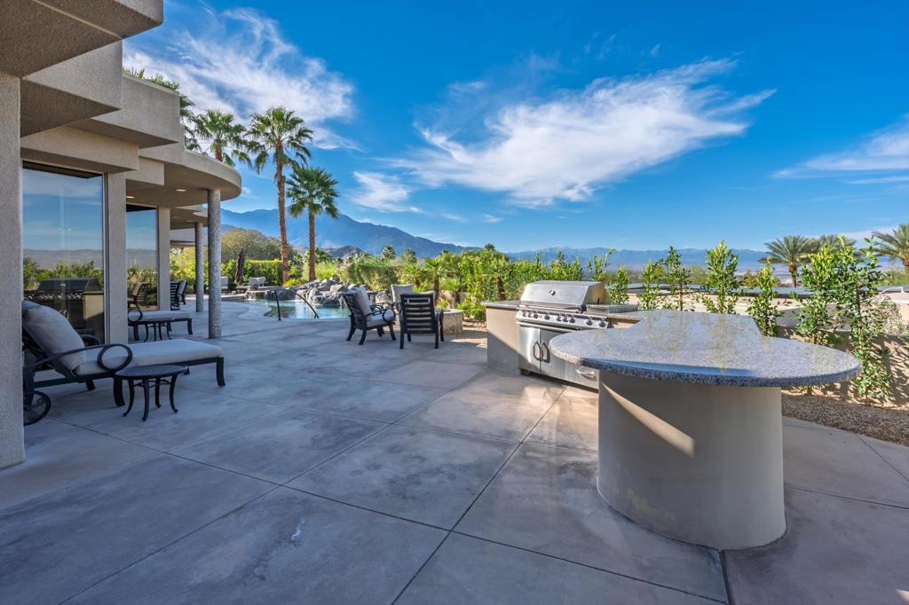 Discover architectural excellence in this custom contemporary estate by Steven DeChristopher Jr., located within the prestigious guard-gated community of Mirada Estates in Rancho Mirage, California. Privately positioned on over half an acre, this striking luxury residence captures panoramic mountain, valley, and city light views while offering an exceptional blend of modern design and resort-style living, including a detached guest casita. A dramatic bridge-style driveway entry with a tranquil waterfall immediately sets the tone. Inside, marble flooring flows throughout the main living areas, complemented by elegant finishes and clean contemporary lines. The grand foyer opens into an impressive great room anchored by a breathtaking custom fireplace, creating a bold architectural focal point ideal for entertaining. The formal dining area connects seamlessly to a sophisticated wet bar featuring a bar refrigerator and Scotsman ice maker. The adjoining family room is enhanced by advanced media systems and full smart-home integration, with Sonos audio and individual room volume controls throughout the property for effortless control and ambiance. A dedicated wine tasting cellar adds to the home's entertainer appeal, while the chef's stainless steel kitchen offers a generous center island, beverage drawers, counter seating, and a separate butler's kitchen for additional prep and storage space. The primary suite serves as a private retreat, complete with its own fireplace, expansive dual walk-in closets, and a spa-inspired bath featuring an oversized shower with dual shower heads. Outdoor living is nothing short of spectacular. The resort-style backyard features a custom saltwater pool with raised spa and rock waterfall, built-in BBQ center, fire pit lounge, and multiple gathering areas designed to capture sweeping desert vistas. The detached casita provides privacy and flexibility for guests, enhanced by a fireplace and mounted outdoor television for elevated entertaining. Additional highlights include a fully air-conditioned three-car garage with epoxy flooring and access to exclusive amenities associated with the nearby The Ritz-Carlton Rancho Mirage. This is a rare opportunity to own a Steven DeChristopher Jr. contemporary masterpiece in one of Rancho Mirage's most sought-after luxury communities--where architecture, smart technology, privacy, and breathtaking views come together in perfect balance.