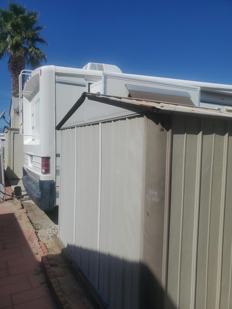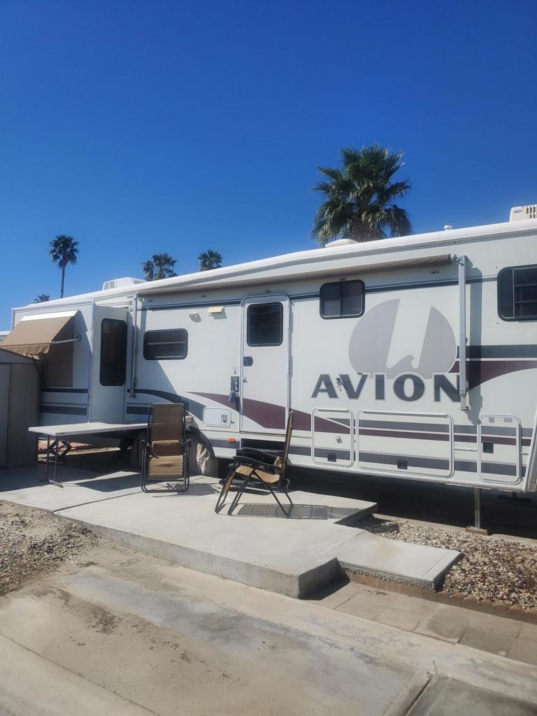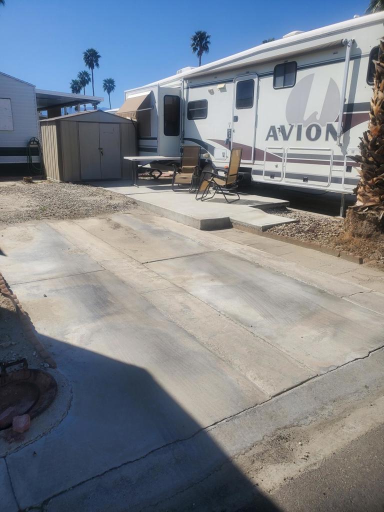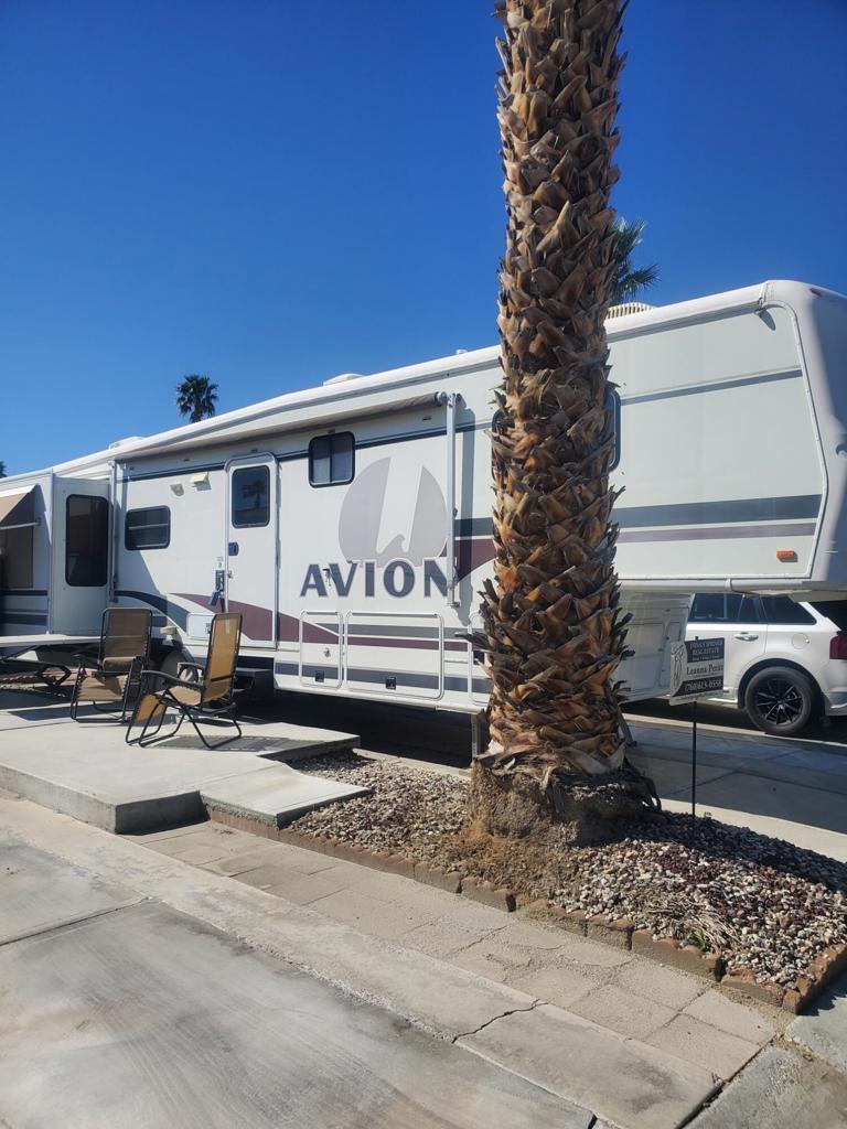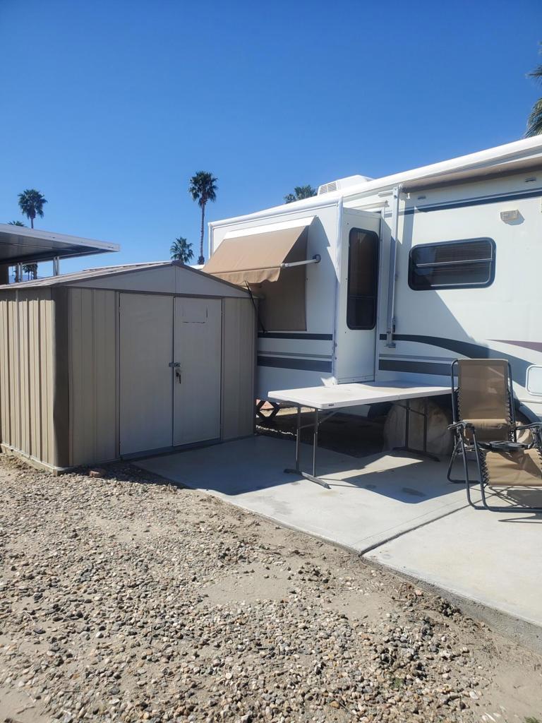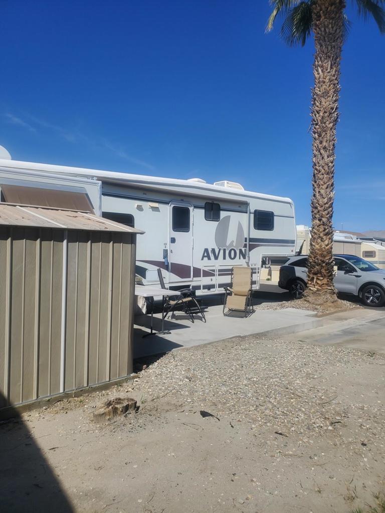 Happy Wanderer DBA Indio Springs RV Park is a gated community YOU OWN THE LAND.This park is a 55 plus community The Lot has a 1997 AVIOT 5th wheel on it. it is included in the price of the property. ''AS IS WERE IS''. It is able to be moved but is hooked into the Water/Sewer/Electrical. It features 1 bedroom 1 bath with 2 tip outs one in the living room and the bedroom. Very nice clean unit. It has a concrete patio and a shed on the lot. The RV park per HOA guidelines only allows you to live in the unit or lease it out 9 months per calendar year. HOA are $307.00 per month which includes water, trash, basic cable , internet. Plus you pay the property tax each year for the land. RV is licensed through the DMV. The park has a clubhouse ,library, card room, several activities during the season. Pickleball, tennis ,putting green, 2 community pools and 1 spa. it is close to banking, gas stations, grocery stores, Starbucks and the Casino.