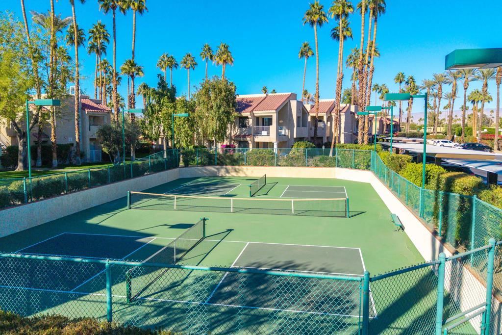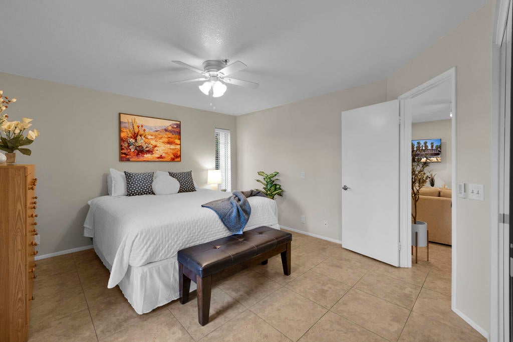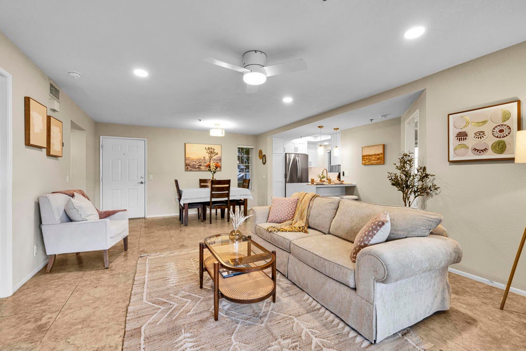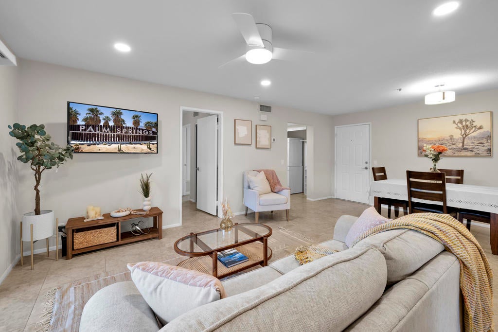 MAJOR PRICE IMPROVEMENT AND PRICED TO SELL!! Best value in sought-after South Palm Springs! Located in highly desirable south Palm Springs--away from airport traffic and wind--this freshly remodeled two-bedroom, two-bath condo sits in the charming, snowbird-friendly community of Esprit. Recently painted in a soothing palette of light beige and white, the home features updated recessed LED lighting with dimmers, a sleek new living-room ceiling fan, and a timeless dining fixture.The custom two-toned fully redone kitchen is both stylish and functional, offering soft-close shaker cabinets with pullouts, brand-new never-used LG ThinQ stainless appliances, white quartz counters with silver specks, an expanded waterfall-edge breakfast bar, and a marble backsplash.The open floor plan maximizes space, with two well-sized ensuite bedrooms. The primary bathroom includes a new vanity with quartz counters and plenty of storage while the guest bathroom has dual sinks, updated faucets, new shower head and glass shower door. Throughout the home, new white horizontal and vertical blinds add a clean, modern touch.Enjoy two patios--one off the living room and another off the primary bedroom. The neutral beige tile flooring runs seamlessly throughout the unit. Tucked quietly at the back of the community, this ground-level corner end unit offers exceptional privacy with no shared walls.Sold partially furnished with a well-stocked kitchen, this move-in-ready home makes it easy to settle in and start enjoying everything Esprit and Palm Springs have to offer.
