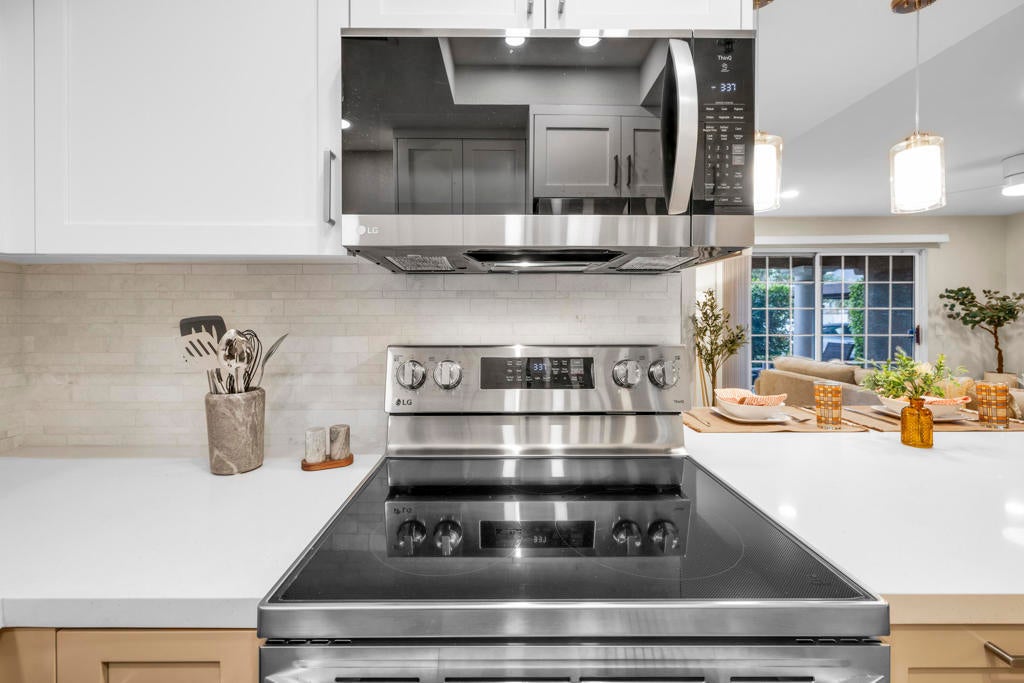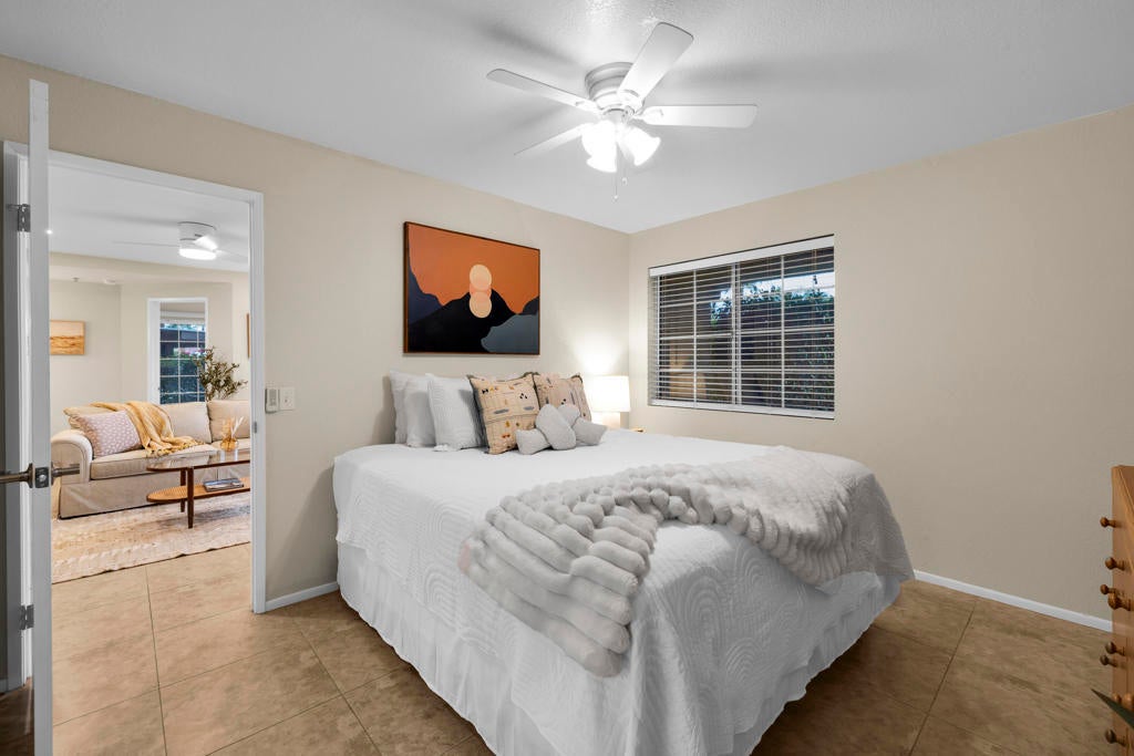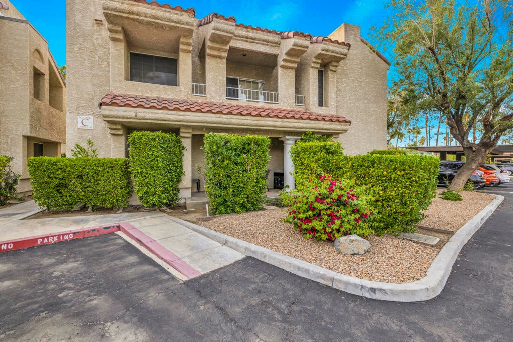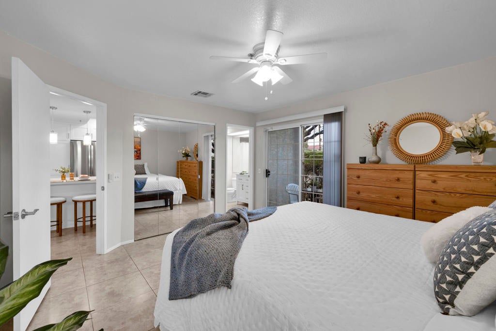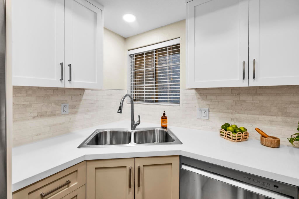 MAJOR PRICE IMPROVEMENT AND PRICED TO SELL!! Best value in sought-after South Palm Springs! Located in highly desirable south Palm Springs--away from airport traffic and wind--this freshly remodeled two-bedroom, two-bath condo sits in the charming, snowbird-friendly community of Esprit. Recently painted in a soothing palette of light beige and white, the home features updated recessed LED lighting with dimmers, a sleek new living-room ceiling fan, and a timeless dining fixture.The custom two-toned fully redone kitchen is both stylish and functional, offering soft-close shaker cabinets with pullouts, brand-new never-used LG ThinQ stainless appliances, white quartz counters with silver specks, an expanded waterfall-edge breakfast bar, and a marble backsplash.The open floor plan maximizes space, with two well-sized ensuite bedrooms. The primary bathroom includes a new vanity with quartz counters and plenty of storage while the guest bathroom has dual sinks, updated faucets, new shower head and glass shower door. Throughout the home, new white horizontal and vertical blinds add a clean, modern touch.Enjoy two patios--one off the living room and another off the primary bedroom. The neutral beige tile flooring runs seamlessly throughout the unit. Tucked quietly at the back of the community, this ground-level corner end unit offers exceptional privacy with no shared walls.Sold partially furnished with a well-stocked kitchen, this move-in-ready home makes it easy to settle in and start enjoying everything Esprit and Palm Springs have to offer.