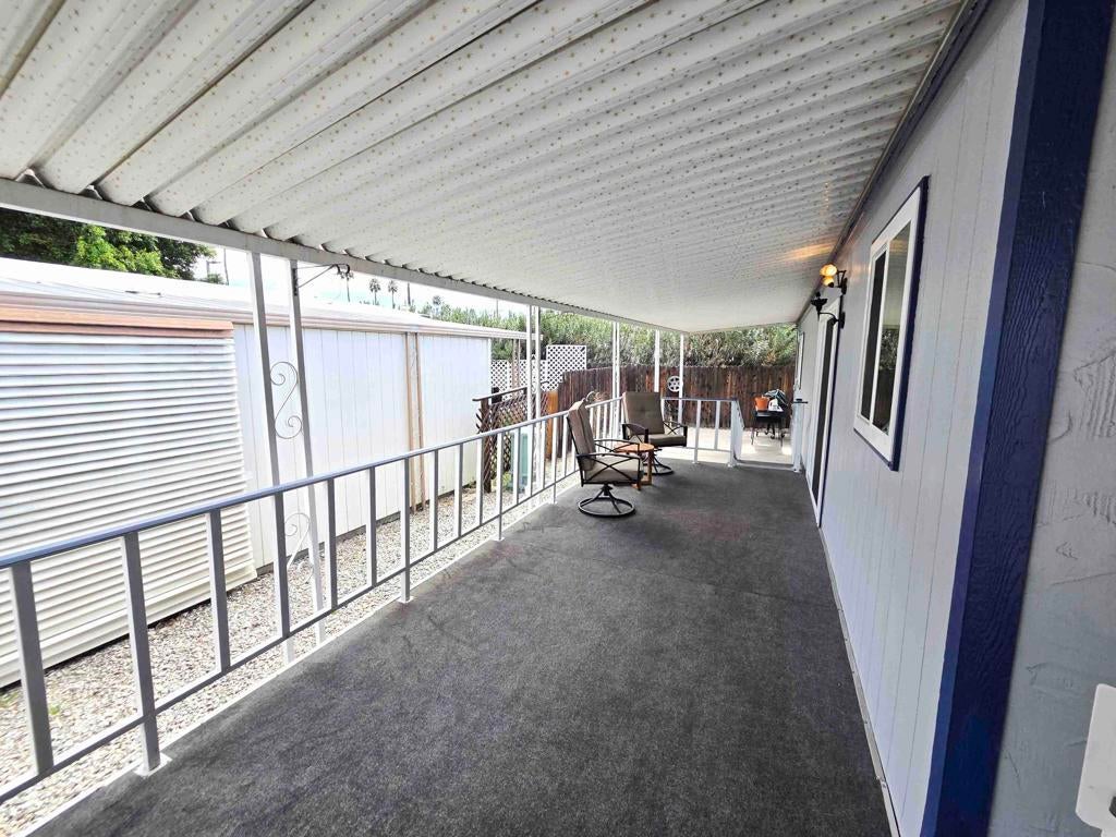 This 1976 Baron home, a 1,344-square-foot, two-bedroom, two-bath residence, is located on a perimeter lot in the Royal Palms Manufactured Home Community, a 55-or-better development. The entrance to the home is via the east-facing, covered deck, which opens into the living room, which spans the 24-foot width of the house. Two large north-facing picture windows let in ample light, brightening the space. A dining room, complete with a built-in hutch, is open to the living area. The circular kitchen, with a gas cooktop, a gas wall oven, a dishwasher, and a newer stainless-steel refrigerator, has a convenient layout and the original butcher-block-style counters. Sliding glass doors in the family room also lead to the east-facing deck and the south-facing concrete slab patio. The guest bedroom is currently outfitted with a queen-size adjustable bed. Its ensuite three-quarter bath is also accessible from the laundry room. At the rear of the house is the primary bedroom, an impressively sized space complete with a remodeled three-quarter bath. The windows and sliding glass doors are newer and dual-pane. Space rent for 362 Buffalo is $893 per month, and park approval is required. Call today for your private showing.
