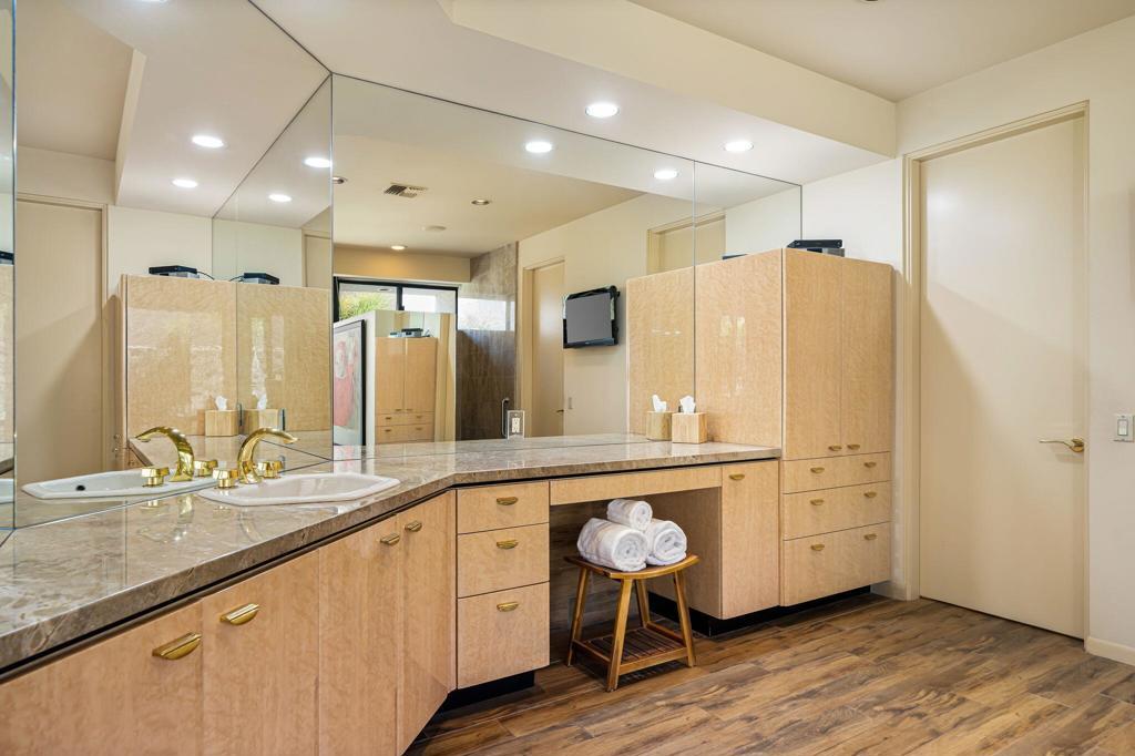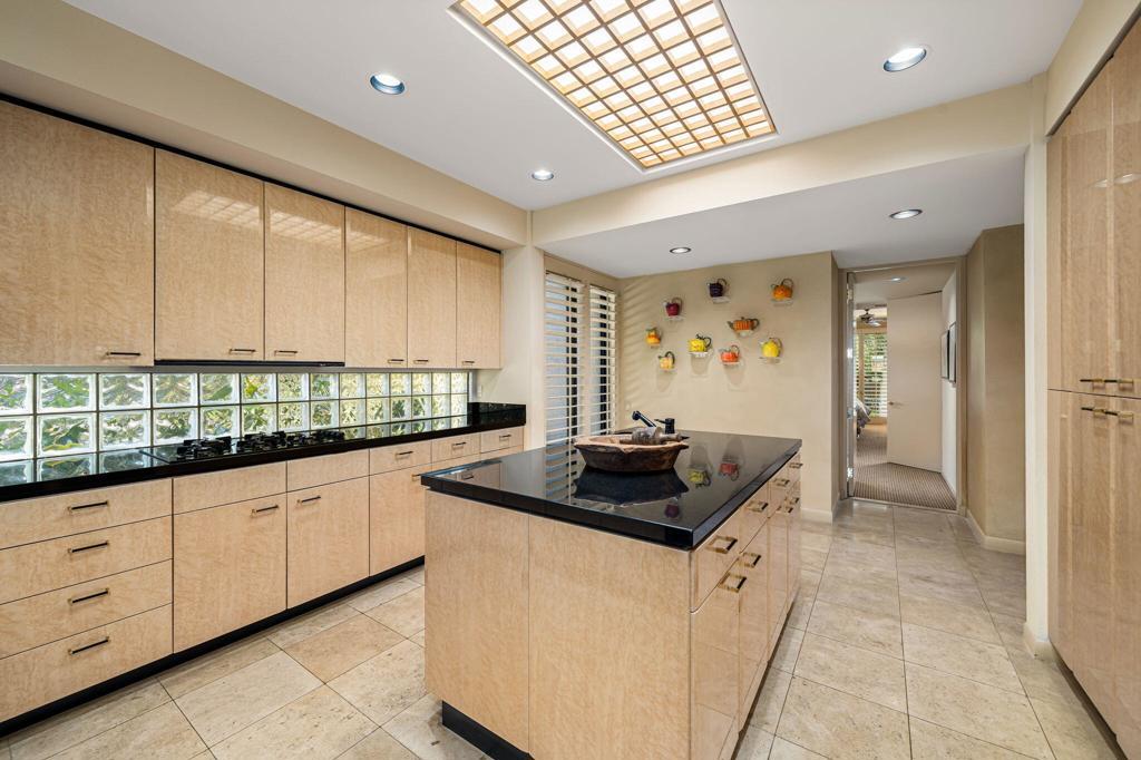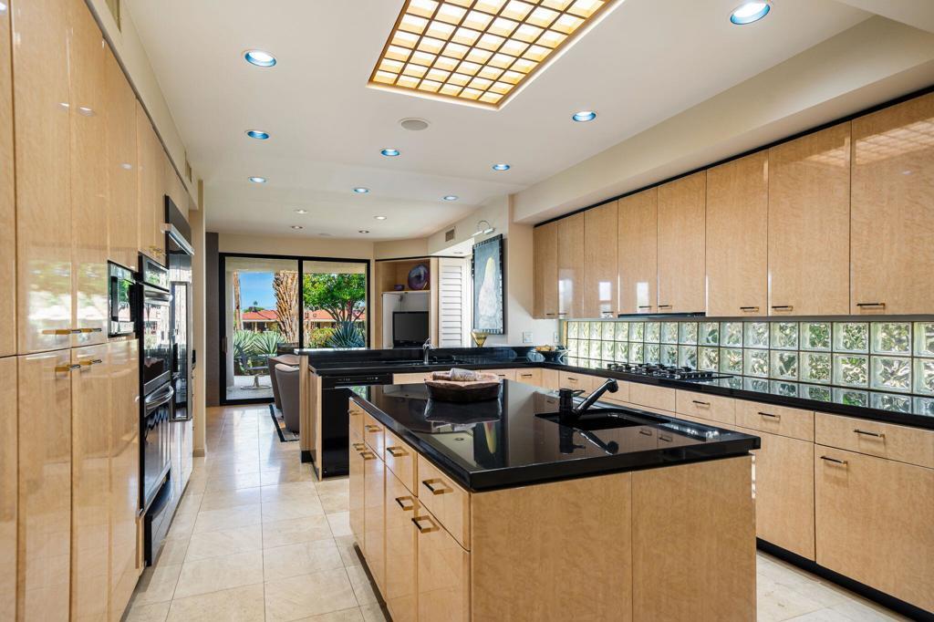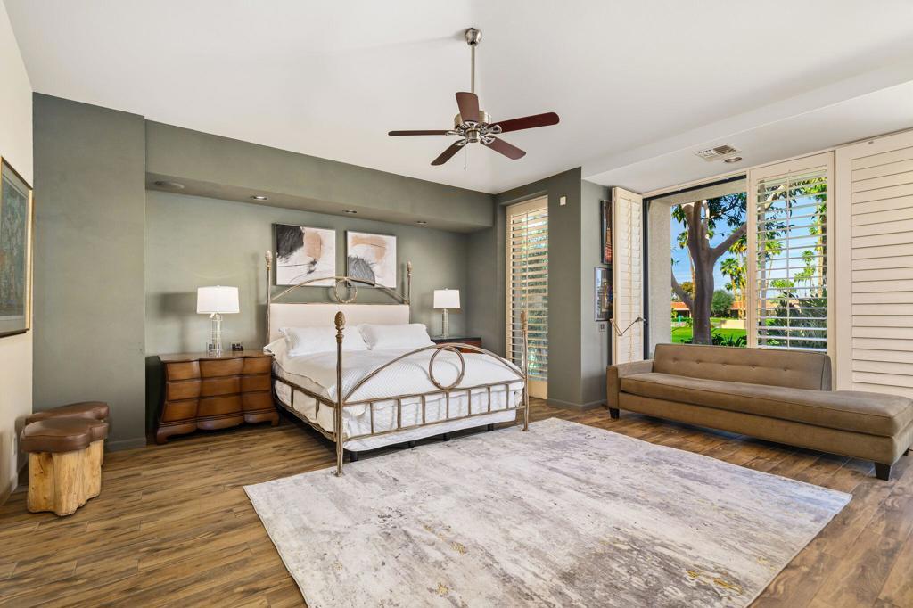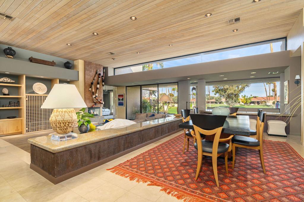 Nestled against the foothills of the stunning Eisenhower Mountains in Indian Wells is the private double-gated community of Cove Pointe Circle. This elegant condominium lives like a single-family residence. Enter through large double solid-metal doors into a light, bright, and airy open great room where dramatic soaring light-wood ceilings are framed by clerestory windows showcasing the surrounding mountain peaks--creating a level of elegance typically only seen in multi-million-dollar homes.The open great room features custom shelving, a fireplace, formal dining area, and an oversized wet bar equipped with a mini wine fridge, wine cooler, and ice maker, with bay windows overlooking the golf course. The kitchen offers beautiful light cabinetry, stunning black granite countertops, a large island, a newer KitchenAid refrigerator, pantry, and breakfast nook with access to a quaint outdoor seating area.Two en-suites are located on one end of the property while the primary suite is privately situated on the opposite end, creating both privacy and comfort. The primary suite features a seating area, fireplace, grand windows with golf course views, and access to an outdoor patio. The primary bath includes a jetted tub, walk-in shower, two independent closets, and access to a serene inner garden offering a peaceful zen escape.Well-curated electric blinds and plantation shutters are featured throughout the home. A two-car garage plus a full-size golf cart garage offers ample storage and a split A/C unit to keep your private collection cool year-round.Enjoy effortless desert living--skip the maintenance and cost of a private pool and simply walk across to the community pool and spa. Or relax at home on the expansive covered patio with built-in BBQ overlooking the 16th fairway of Indian Wells Country Club. Opt for the country club lifestyle as you desire, with the IWCC clubhouse just a short golf cart ride away.Positioned on the first lot behind the gates, this elevated location offers deep golf course views--the value is truly in the location. Indian Wells residents enjoy exclusive golf and dining discounts, and the home is located within the IID district, providing significantly reduced electric rates.