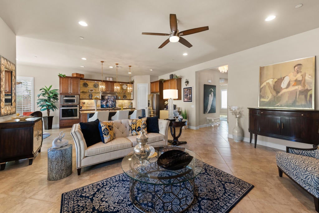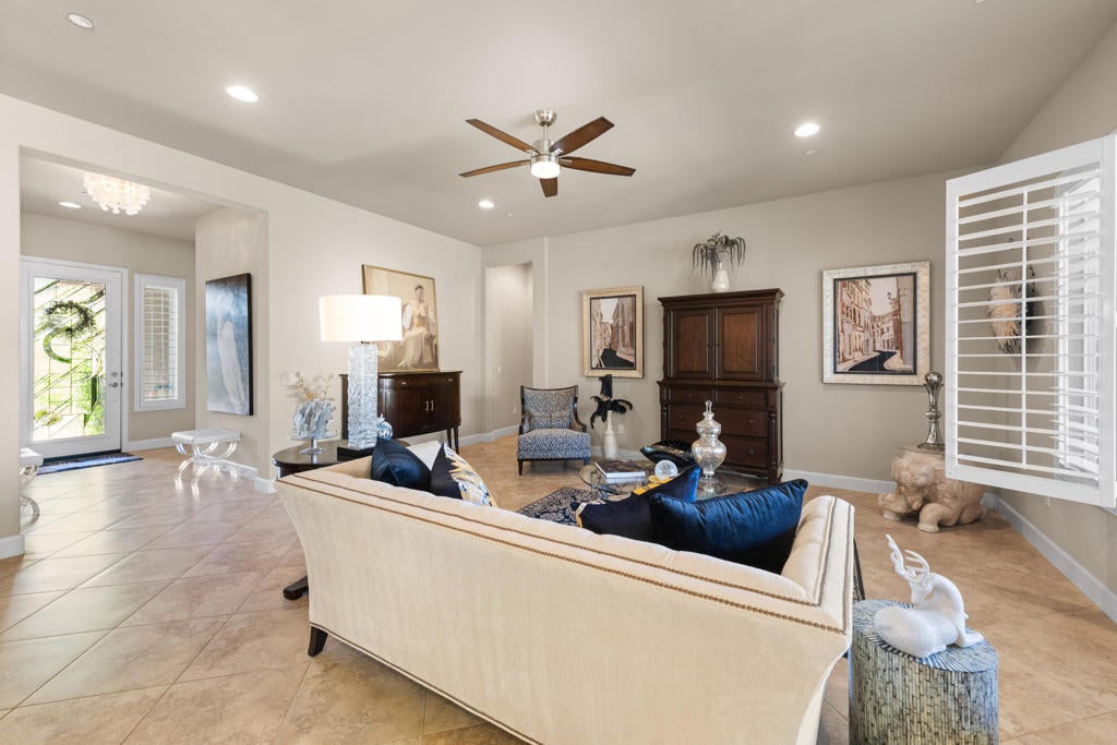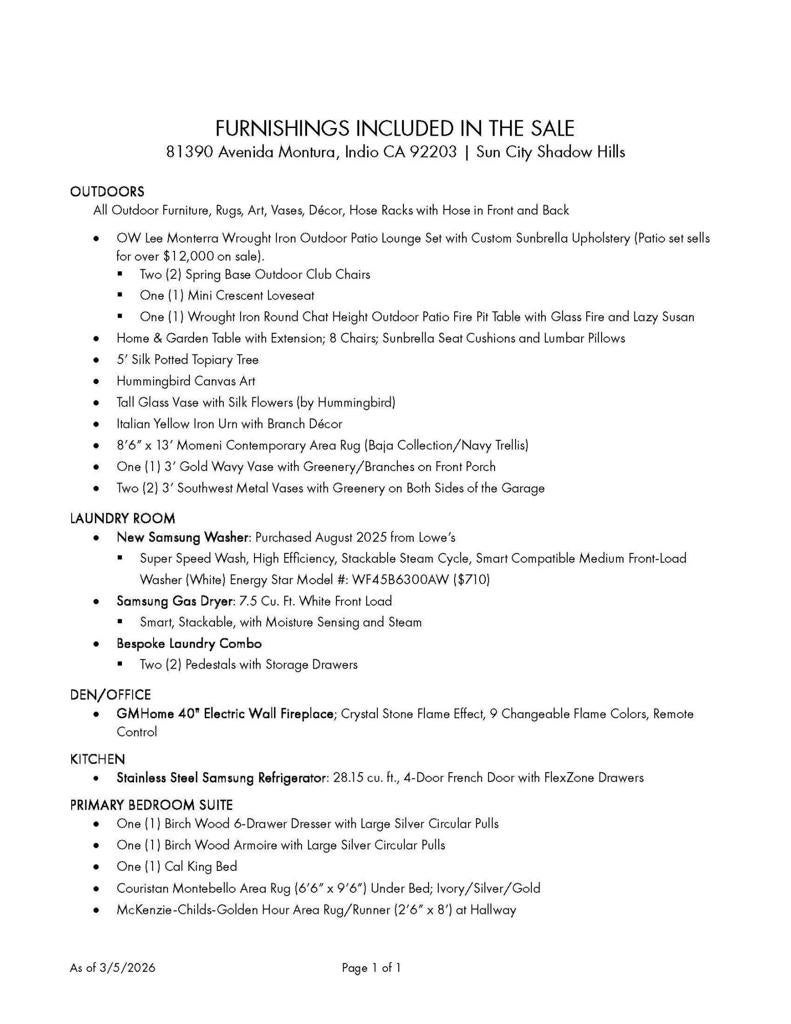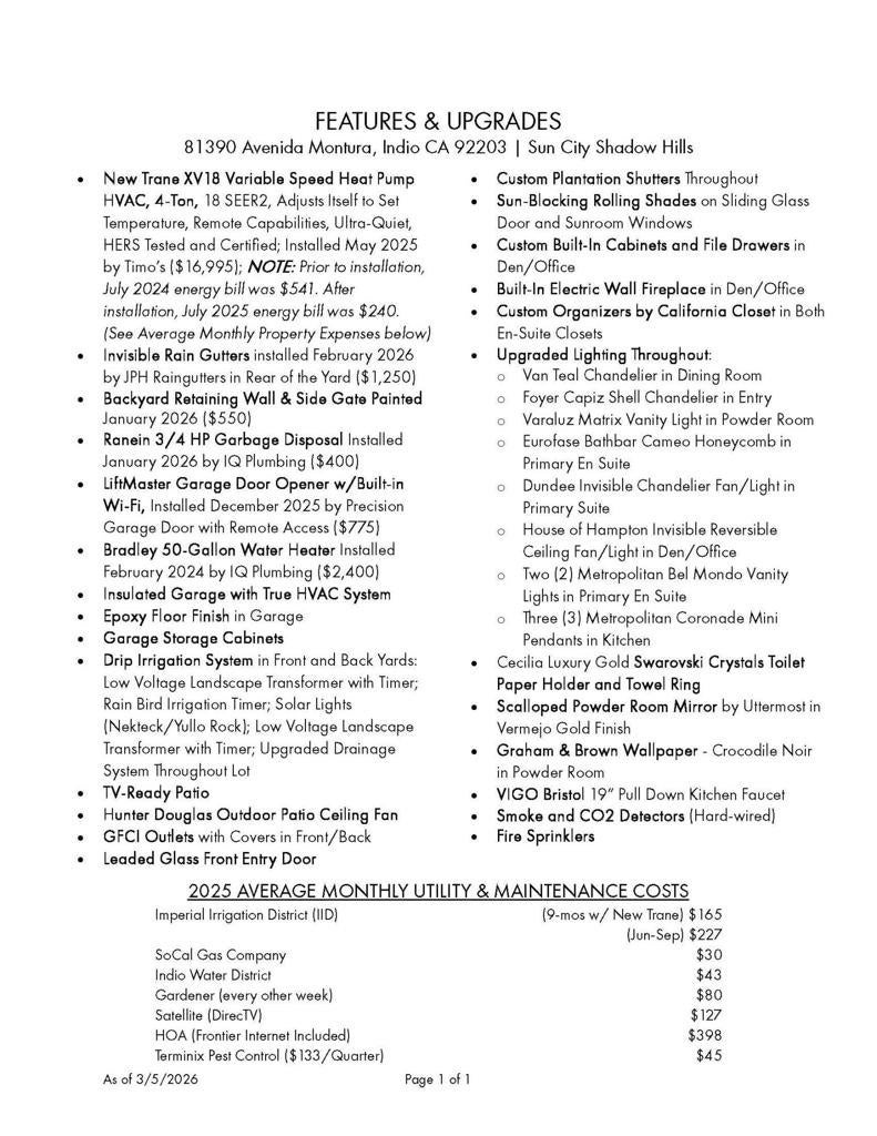 Experience elevated desert living in this highly upgraded, energy-efficient Retreat model with SUNROOM EXTENSION, POWDER ROOM, and GOLF CART GARAGE in Del Webb's premier 55+ resort community of Sun City Shadow Hills. Offered PARTIALLY FURNISHED per inventory, this move-in ready home is ideally located in the newest section of Phase 3 near the Santa Rosa clubhouse, and with no rear neighbors it offers exceptional privacy, open sky views, breathtaking desert stargazing, and continuous bird watching. Enjoy your morning coffee relaxing on the comfortable OW Lee designer patio furniture included in the sale of the property and sip your evening wine gathered around the glass firepit with family and friends. This cozy veranda offers outdoor desert living at its finest. In the summer months, duck into the cool indoors to enjoy the new upgraded HVAC system with precise temperature control and quiet operation. The new TRANE XV18 variable-speed heat pump (2025) will provide peace of mind year-round generating very low energy costs (Summer IID Average: $227 2025 versus $445 2024). The interior showcases Italian porcelain tile set on the diagonal, PLANTATION SHUTTERS, 10-foot-high ceilings, upgraded lighting, and designer sun shades. The gourmet kitchen shines with granite slab countertops, stainless appliances, and custom open shelving. Both bedrooms feature luxurious en-suite baths and CUSTOM CLOSET ORGANIZERS by California Closets, while the Den features an in-wall FIREPLACE and custom built-in cabinetry, perfect for use as a home office. Installed in 2026, the following system upgrades include: garbage disposal; invisible rain gutters; garage door opener; freshly painted side gate/rear wall, and a newer water heater (2024). The insulated garage offers a true Trane A/C and heat, epoxy flooring, built-in cabinetry, and golf cart space. Outside, enjoy low-maintenance desert landscape enhanced with low voltage lighting, an expanded covered patio w/upgraded drainage system, all in a serene private setting ideal for relaxing or entertaining. MOVE-IN READY, this beautifully maintained home is the perfect blend of comfort, style, and easy desert living. Residents of Sun City Shadow Hills enjoy resort-style amenities including golf, pools, fitness, pickleball, and more--just minutes from Palm Springs dining, shopping, and entertainment.
