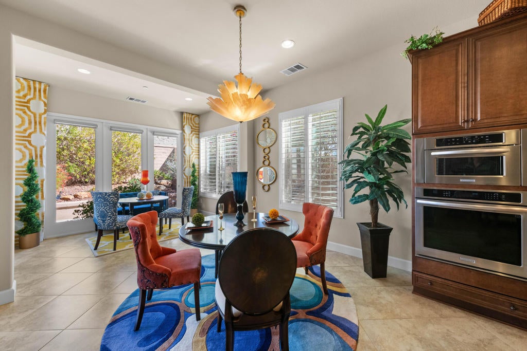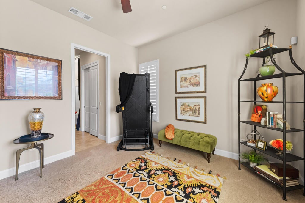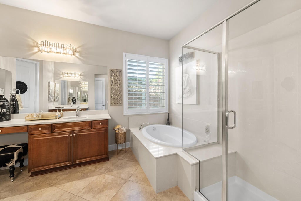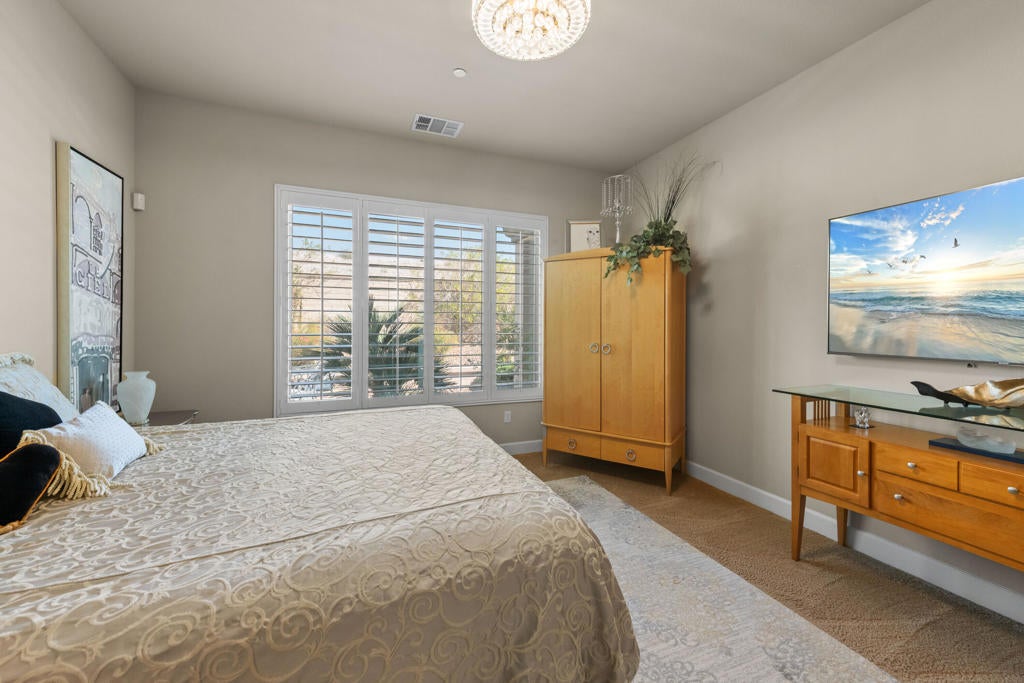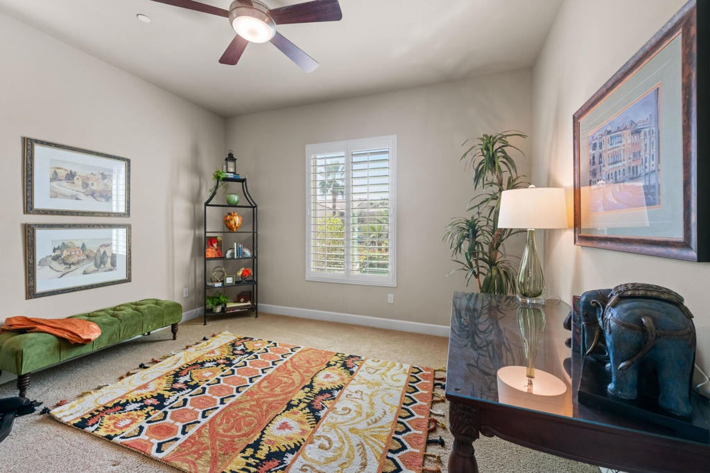 Experience elevated desert living in this highly upgraded, energy-efficient Retreat model with SUNROOM EXTENSION, POWDER ROOM, and GOLF CART GARAGE in Del Webb's premier 55+ resort community of Sun City Shadow Hills. Offered PARTIALLY FURNISHED per inventory, this move-in ready home is ideally located in the newest section of Phase 3 near the Santa Rosa clubhouse, and with no rear neighbors it offers exceptional privacy, open sky views, breathtaking desert stargazing, and continuous bird watching. Enjoy your morning coffee relaxing on the comfortable OW Lee designer patio furniture included in the sale of the property and sip your evening wine gathered around the glass firepit with family and friends. This cozy veranda offers outdoor desert living at its finest. In the summer months, duck into the cool indoors to enjoy the new upgraded HVAC system with precise temperature control and quiet operation. The new TRANE XV18 variable-speed heat pump (2025) will provide peace of mind year-round generating very low energy costs (Summer IID Average: $227 2025 versus $445 2024). The interior showcases Italian porcelain tile set on the diagonal, PLANTATION SHUTTERS, 10-foot-high ceilings, upgraded lighting, and designer sun shades. The gourmet kitchen shines with granite slab countertops, stainless appliances, and custom open shelving. Both bedrooms feature luxurious en-suite baths and CUSTOM CLOSET ORGANIZERS by California Closets, while the Den features an in-wall FIREPLACE and custom built-in cabinetry, perfect for use as a home office. Installed in 2026, the following system upgrades include: garbage disposal; invisible rain gutters; garage door opener; freshly painted side gate/rear wall, and a newer water heater (2024). The insulated garage offers a true Trane A/C and heat, epoxy flooring, built-in cabinetry, and golf cart space. Outside, enjoy low-maintenance desert landscape enhanced with low voltage lighting, an expanded covered patio w/upgraded drainage system, all in a serene private setting ideal for relaxing or entertaining. MOVE-IN READY, this beautifully maintained home is the perfect blend of comfort, style, and easy desert living. Residents of Sun City Shadow Hills enjoy resort-style amenities including golf, pools, fitness, pickleball, and more--just minutes from Palm Springs dining, shopping, and entertainment.
