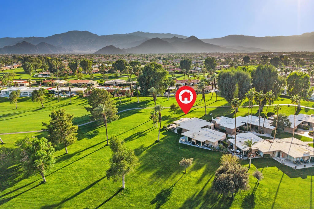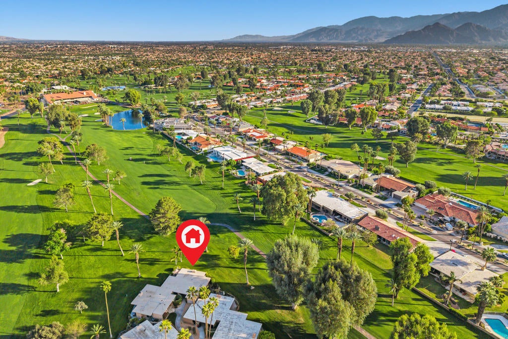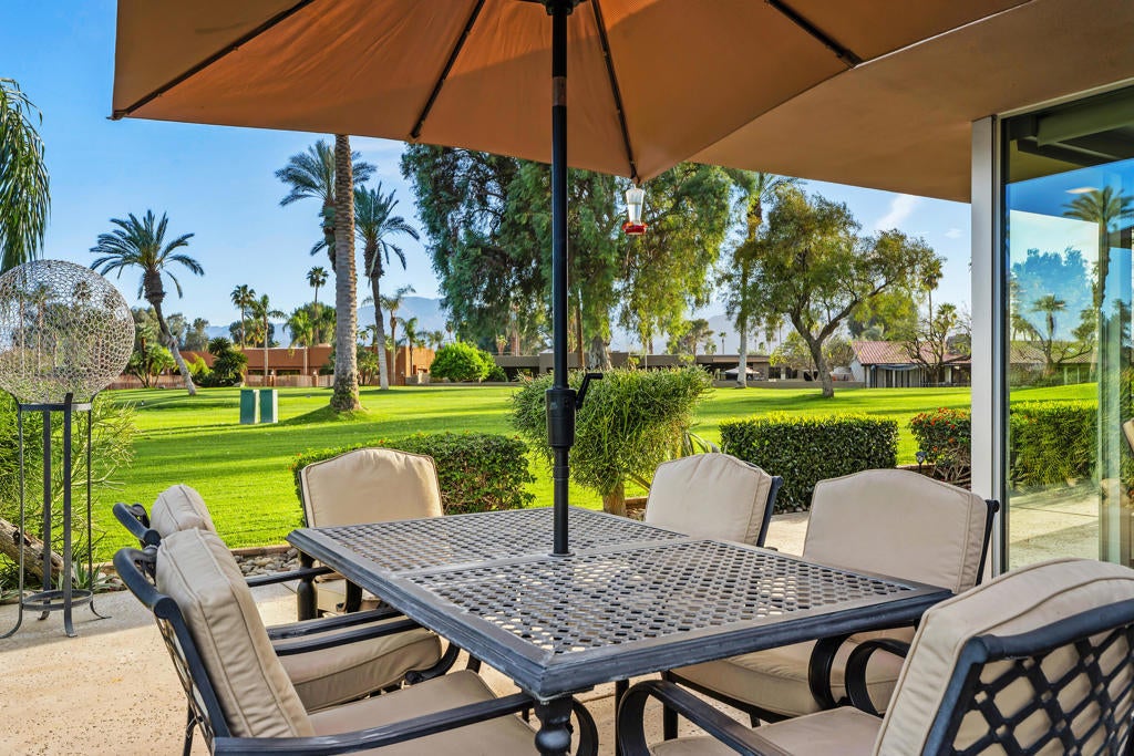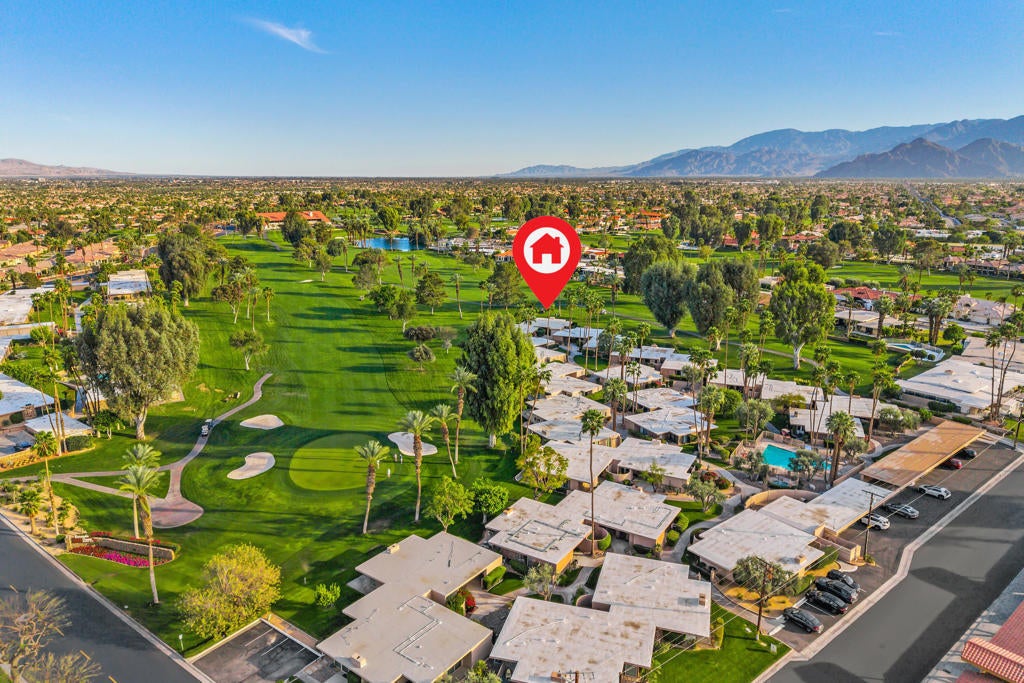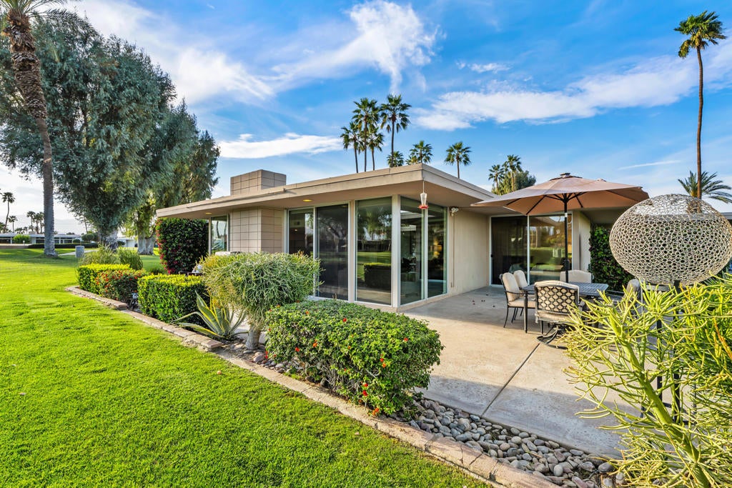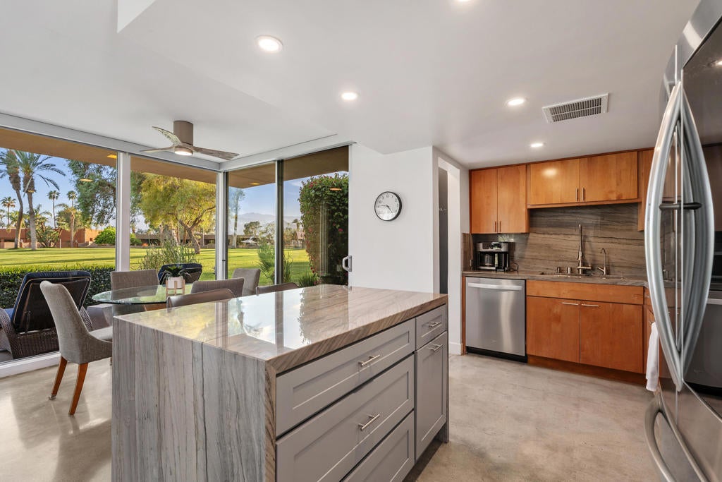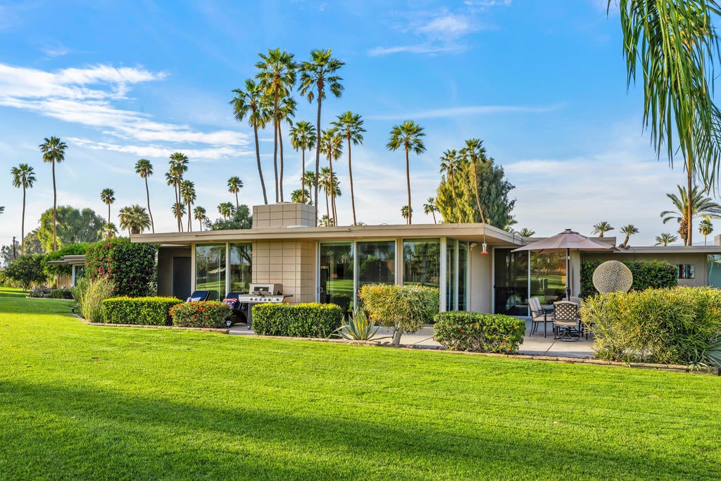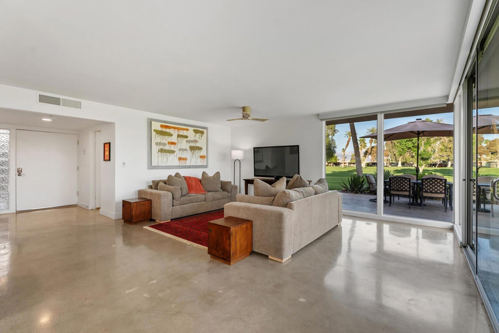 Welcome to the Fairway Villas! Experience classic desert living in this beautifully upgraded mid-century modern 2-bedroom, 2-bath condo located inside the gates of Bermuda Dunes Country Club. Perfectly positioned between #1 and #18 to capture sweeping fairway and mountain views, this stylish residence blends timeless architecture with thoughtful modern upgrades.The open living space showcases polished concrete floors, creating a sleek contemporary feel throughout. The fully remodeled kitchen in 2020 features a luxurious quartz waterfall island and countertops, clean lines, and updated finishes that complement the home's modern aesthetic. Bathrooms upgraded with tiled showers and quartz countertops. New mirrored closet doors, vanities and fixtures were also updated in 2020. Electrical was also upgraded in addition to USB outlets on electrical plugs for convenience!Walls of newly replaced tinted glass windows and sliding doors and screens invite in natural light and frame the stunning golf course scenery, while custom electric blinds provide effortless privacy and comfort at the touch of a button.Whether enjoying morning coffee while watching golfers on the fairway or relaxing with sunset mountain views, this condo offers a low-maintenance desert retreat in one of the valley's most established golf communities.