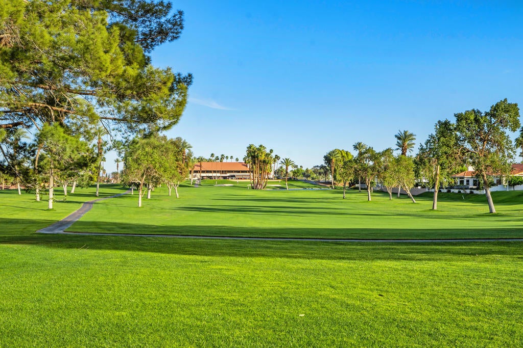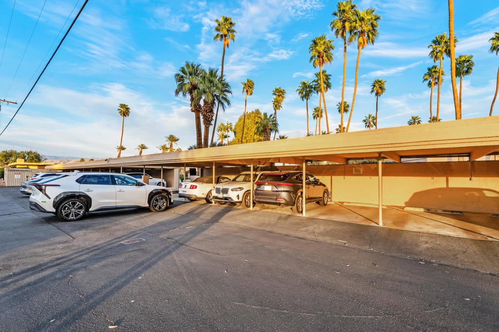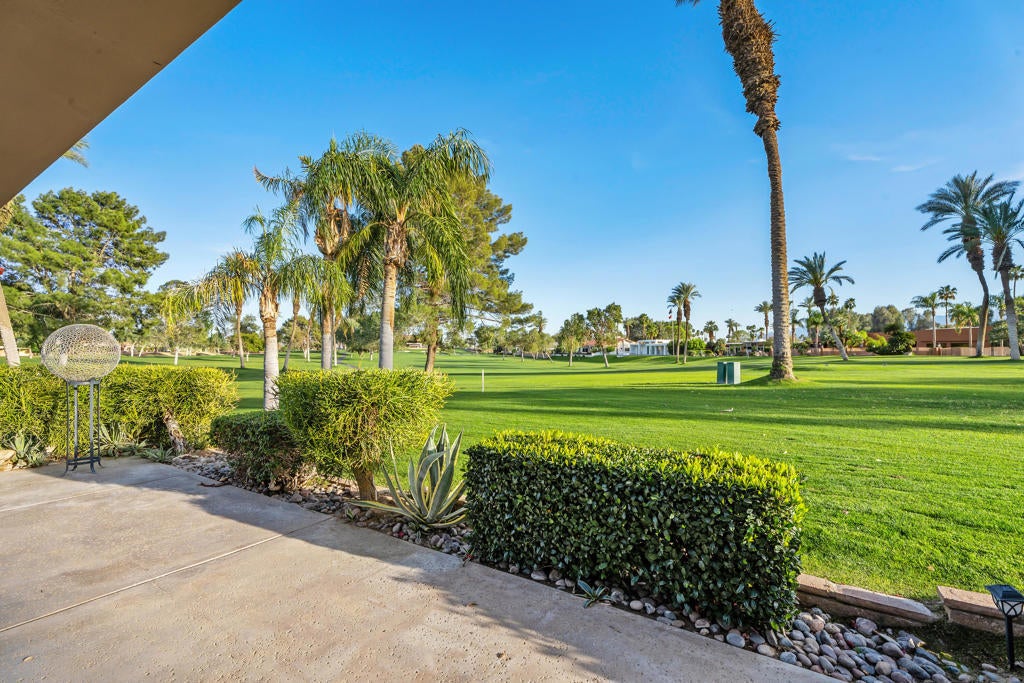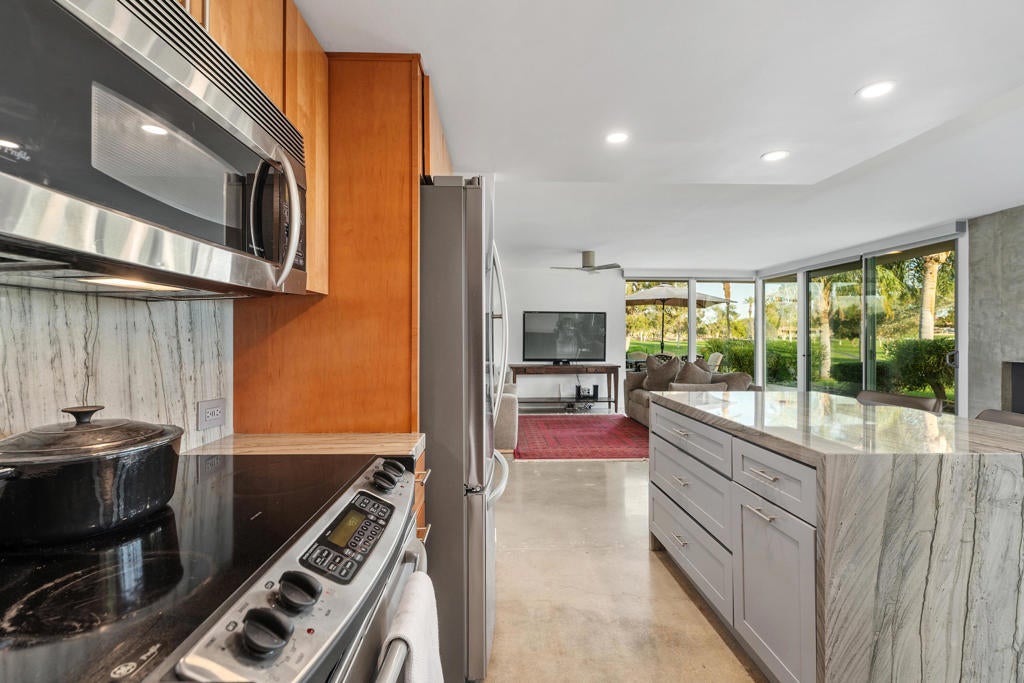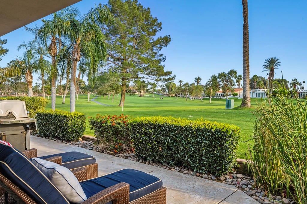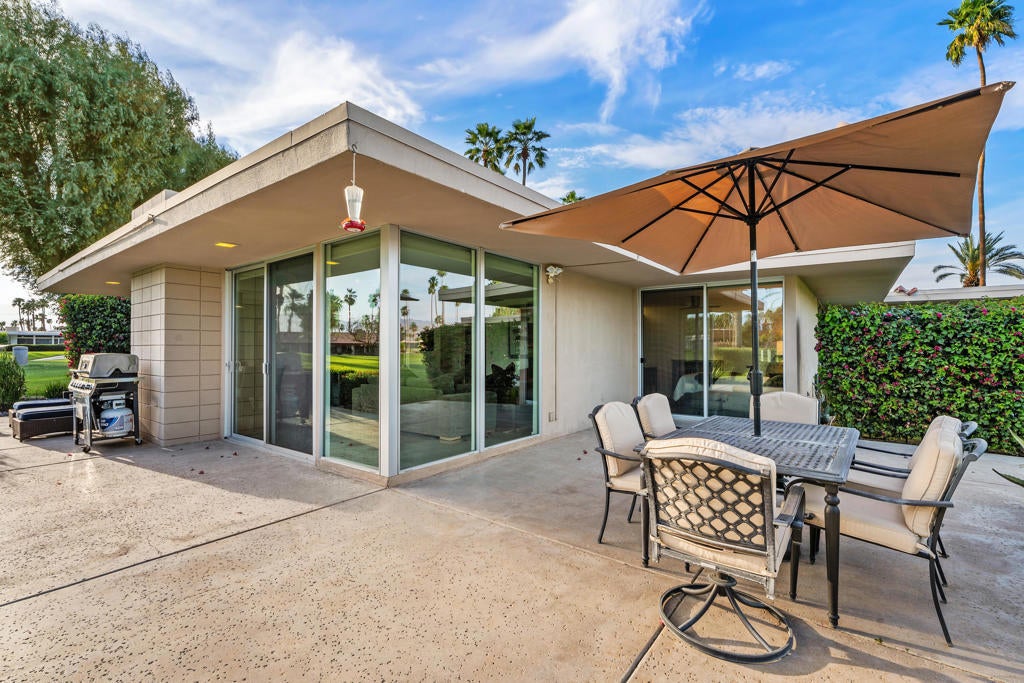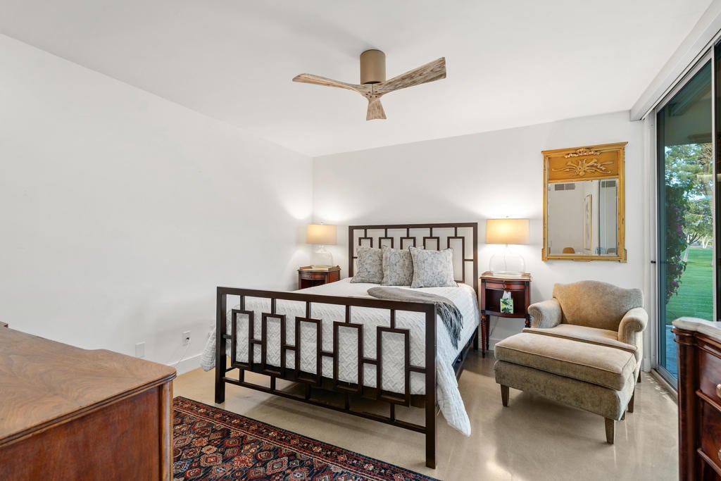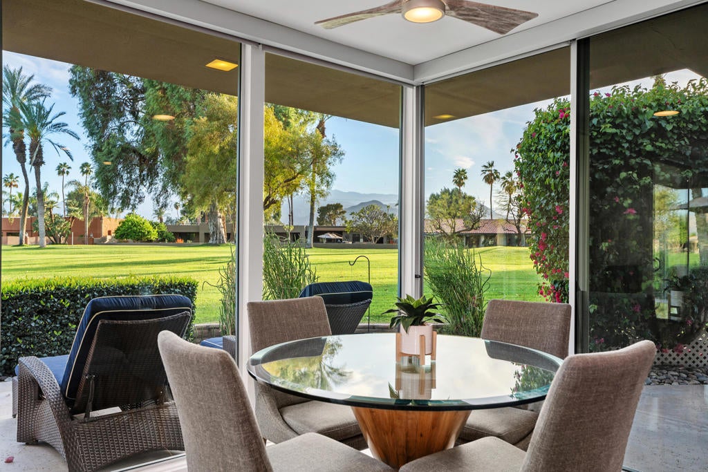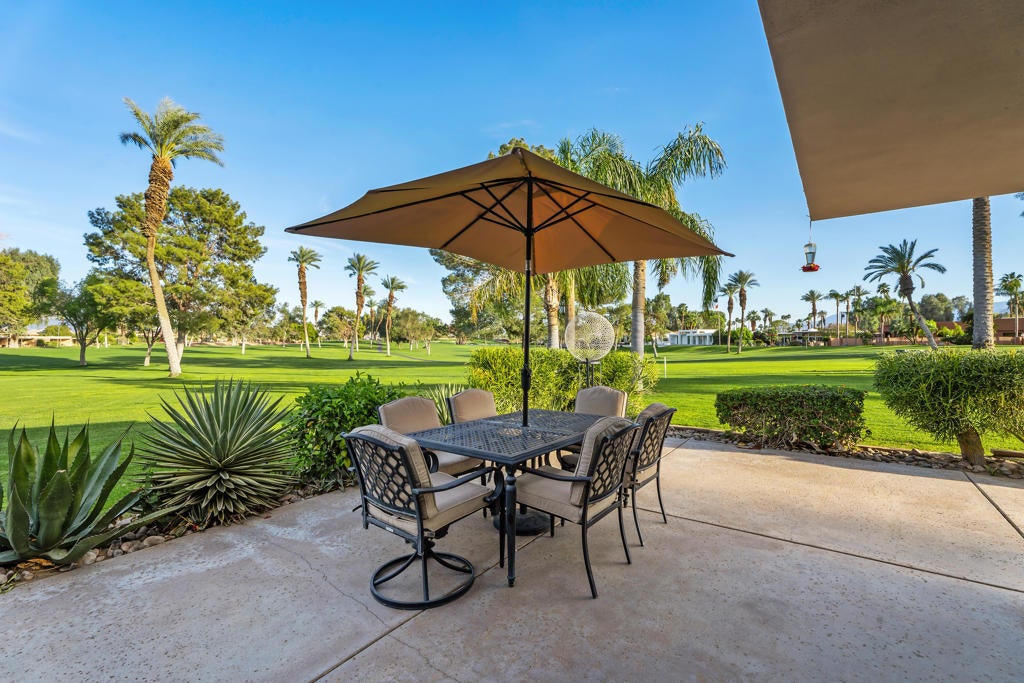 Welcome to the Fairway Villas! Experience classic desert living in this beautifully upgraded mid-century modern 2-bedroom, 2-bath condo located inside the gates of Bermuda Dunes Country Club. Perfectly positioned between #1 and #18 to capture sweeping fairway and mountain views, this stylish residence blends timeless architecture with thoughtful modern upgrades.The open living space showcases polished concrete floors, creating a sleek contemporary feel throughout. The fully remodeled kitchen in 2020 features a luxurious quartz waterfall island and countertops, clean lines, and updated finishes that complement the home's modern aesthetic. Bathrooms upgraded with tiled showers and quartz countertops. New mirrored closet doors, vanities and fixtures were also updated in 2020. Electrical was also upgraded in addition to USB outlets on electrical plugs for convenience!Walls of newly replaced tinted glass windows and sliding doors and screens invite in natural light and frame the stunning golf course scenery, while custom electric blinds provide effortless privacy and comfort at the touch of a button.Whether enjoying morning coffee while watching golfers on the fairway or relaxing with sunset mountain views, this condo offers a low-maintenance desert retreat in one of the valley's most established golf communities.