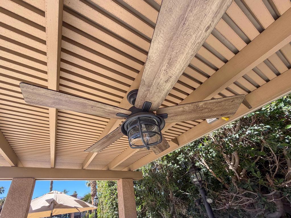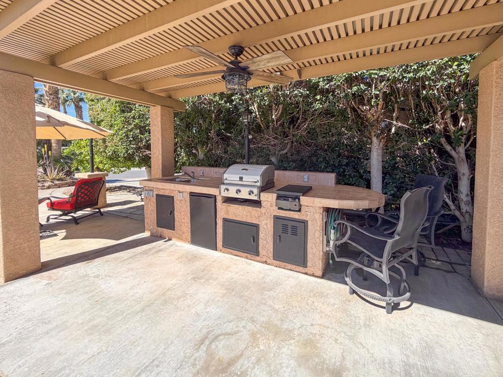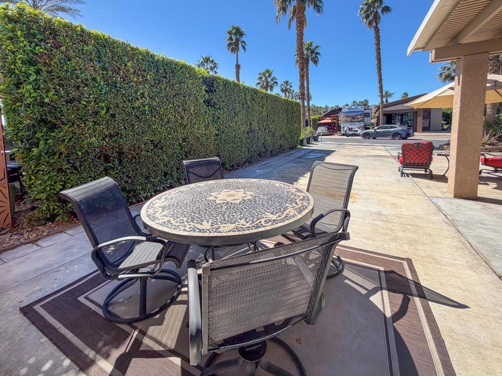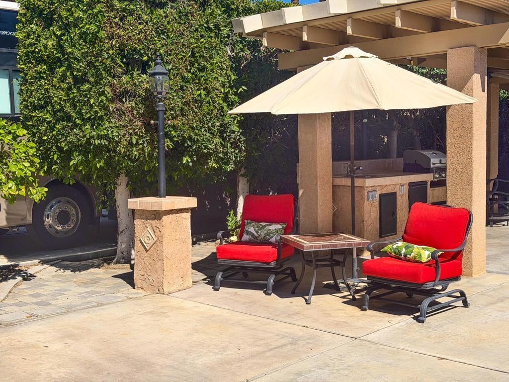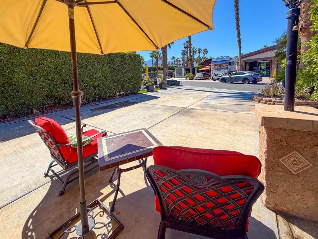 Welcome to Lot 110 at Outdoor Resort Indio, a cozy and private RV lot ideally located close to the clubhouse while still offering a peaceful retreat.The L-shaped Alumawood pergola features a solid roof, three heaters with dual controls and heating elements, and two ceiling fans, creating a comfortable outdoor living space throughout the desert season. A built-in entertainment center with TV enhances the outdoor experience, making it perfect for relaxing or hosting friends.The medium-sized kitchen is well-equipped with a cooktop, new BBQ, under-counter refrigerator, garbage disposal, and hot water, providing everything needed for outdoor cooking and entertaining. The lot also includes a round dining table with four chairs, a front seating area with table, umbrella, and two chairs, plus additional outdoor furniture surrounding a welcoming fire pit with six semi-circle chairs.Landscaping and pavers extend into the back of the lot, where you'll also find a private pet area and two storage boxes for added convenience.Lot 110 offers a wonderful blend of comfort, privacy, and proximity -- just a short stroll to the clubhouse while maintaining your own quiet space to enjoy the resort lifestyle. Outdoor Resort Indio is a class A only motorcoach resort.