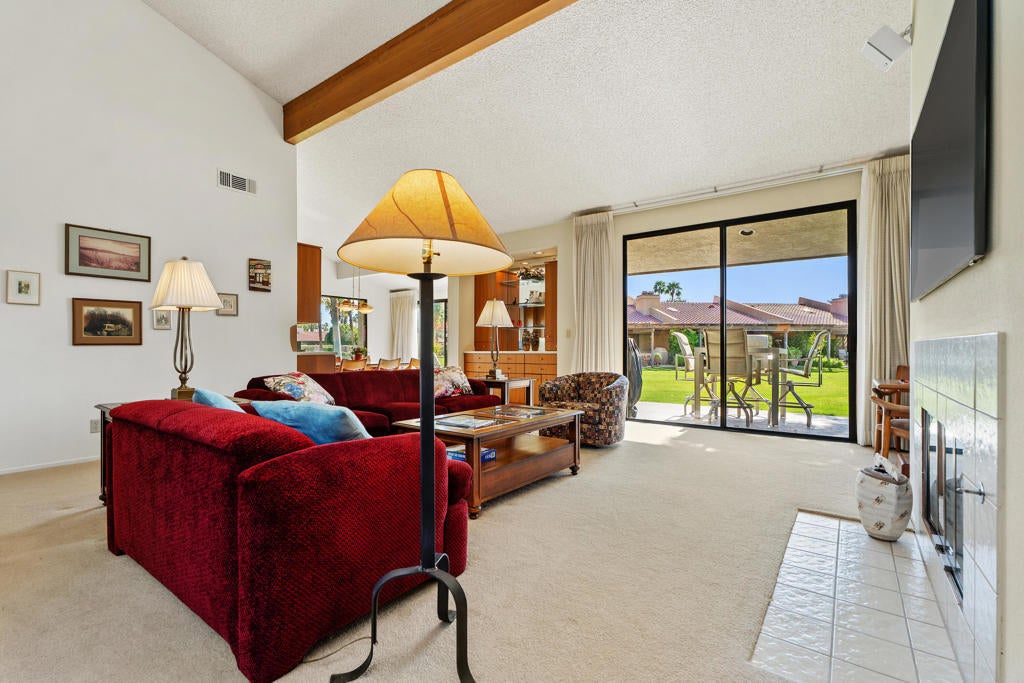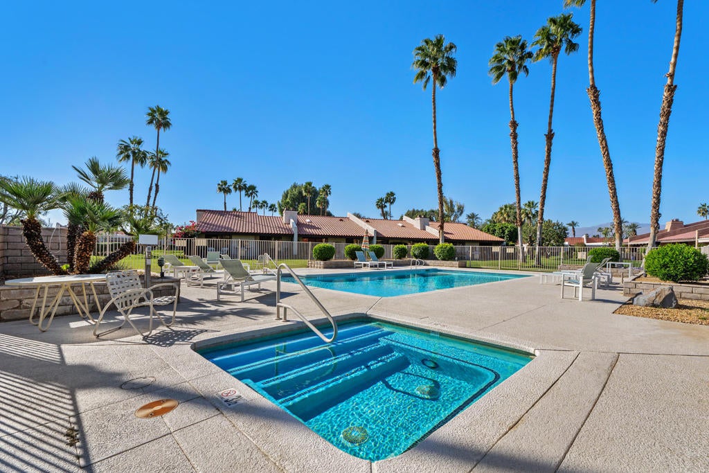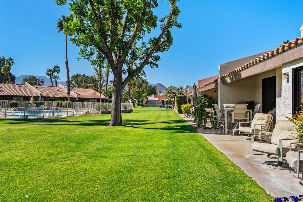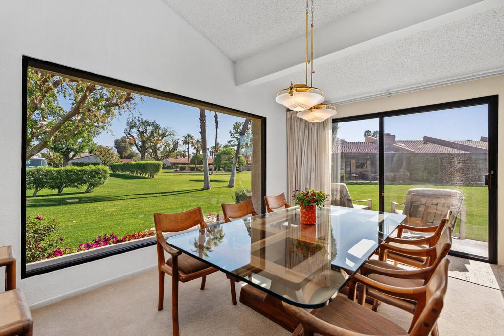Welcome to Montego Circle in the prestigious Bermuda Dunes Country Club. This desirable end-unit condo offers 2 bedrooms, 2 bathrooms, plus a spacious den that can easily serve as a third bedroom. Move-in ready Furnished Turnkey (per exclusion list) and ideally located near three of the community's pools, this home combines comfort, functionality, and classic desert charm.The thoughtfully designed floor plan features a remodeled kitchen (1995) and an expanded dining area with a wall-to-wall window and rolling shutter, capturing beautiful mountain and greenbelt views. The generous living room is perfect for relaxing or entertaining and showcases a stunning gas fireplace as its focal point.A unique atrium adds a touch of desert flair, bringing natural light and character to the home. The spacious primary suite includes a walk-in closet and an en-suite bathroom with dual vanities and a roomy shower. The second bedroom is also nicely sized and features its own en-suite bath. The den/third bedroom includes a built-in desk that can easily be removed to suit your needs.Additional highlights include an attached two-car garage and a golf cart garage (Openers newly replaced 2025) and an oversized laundry room with a cedar closet for extra storage. Some other improvements include 2 new toilets, smart thermostat & new lighting and fans. Septic tank was replaced in 2024.Residents of Montego Circle enjoy 5 community pools and spas plus a tennis court, making it easy to enjoy the relaxed desert lifestyle. Included in HOA of $214 is basic cable TV and internet with Spectrum, plus 24-hour security. Montego Circle HOA is $747 per month which Includes trash and water, Pool/Spa, landscaping, exterior maintenance of condo (includes roof), and fire & liability insurance. IID for lower electric, too!! Rentals allowed, but must be 30 days or longer. Close to Fine Dining and Shopping, Acrisure Arena and Indian Wells Tennis Gardens.