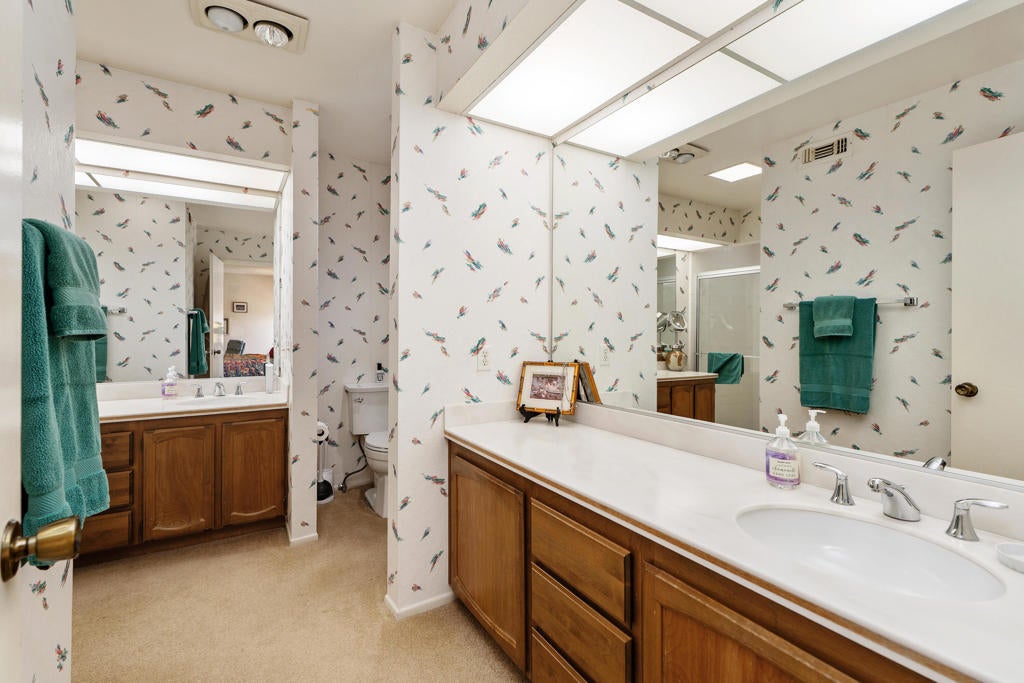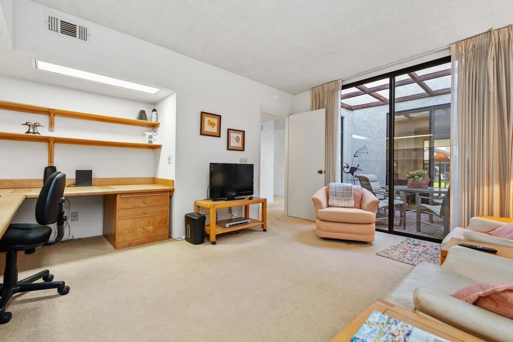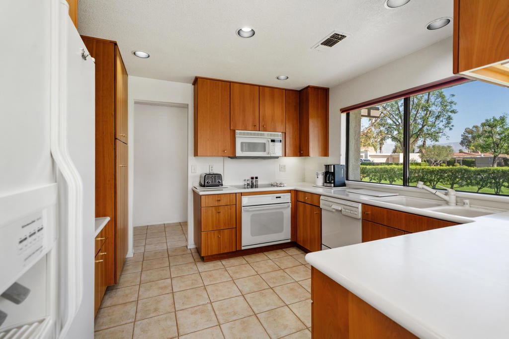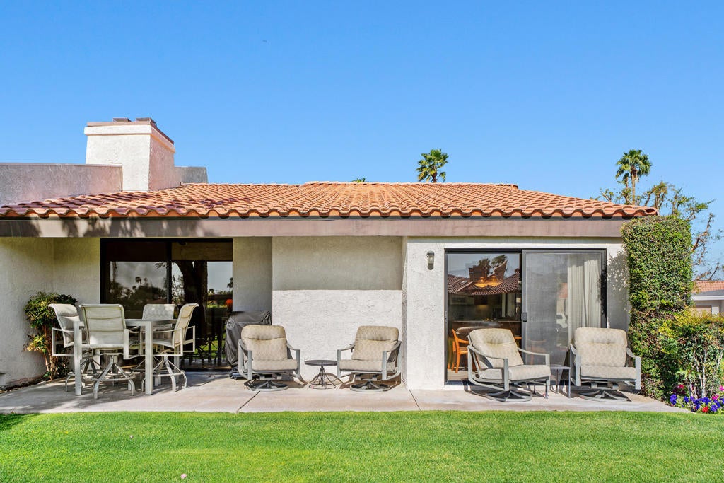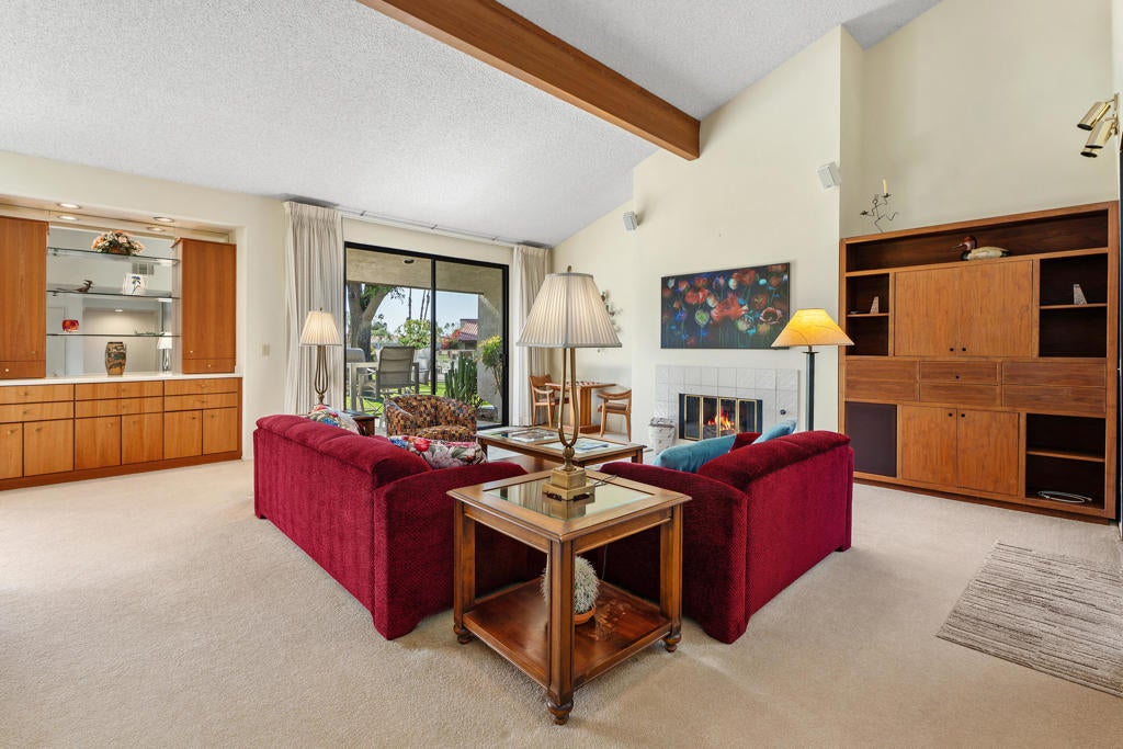 Welcome to Montego Circle in the prestigious Bermuda Dunes Country Club. This desirable end-unit condo offers 2 bedrooms, 2 bathrooms, plus a spacious den that can easily serve as a third bedroom. Move-in ready Furnished Turnkey (per exclusion list) and ideally located near three of the community's pools, this home combines comfort, functionality, and classic desert charm.The thoughtfully designed floor plan features a remodeled kitchen (1995) and an expanded dining area with a wall-to-wall window and rolling shutter, capturing beautiful mountain and greenbelt views. The generous living room is perfect for relaxing or entertaining and showcases a stunning gas fireplace as its focal point.A unique atrium adds a touch of desert flair, bringing natural light and character to the home. The spacious primary suite includes a walk-in closet and an en-suite bathroom with dual vanities and a roomy shower. The second bedroom is also nicely sized and features its own en-suite bath. The den/third bedroom includes a built-in desk that can easily be removed to suit your needs.Additional highlights include an attached two-car garage and a golf cart garage (Openers newly replaced 2025) and an oversized laundry room with a cedar closet for extra storage. Some other improvements include 2 new toilets, smart thermostat & new lighting and fans. Septic tank was replaced in 2024.Residents of Montego Circle enjoy 5 community pools and spas plus a tennis court, making it easy to enjoy the relaxed desert lifestyle. Included in HOA of $214 is basic cable TV and internet with Spectrum, plus 24-hour security. Montego Circle HOA is $747 per month which Includes trash and water, Pool/Spa, landscaping, exterior maintenance of condo (includes roof), and fire & liability insurance. IID for lower electric, too!! Rentals allowed, but must be 30 days or longer. Close to Fine Dining and Shopping, Acrisure Arena and Indian Wells Tennis Gardens.