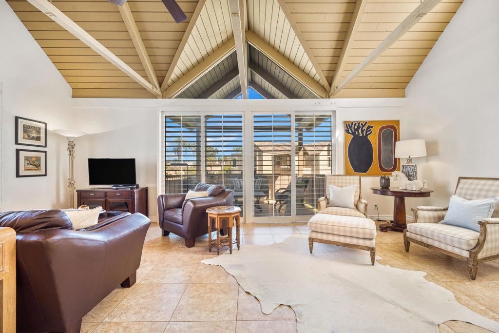 A PRIVATE DESERT PERCH WITH SWEEPING FAIRWAY & MOUNTAIN VIEWS! Premier location at the end of Mountain Cove Drive within the gated enclave of Mountain Cove. This elevated, second-floor studio bungalow showcases spectacular views across the fairways of The Cove course in Indian Wells Country Club - with the surrounding mountains creating a breathtaking natural backdrop. The spacious balcony provides a peaceful setting to unwind and enjoy the scenery. Inside, dramatic vaulted ceilings, picture windows, and tall panes of glass bring in the view, and abundant natural light, while enhancing the feeling of volume and openness. A neutral color palette and quality finishes - including beveled granite countertops, rich cabinetry, plantation shutters, and tile flooring that extends outdoors, create a polished yet comfortable living environment. This unit has been exceptionally well maintained and is in immaculate condition! Whether a weekend getaway, seasonal home, or investment property - this is a rare find and the perfect place to relax, recharge, and enjoy the view! Offered furnished per inventory. This studio has been leased annually by one tenant since 2021. The property is on leased land.