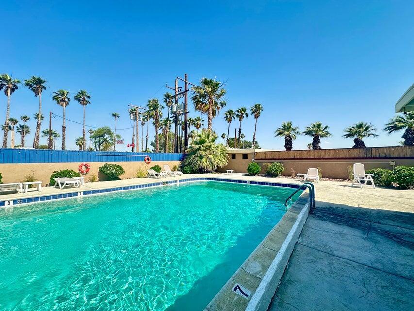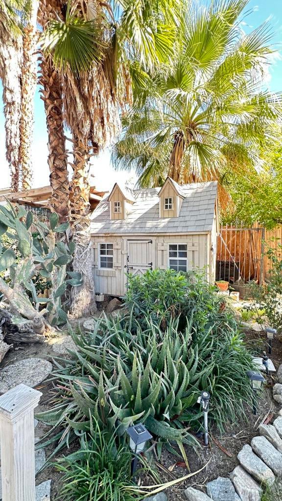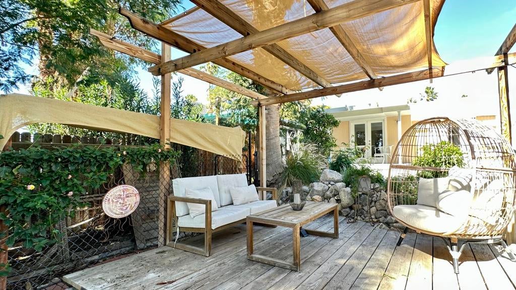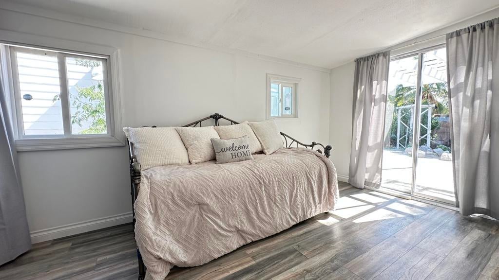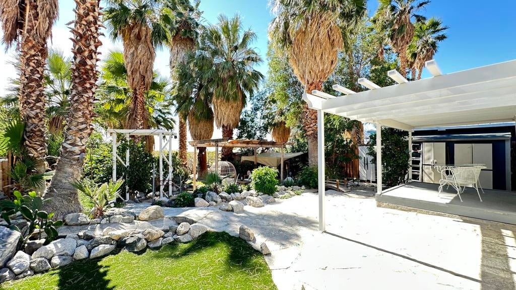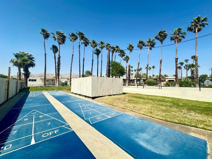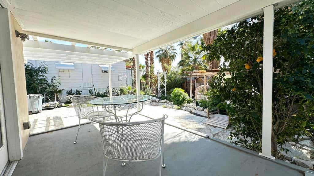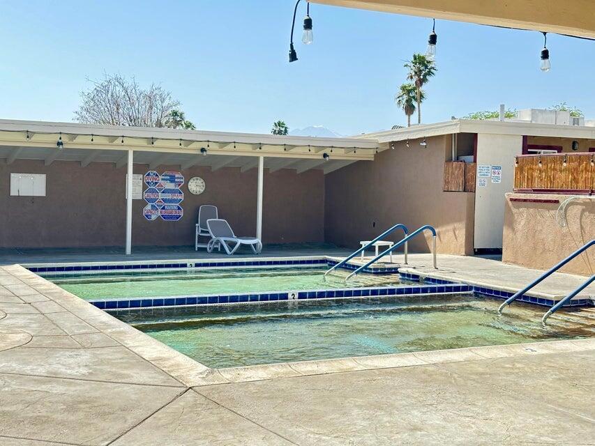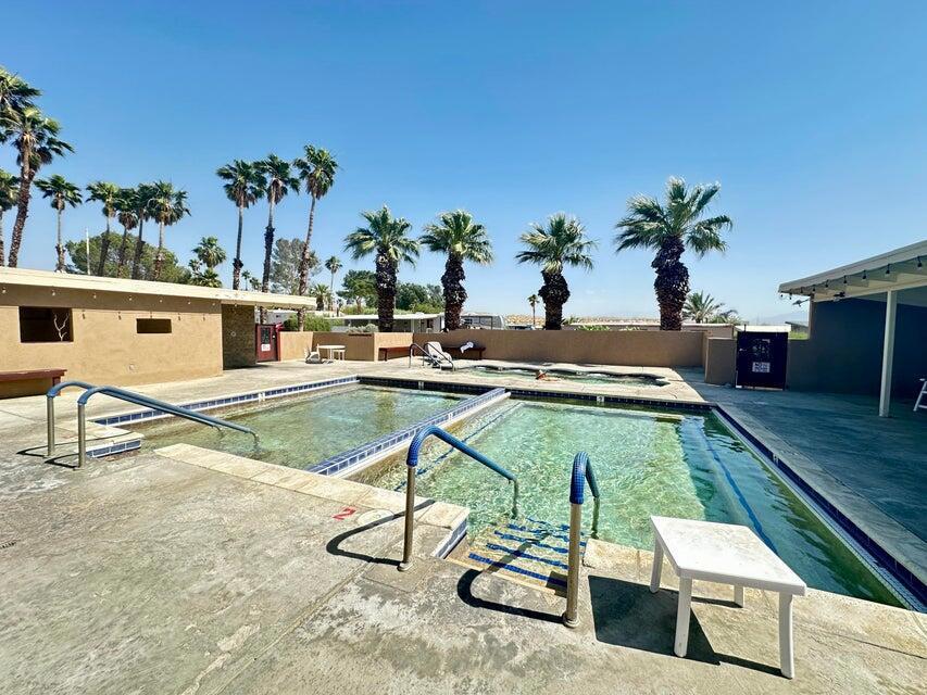 Step inside this lovely home into the living room area to find a beautiful built in wooden hutch. The modern wood like tile flooring in the living room runs up into the kitchen, through the hallway and into the primary bedroom and hall bath. Step up into the newer remodeled kitchen area featuring white cabinetry, stainless steel appliances and a nice sized island in the center for convenience.The island and counters are designed with newer wood butcher block surfaces. The open floor plan is wonderful for entertaining your friends and family. Go down the hallway to find the updated bathroom recently remodeled with a double vanity, mirrors above both sinks and quartz counter top. The primary bedroom has newer lovely French doors with windows opening to the alumna wood covered patio. The guest bedroom has laminate wood flooring and a sliding glass door that opens to the amazing rear yard. There are several sitting areas; one has a gazebo covering.There is an Oasis of Palm Trees a succulent plant garden, orange trees and roses The peaceful stream runs through the perimeter of the patio. There are also two sheds for storage. Healing Waters Amenities include the therapeutic mineral water pools, jacuzzi's, wet & dry saunas, pickle ball and tennis courts. The Clubhouse has a library, kitchen, entertainment area and game room. This is a 55 plus community. The current land rent will be $695.00 per month plus sewer, trash and all utilities.