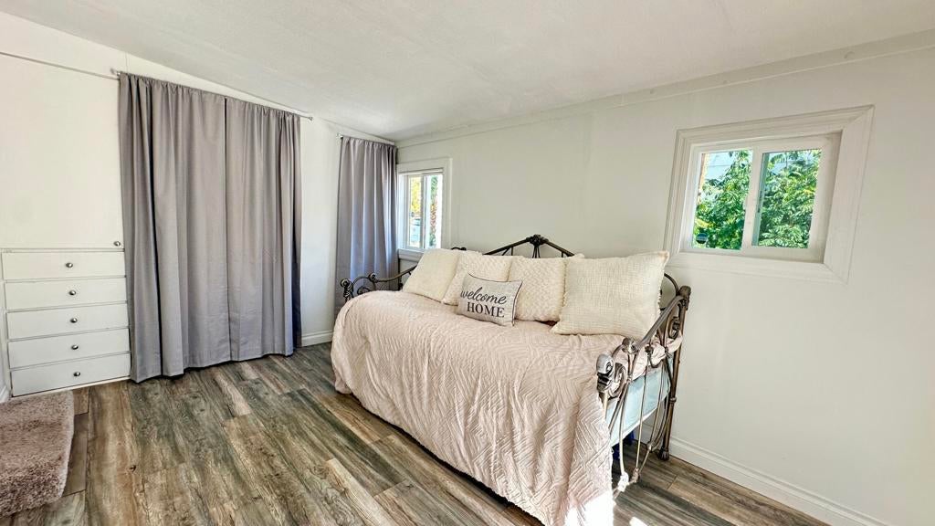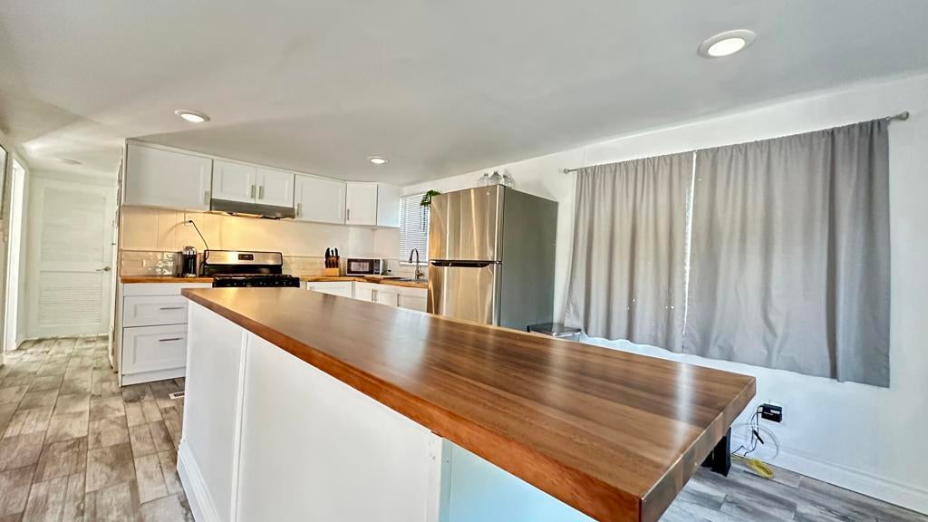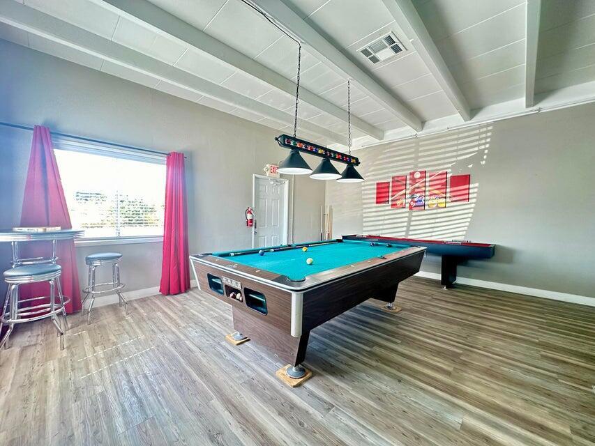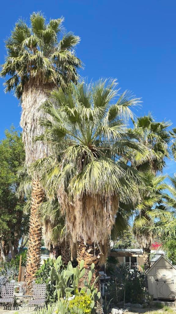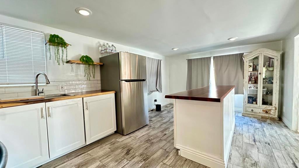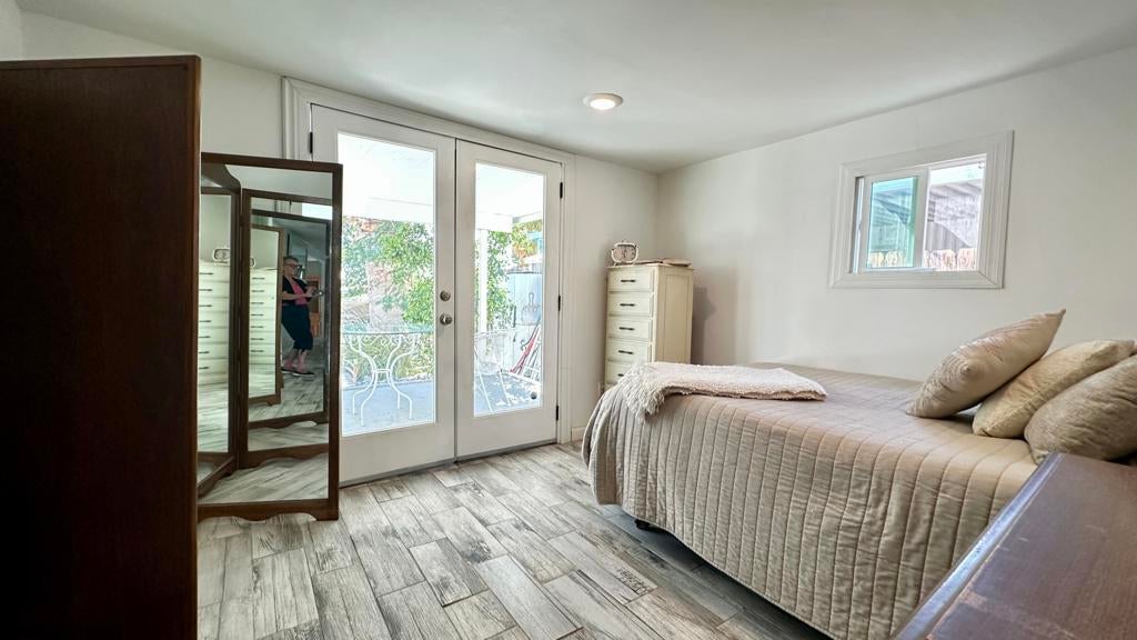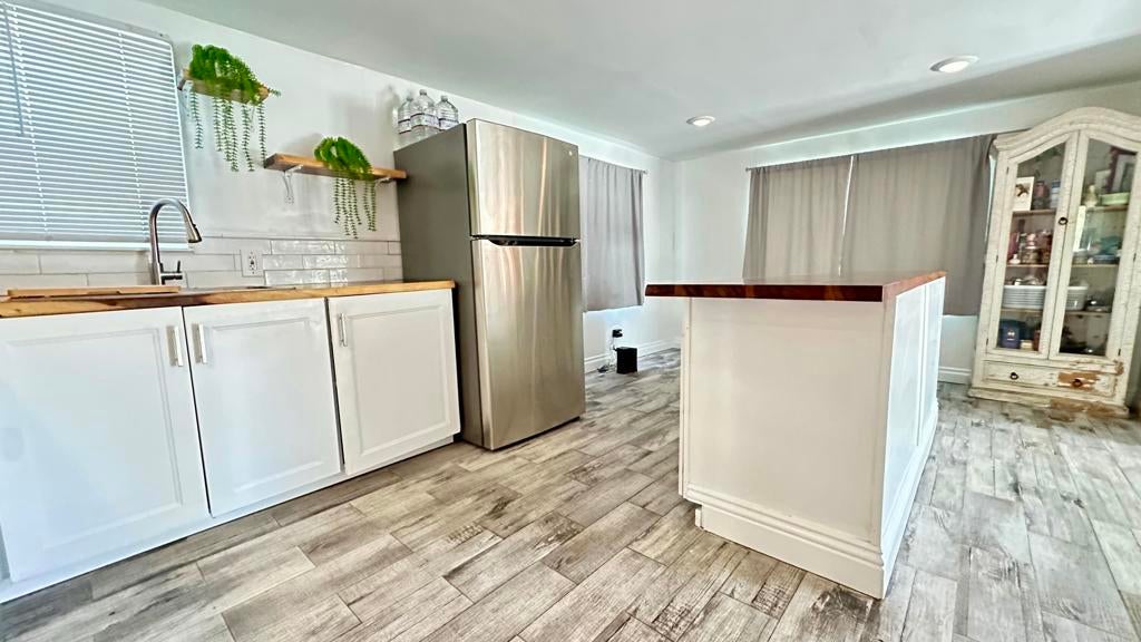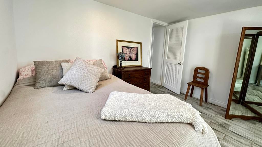 Step inside this lovely home into the living room area to find a beautiful built in wooden hutch. The modern wood like tile flooring in the living room runs up into the kitchen, through the hallway and into the primary bedroom and hall bath. Step up into the newer remodeled kitchen area featuring white cabinetry, stainless steel appliances and a nice sized island in the center for convenience.The island and counters are designed with newer wood butcher block surfaces. The open floor plan is wonderful for entertaining your friends and family. Go down the hallway to find the updated bathroom recently remodeled with a double vanity, mirrors above both sinks and quartz counter top. The primary bedroom has newer lovely French doors with windows opening to the alumna wood covered patio. The guest bedroom has laminate wood flooring and a sliding glass door that opens to the amazing rear yard. There are several sitting areas; one has a gazebo covering.There is an Oasis of Palm Trees a succulent plant garden, orange trees and roses The peaceful stream runs through the perimeter of the patio. There are also two sheds for storage. Healing Waters Amenities include the therapeutic mineral water pools, jacuzzi's, wet & dry saunas, pickle ball and tennis courts. The Clubhouse has a library, kitchen, entertainment area and game room. This is a 55 plus community. The current land rent will be $695.00 per month plus sewer, trash and all utilities.