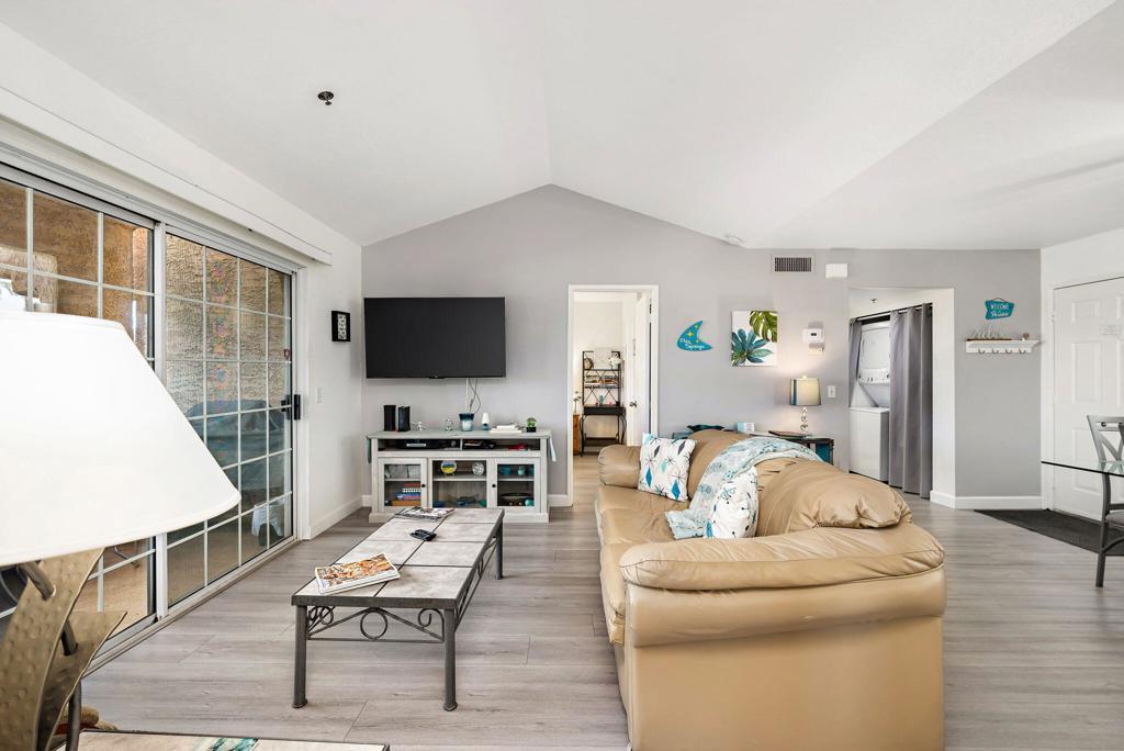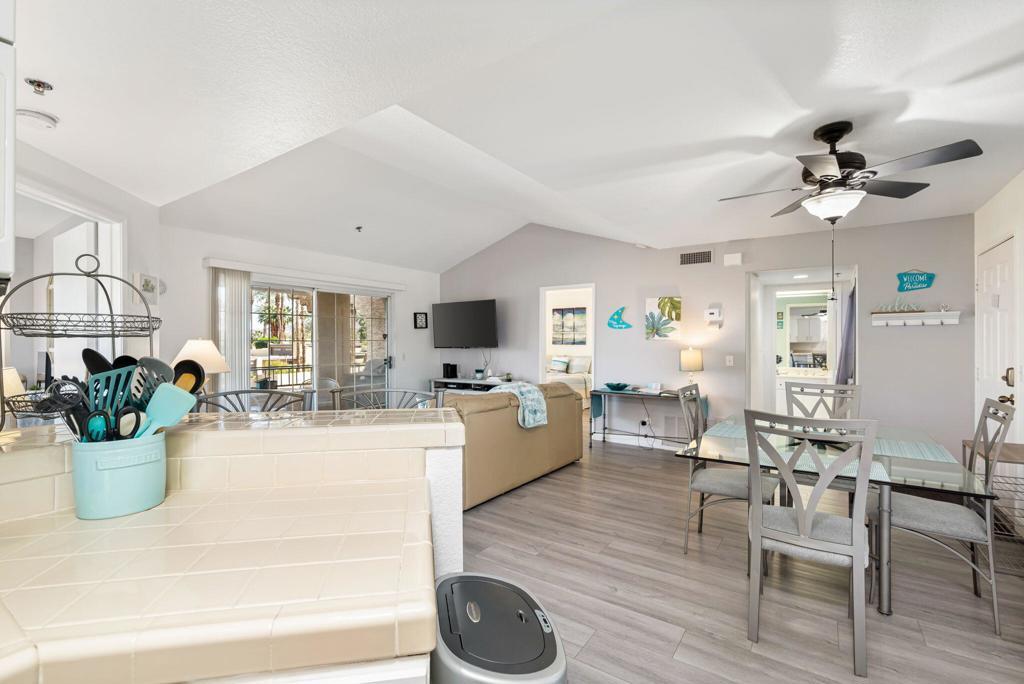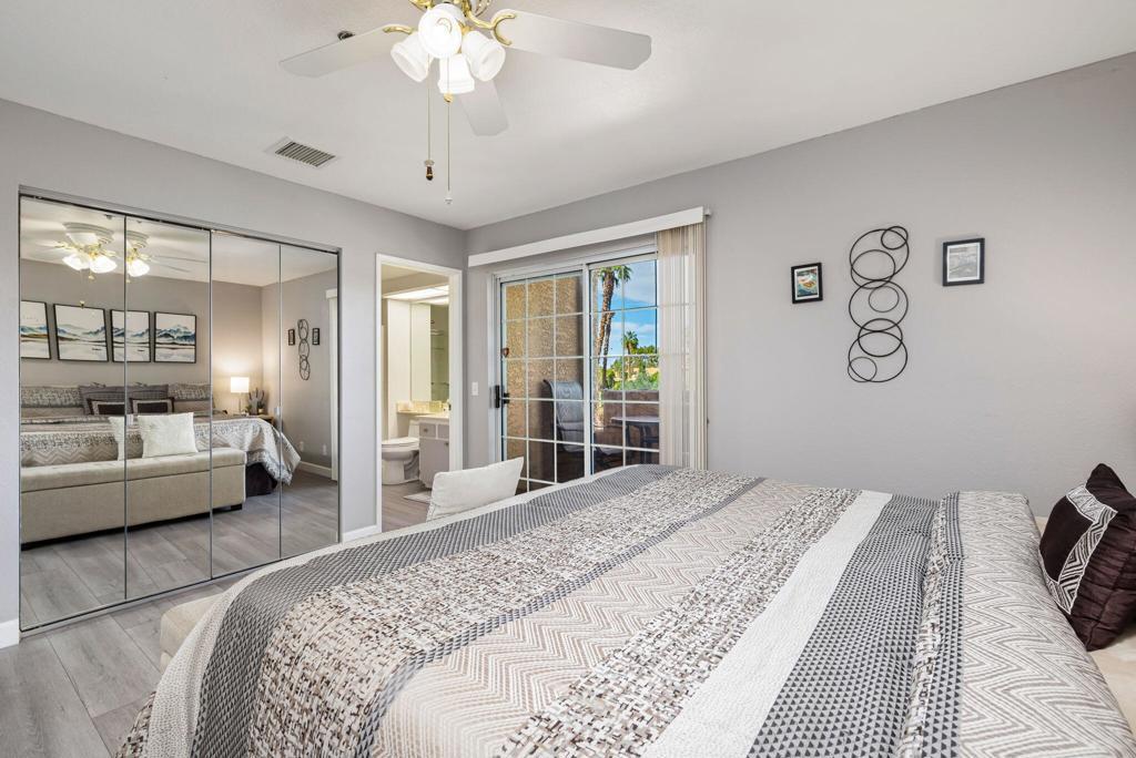 Located in the beautifully landscaped, gated Esprit community, this desirable second-floor end unit offers enhanced privacy and beautiful golf course views, making it ideal for full-time living or a relaxing Palm Springs getaway. Offered fully furnished and recently upgraded with updated flooring, the open floor plan features well-separated bedrooms, each with its own en suite bathroom for added privacy.As an end unit, the home benefits from additional natural light and more open sightlines overlooking the golf course. Enjoy the convenience of easy access to parking and an in-unit stackable washer and dryer. The community offers a resort-style atmosphere with two pools, three spas, tennis courts, a pickleball court, and covered parking.