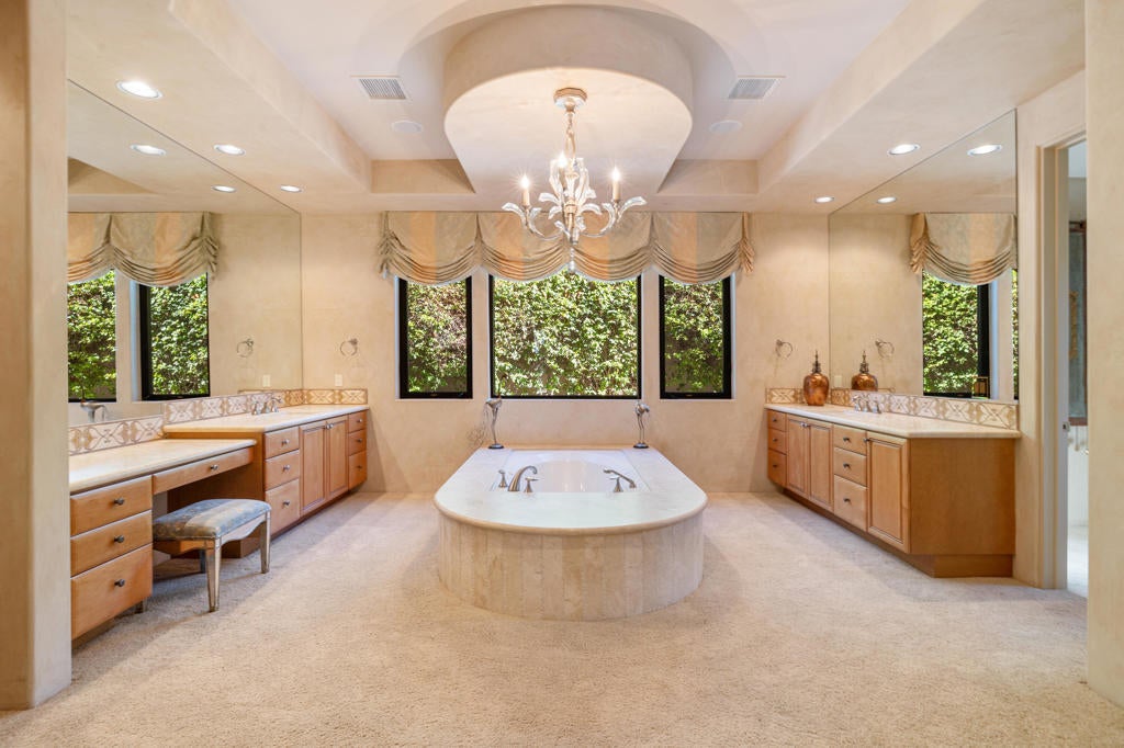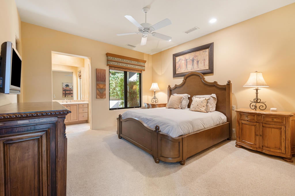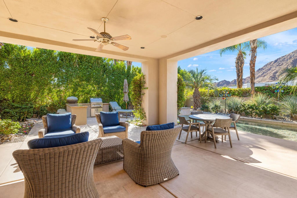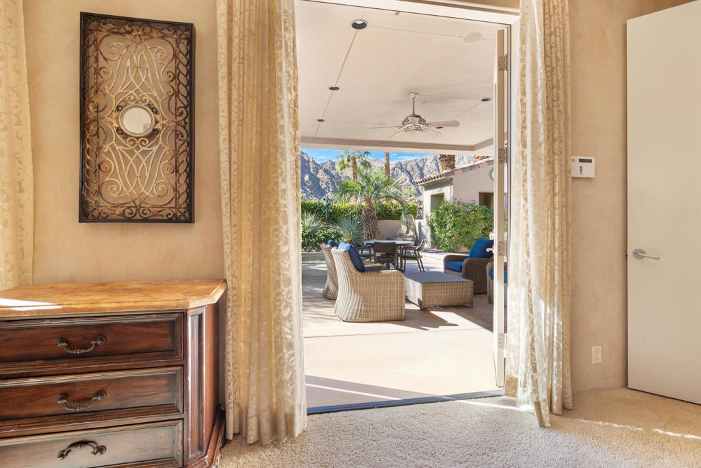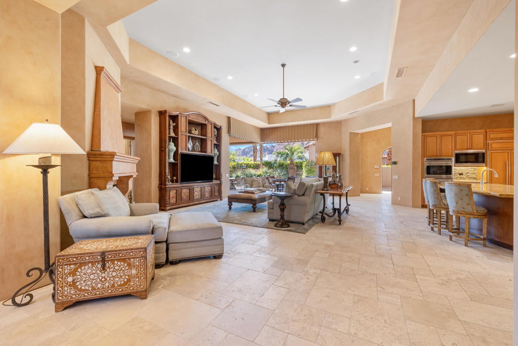 Built by renowned Ministrelli this outstanding home is one of the finest and best locations at Indian Wells Country Club within the prestigious Villaggio community. Light and bright California open floorplan and Tuscany design is quality built from start to finish! Spectacular Mountain Views directly south facing with walls of glass which disappear and open to large 422 Square Foot covered loggia with fireplace, beautiful pool and raised spa, and outdoor barbeque island. Fabulous Views and spacious indoor/outdoor living, this private home features 4632 Sq. Ft. of indoor living, 4 spacious Bedrooms with ensuite baths, 4.5 Baths, Great Room with fireplace, Formal Dining Room has adjoining impressive Wine room. Open Gourmet Kitchen boasts 2 islands with bar seating, 2 stainless steel sinks, Wolf appliances, and gorgeous granite countertops. Primary bedroom has fabulous pool and mountain views with French doors to direct access to loggia, pool/spa. Grand Primary Bath features dual sinks plus vanity, jet tub spa, and huge walk-in closet. Interior Design features include extensive use of granite and marble, faux and stenciled wall paint, art niches, built-in wood cabinetry, carpeted bedrooms, and gorgeous Versailles pattern travertine floors. Total of 3 car garages, with epoxy flooring and built-ins for extra storage. Elegance, Style, and Luxury!