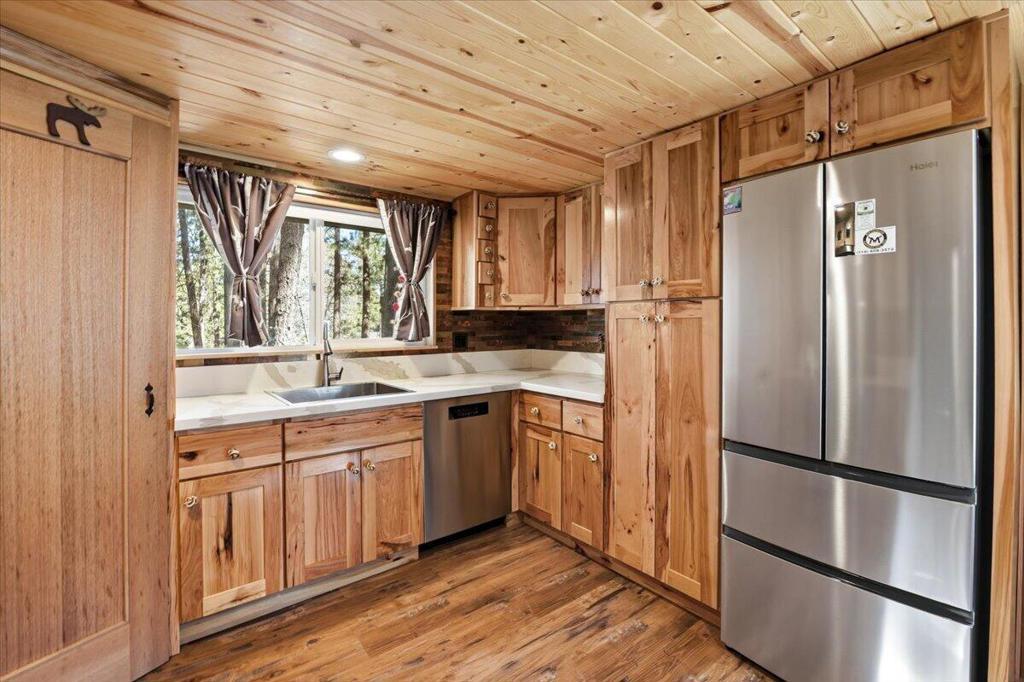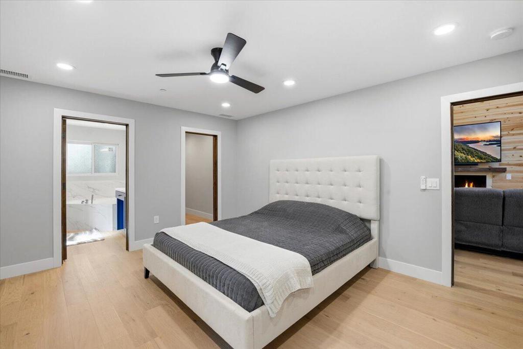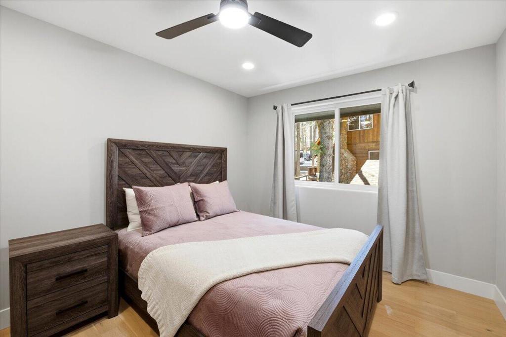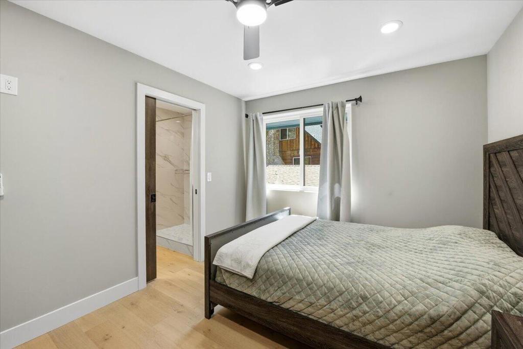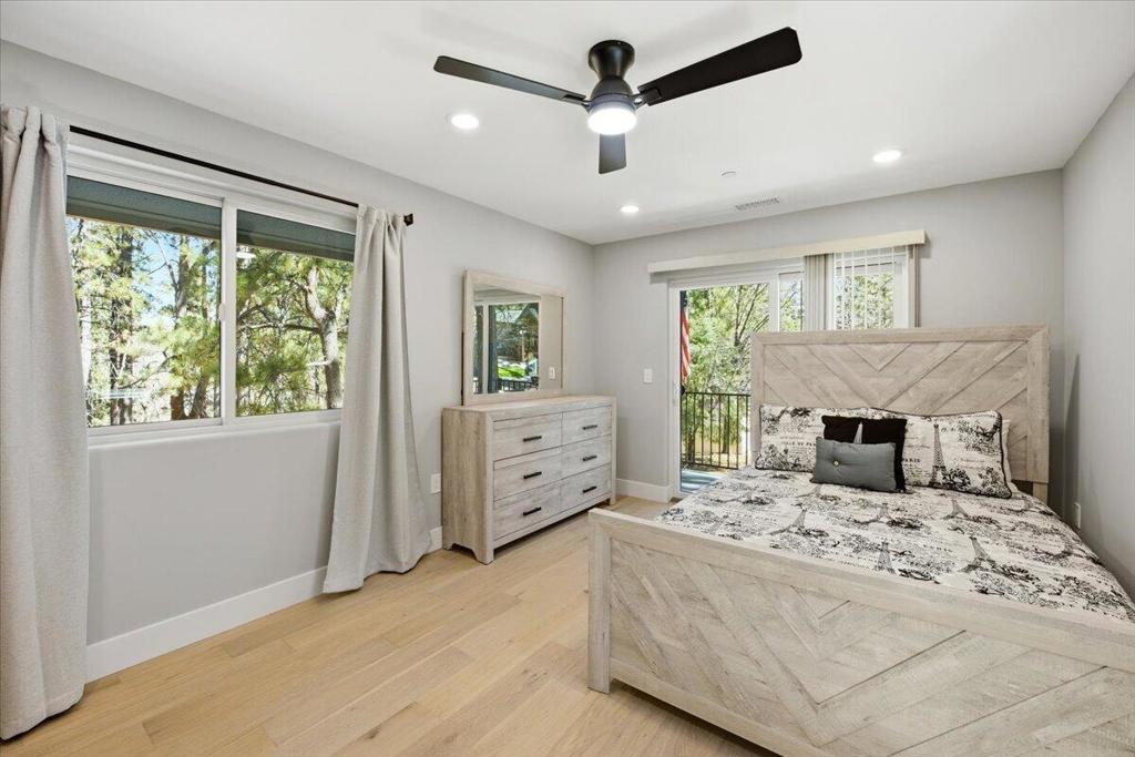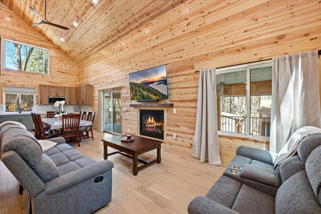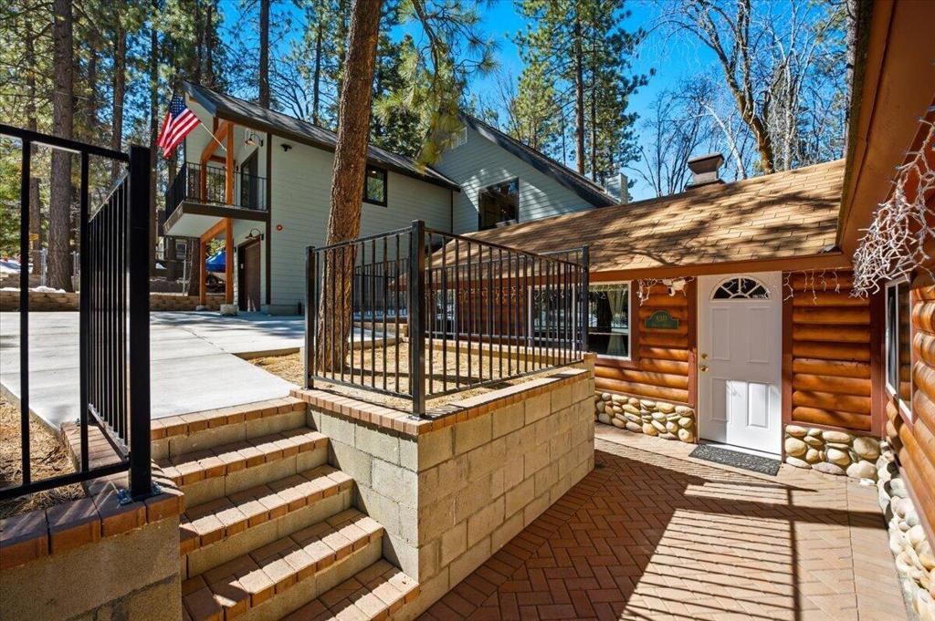 Stunning brand-new 2026 construction with a fully remodeled guest house, ideally located doors from the National Forest in the heart of Big Bear Lake. This rare dual-dwelling property offers exceptional craftsmanship, premium materials, and incredible flexibility for full-time living, multi-generational use, or rental income. The main home features 4 bedrooms, 3.5 baths, and 1,901 sq ft of beautifully designed living space. Enjoy soaring 15+ ft vaulted ceilings, solid wood doors, 2x6 construction, full insulation, LVP hybrid flooring with real oak top layer, and a spacious open-concept living area with a gas fireplace. The kitchen includes brand-new appliances, 2-tone cabinetry, under-cabinet lighting, and modern finishes. The first-floor primary suite offers a spa-style bathroom with soaking tub, large shower, dual vanities, and walk-in closet. Upstairs includes two Jack-and-Jill bedrooms plus an additional primary suite with private balcony. Home is fully furnished and equipped with a 4-ton AC system, gas forced air furnace, 2.5 kW solar + 5 kW backup battery, 200-amp panel, fire sprinkler system, waterproof decks, and a spa-ready covered patio. Concrete driveway, safety railings, and fenced yard complete the exterior.The fully remodeled guest cabin offers 3 bedrooms, 1 bath, and 856 sq ft, featuring a beautiful native rock wood burning fireplace in the living room, dining area, full kitchen with new appliances, stacked washer/dryer, and fully furnished--great for guests or rental potential. A truly turnkey property offering modern comfort, mountain charm, and an unbeatable Big Bear Lake location. This fantastic property has it all! Must see!