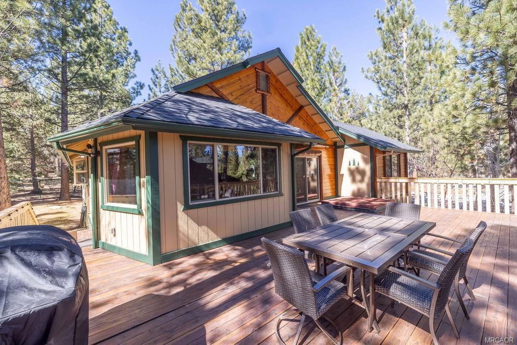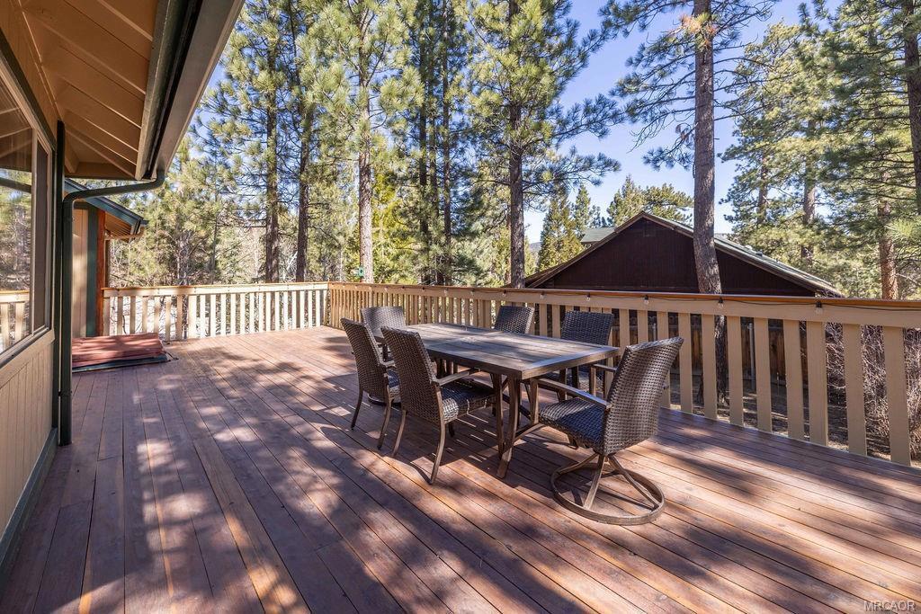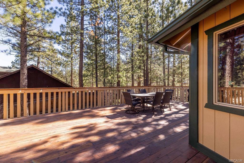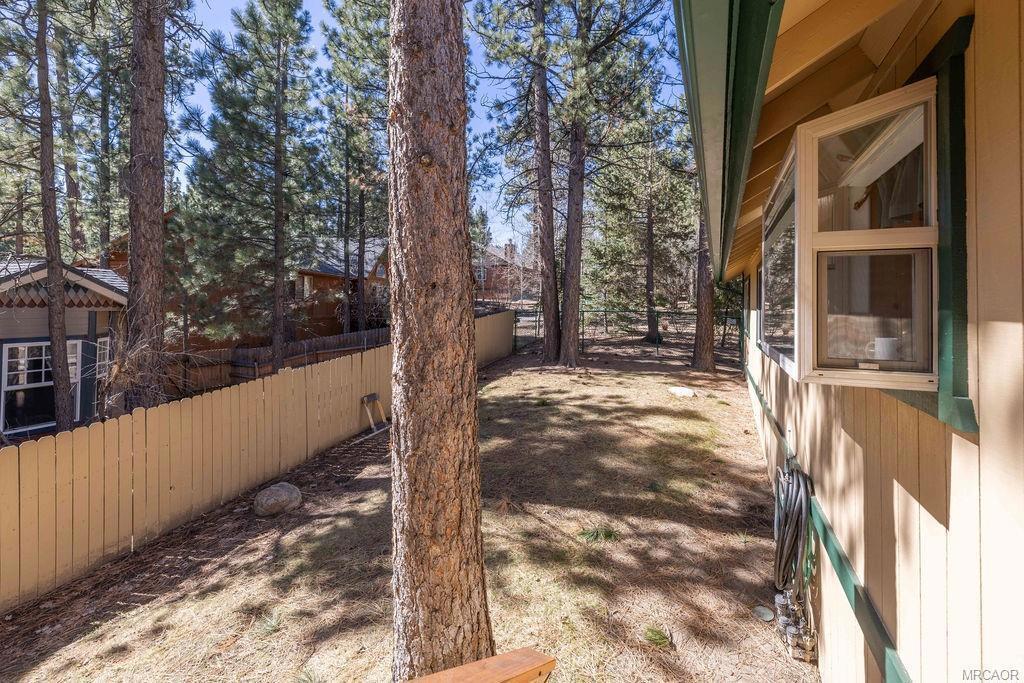 This charming log-style home in Fox Farm offers a warm and inviting atmosphere with its mountain charm. The home has been meticulously maintained and decorated to reflect the forest lifestyle. With 3 bedrooms, 2 baths and a two-car garage, this cabin is both functional and cozy. The interior is bright and airy, with plenty of storage and closet space throughout. The master bathroom features his and hers sinks, adding luxury to the space. The cabin boasts pine wainscoting and vaulted ceilings with recessed lighting, and newer vinyl plank flooring creating a rustic yet modern ambiance. The open floor plan seamlessly connects the kitchen and living room, allowing for easy interaction and entertainment. The home has a new roof and has just been stained/painted making the home low/no maintenance and move-in ready. Outside, you'll find a large front deck as well as a spacious rear deck that overlooks the yard. The heavily treed lot is partially fenced, providing privacy and a serene setting. It's an ideal space for summer gatherings and enjoying the outdoors. For relaxation, there's a stepdown spa available for soaking, complete with newer electronics and motor, allowing you to unwind and rejuvenate after a day of exploring all that Big Bear Valley has to offer. The property's location is convenient, being close to ski slopes, golf, the lake, the zoo and The Village, ensuring you have easy access to various recreational activities and amenities. Overall, this turnkey cabin in the premiere Eagle Mountain Estates neighborhood offers a wonderful opportunity to embrace the mountain lifestyle