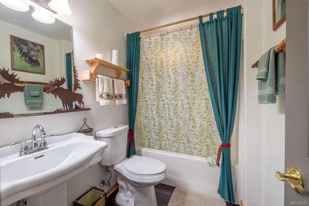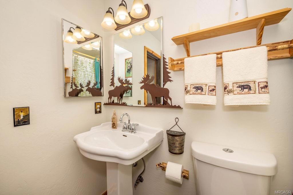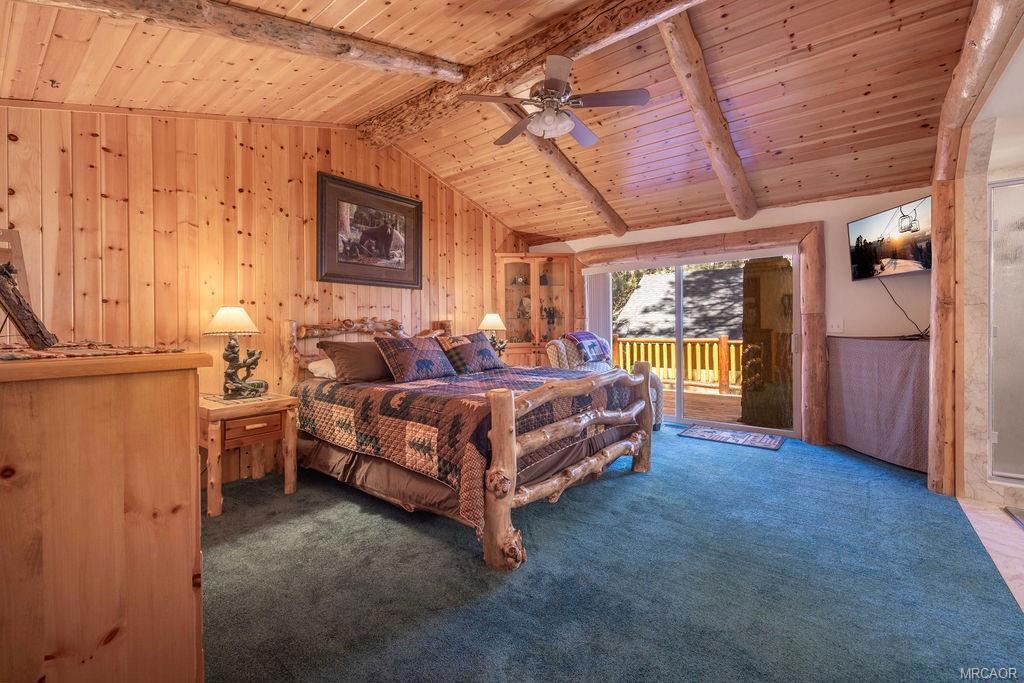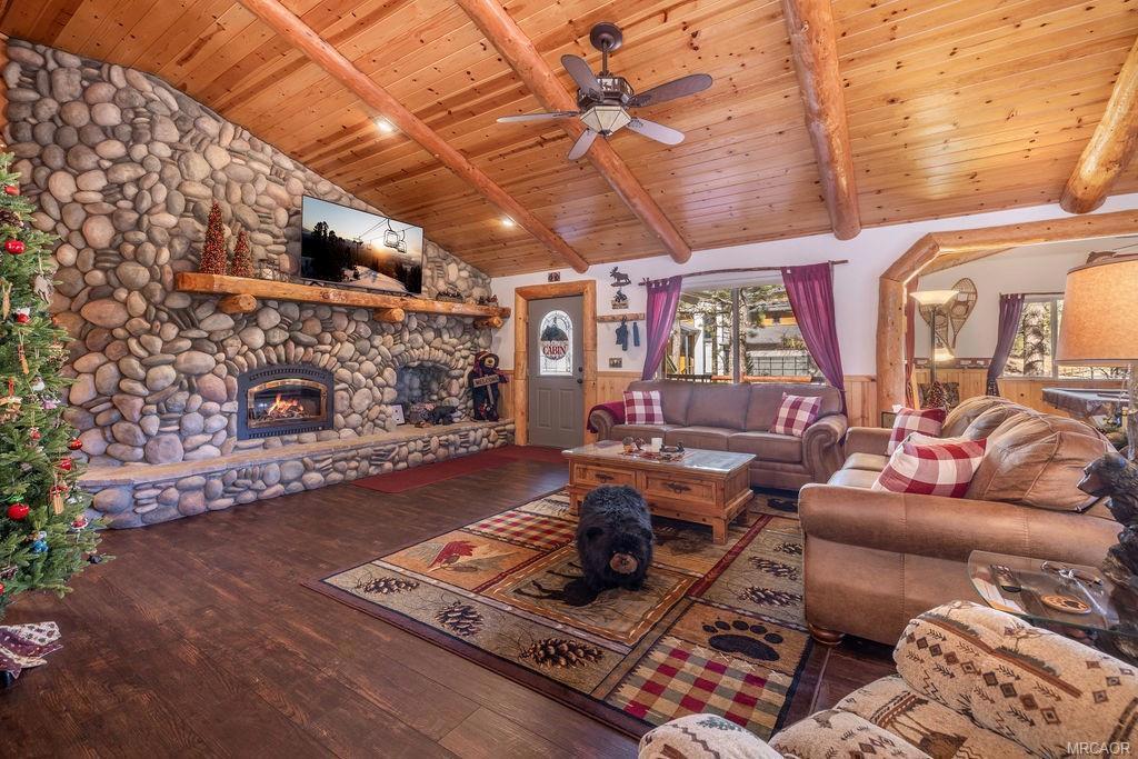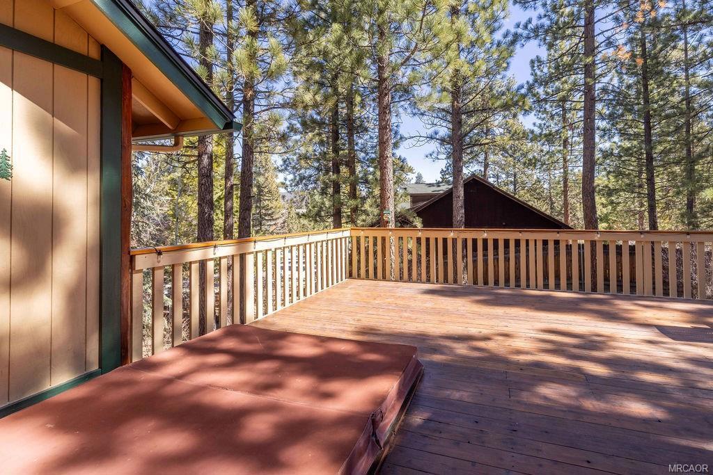 This charming log-style home in Fox Farm offers a warm and inviting atmosphere with its mountain charm. The home has been meticulously maintained and decorated to reflect the forest lifestyle. With 3 bedrooms, 2 baths and a two-car garage, this cabin is both functional and cozy. The interior is bright and airy, with plenty of storage and closet space throughout. The master bathroom features his and hers sinks, adding luxury to the space. The cabin boasts pine wainscoting and vaulted ceilings with recessed lighting, and newer vinyl plank flooring creating a rustic yet modern ambiance. The open floor plan seamlessly connects the kitchen and living room, allowing for easy interaction and entertainment. The home has a new roof and has just been stained/painted making the home low/no maintenance and move-in ready. Outside, you'll find a large front deck as well as a spacious rear deck that overlooks the yard. The heavily treed lot is partially fenced, providing privacy and a serene setting. It's an ideal space for summer gatherings and enjoying the outdoors. For relaxation, there's a stepdown spa available for soaking, complete with newer electronics and motor, allowing you to unwind and rejuvenate after a day of exploring all that Big Bear Valley has to offer. The property's location is convenient, being close to ski slopes, golf, the lake, the zoo and The Village, ensuring you have easy access to various recreational activities and amenities. Overall, this turnkey cabin in the premiere Eagle Mountain Estates neighborhood offers a wonderful opportunity to embrace the mountain lifestyle