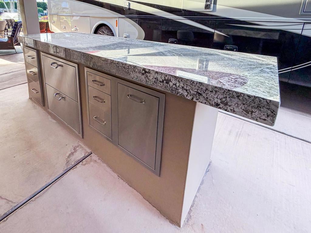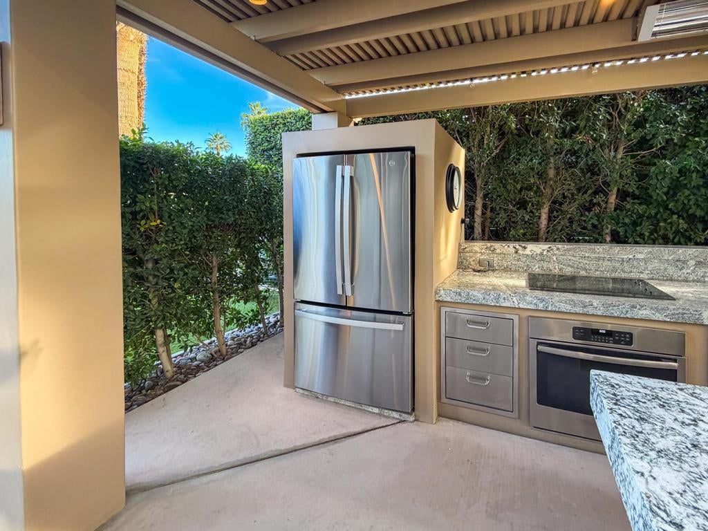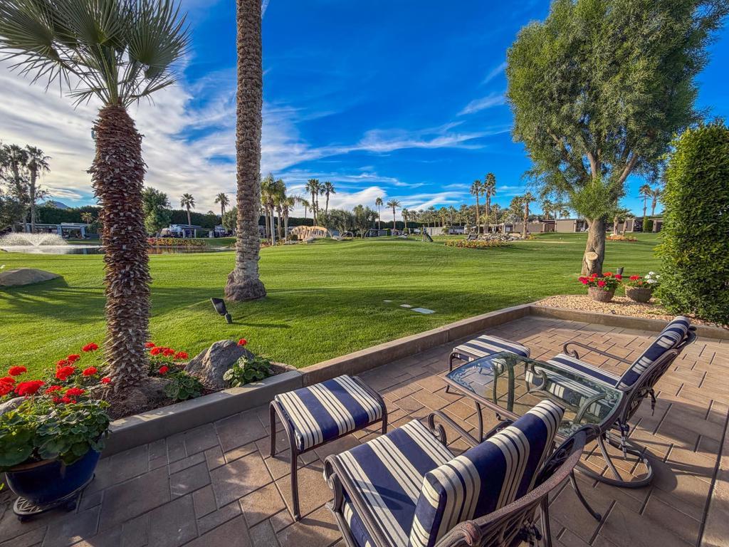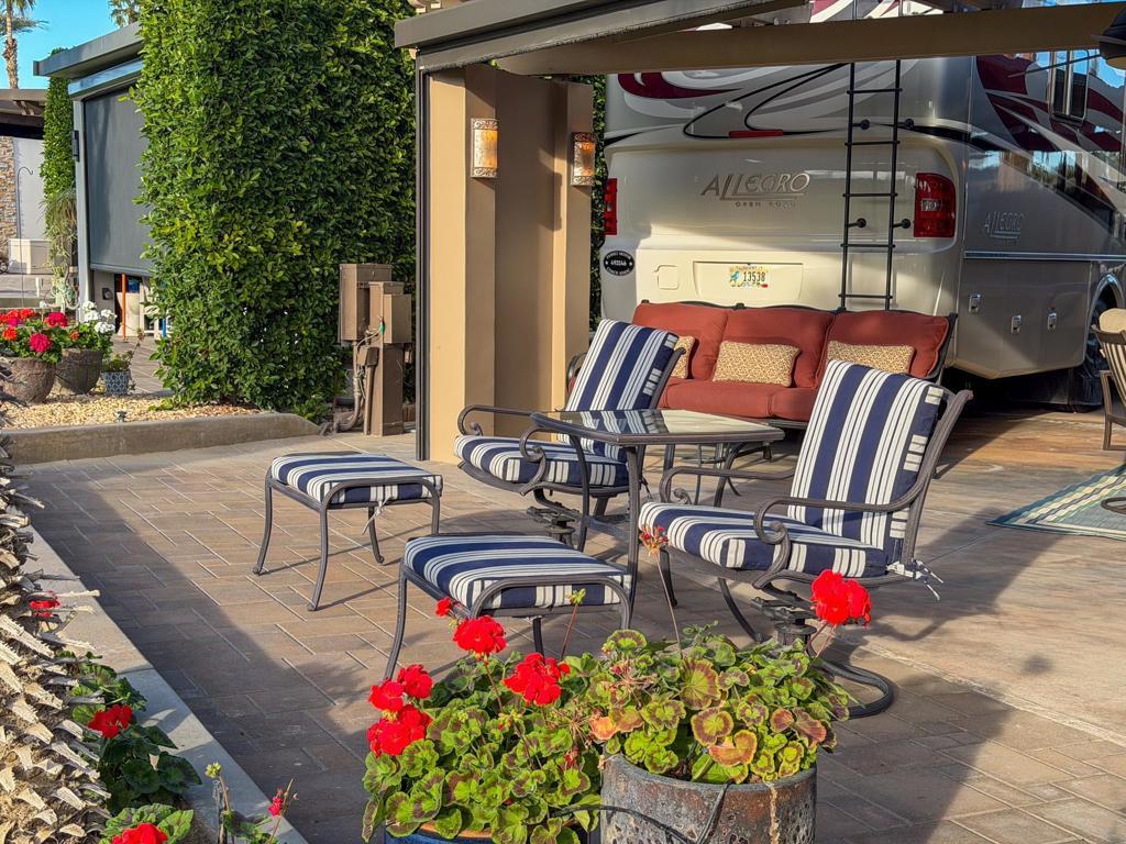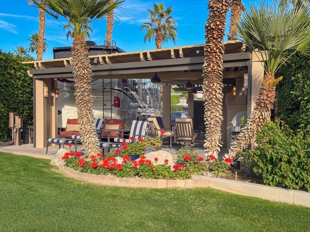 Tucked behind privacy hedges and a landscaped wall, this private, lot opens dramatically to sweeping views of the golf course, shimmering lakes, waterfalls, fountains, and the Santa Rosa Mountains beyond. It's a scene you'll never tire of--especially from the comfort of your 8-seat outdoor lounge and dining area.The centerpiece of the lot is a large L-shaped Alumawood pergola, thoughtfully designed for both entertaining and relaxation. It features three ceiling fans, four ceiling heaters, drop lights, sconces, and a built-in entertainment center with a protective roll-down cover for your TV. Whether it's morning coffee or sunset cocktails, this space delivers year-round comfort and ambiance.The expansive kitchen includes a kitchen island with a built-in bar (seating for four), full-size fridge, pantry, and BBQ--ideal for everything from quick bites to gourmet gatherings. A landscaped pet-friendly area ensures four-legged guests feel right at home, too.This is more than a lot--it's an extension of your motorcoach lifestyle, designed for those who value space, scenery, and high-end outdoor living.Outdoor Resort Indio is a Class A RV only resort.